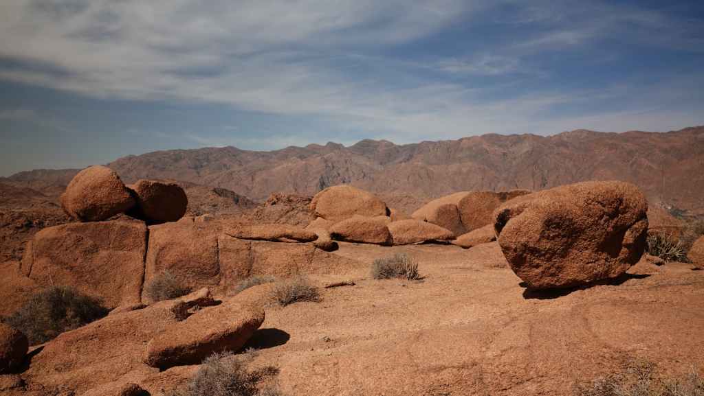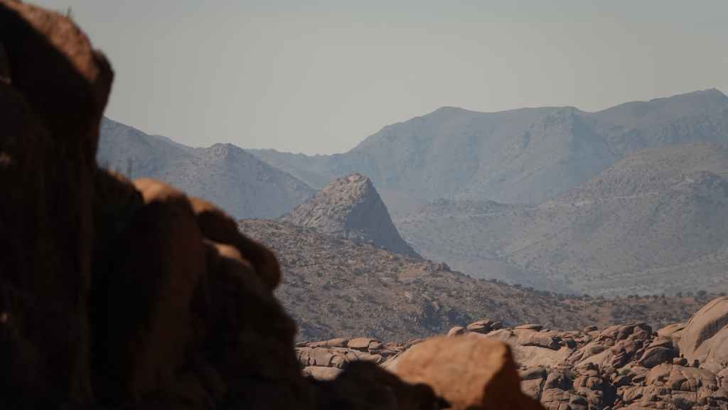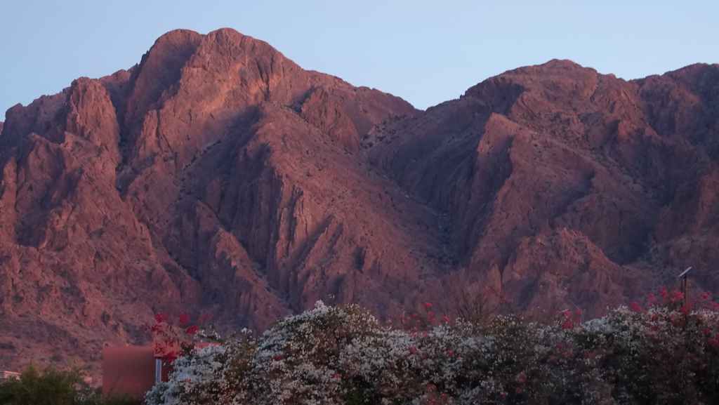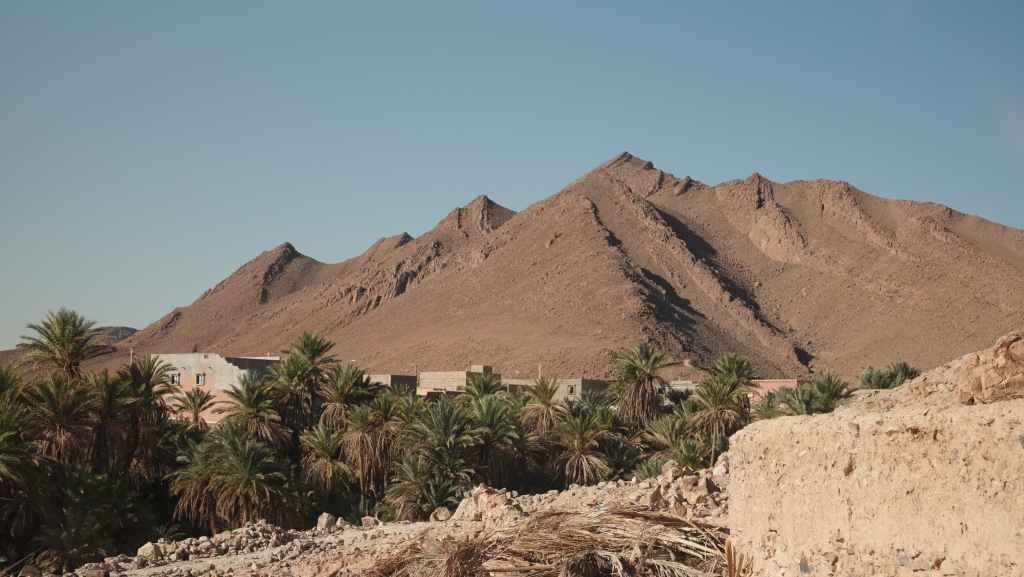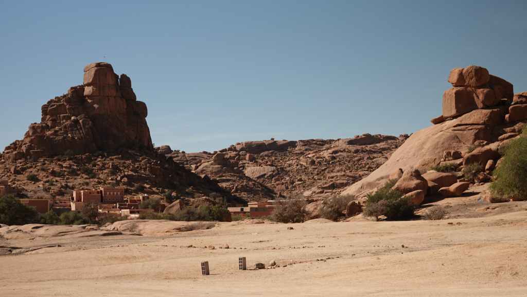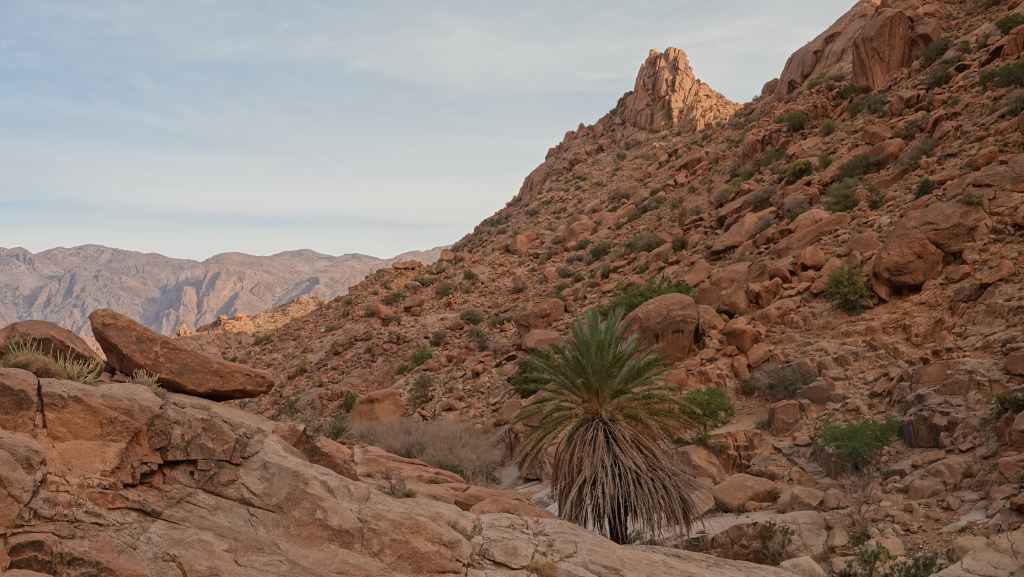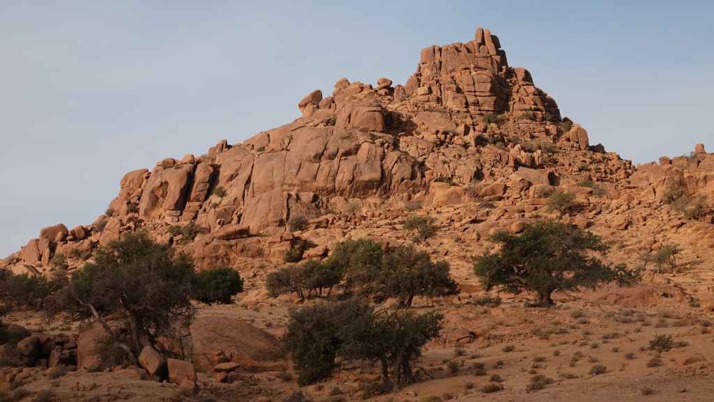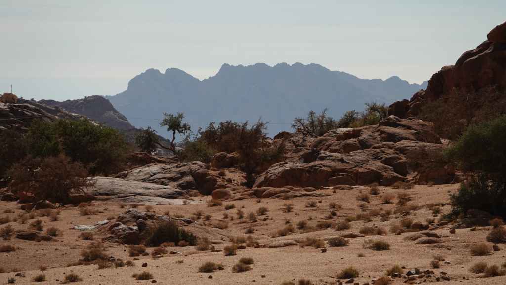 Néanmoins, les paysages que nous traversons sont splendides. Nous arrivons en ville aux travers de palmeraies blotties au pied des montagnes de granite rose, éclairées par le soleil.
