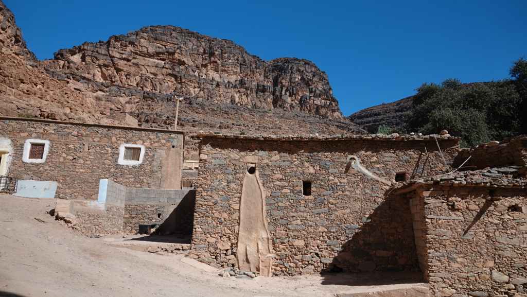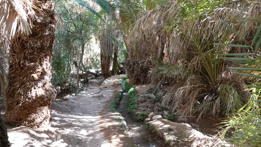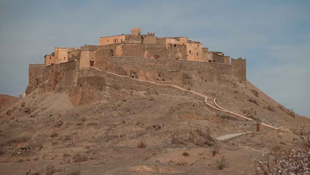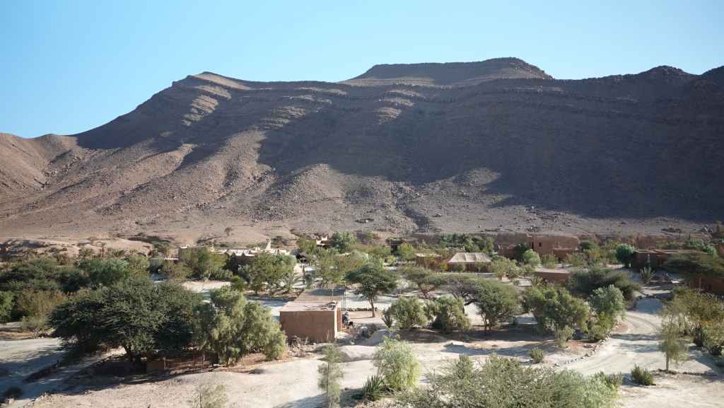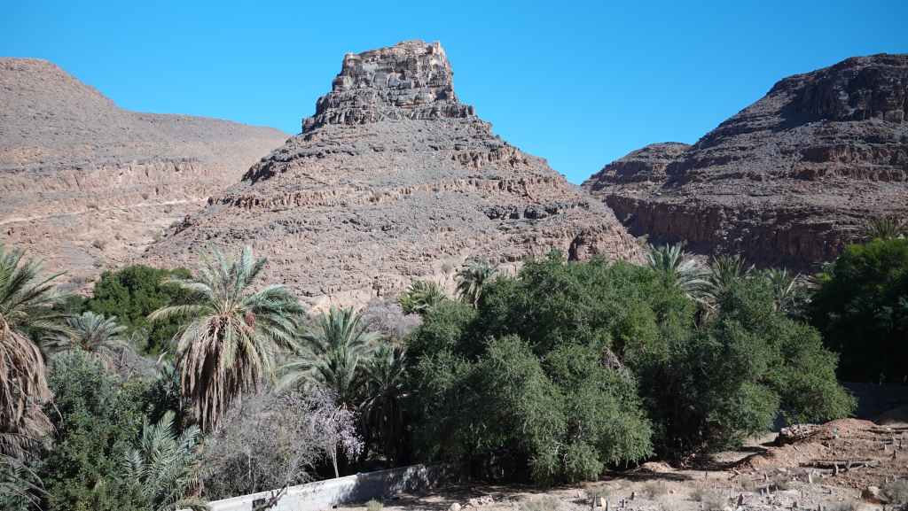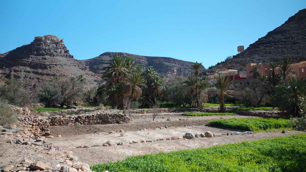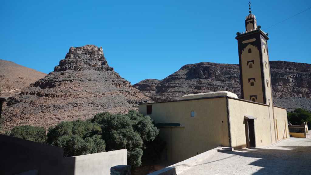 Nous traversons les plantations à l’ombre des palmiers pour remonter au village. En face de nous et sur un piton rocheux, nous apercevons un magnifique agadir : il s’agit d’un « grenier fort communautaire » où les habitants abritaient leurs richesses. Ils s’y réfugiaient également lors d’attaques ennemies. Celui-ci daterait du XIème siècle.