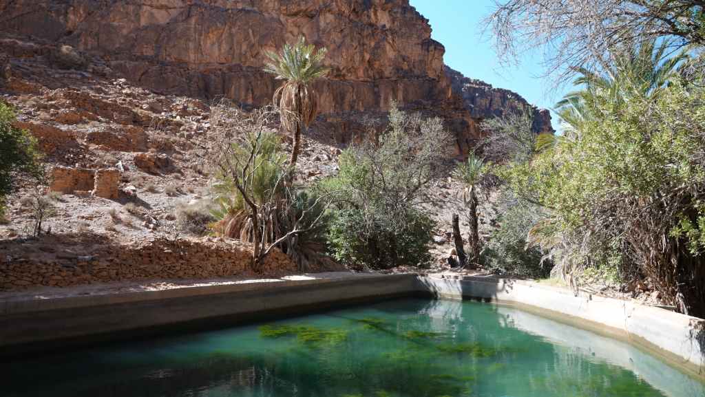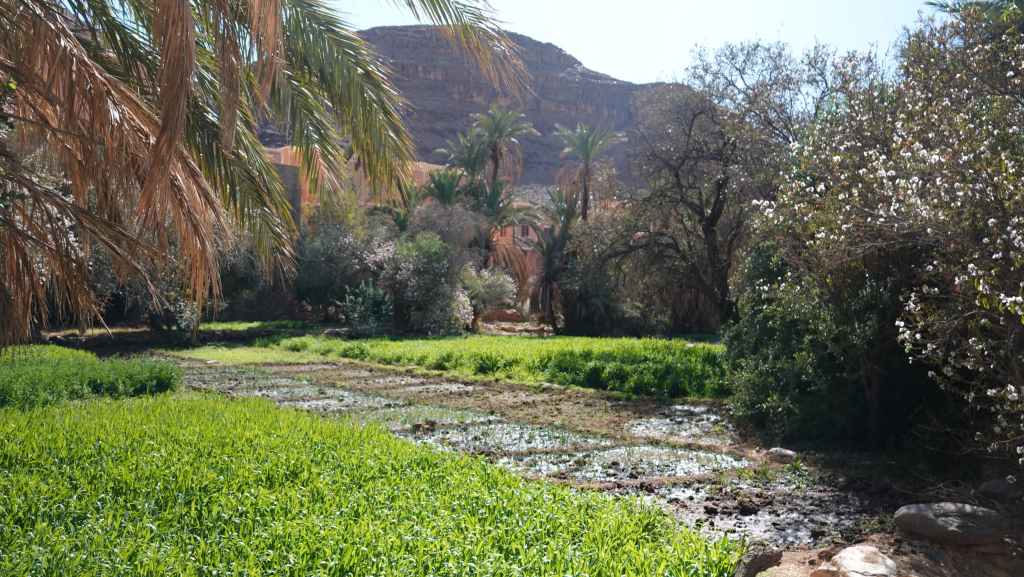 Nous n’avons malheureusement pas le temps de monter le visiter. Après la première partie du village, nous entrons dans les gorges aux hautes falaises verticales d’une jolie couleur ocre. Le contraste avec la palmeraie est fascinant. Nous passons devant un petit restaurant, l’Oasis Amtoudi, à la terrasse ensoleillée et aux murs bleus, où nous réservons un couscous. Il faut compter 1h20 d’attente pour la préparation, alors nous nous enfonçons un peu plus dans le canyon.