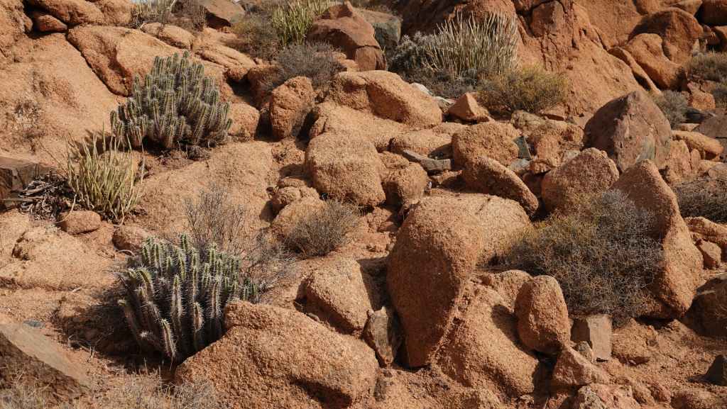 Aujourd’hui, c’est jour de randonnée. Nous rejoignons Tafraout pour acheter à manger pour le pique-nique du midi. Une boutique pour le casse-croûte et une autre boutique pour les fruits et légumes. Il est aux alentours de 9h00 et la ville est très calme. Nous prenons la direction du sud de la ville sur la R107, traversons Aguerd Odad et stoppons au bord d’une petite route au cœur des rochers rouges.