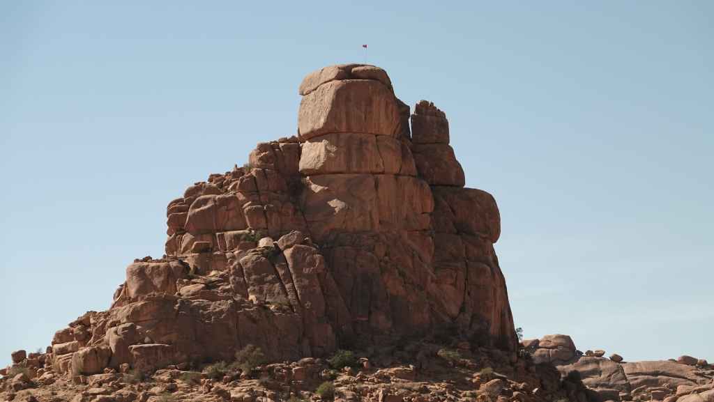 Le chemin passe à côté de son camp de toile. Notre but serait de rejoindre le Mont Almacor culminant à 1680 m mais notre condition physique et le chemin difficile ne nous le permettent pas. Nous stoppons pour pique-niquer vers 1260 m : la vue sur Tafraout et les couleurs des paysages sont magnifiques.