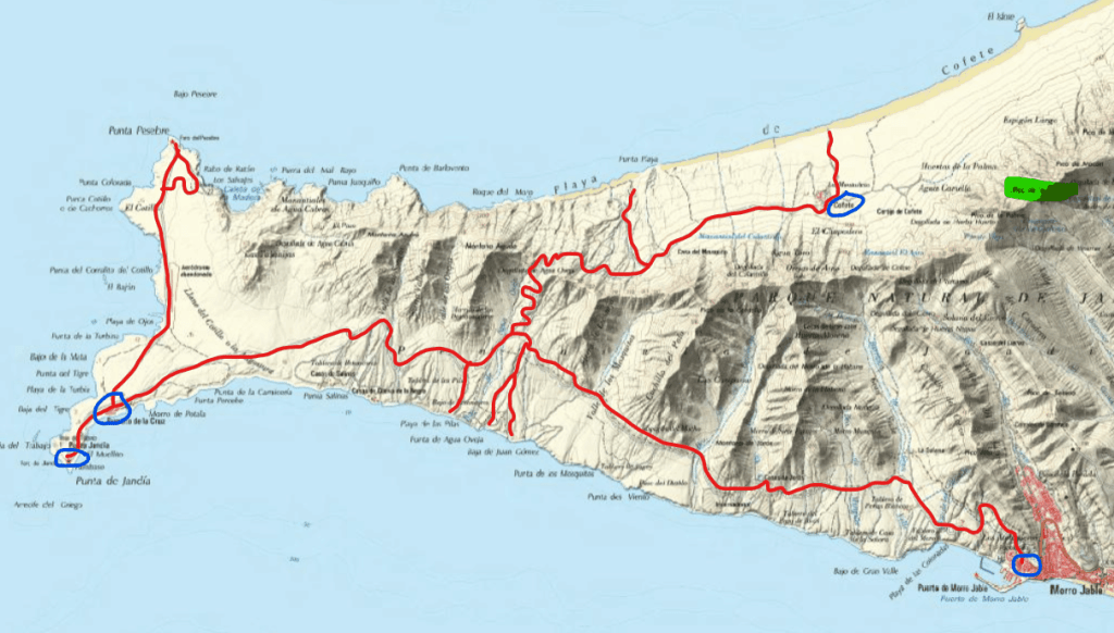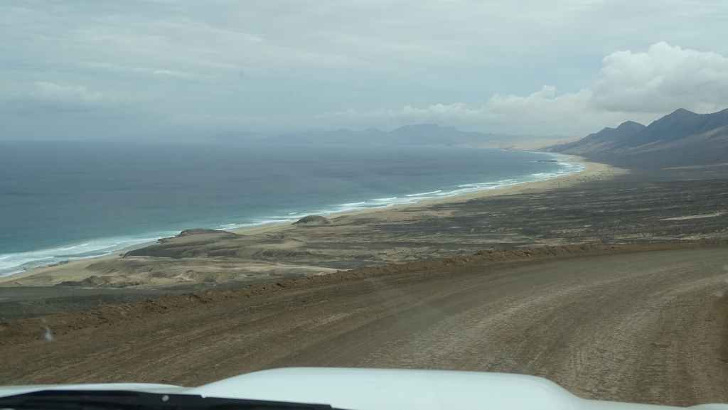 Puis nous nous roulons plein nord, jusqu’à la Punta Pesebre et ensuite retour en direction de Morro Jable en faisant quelques détours vers la mer, sur de petites pistes perpendiculaires. Au retour, nous déposons notre 4×4 au garage Soto puis repartons vers le nord. La nuit et proche, alors nous décidons de retourner dormir au parking de la plage Esmeralda.