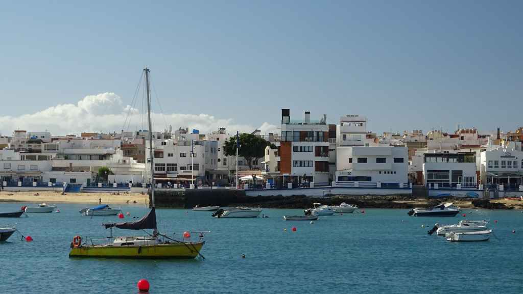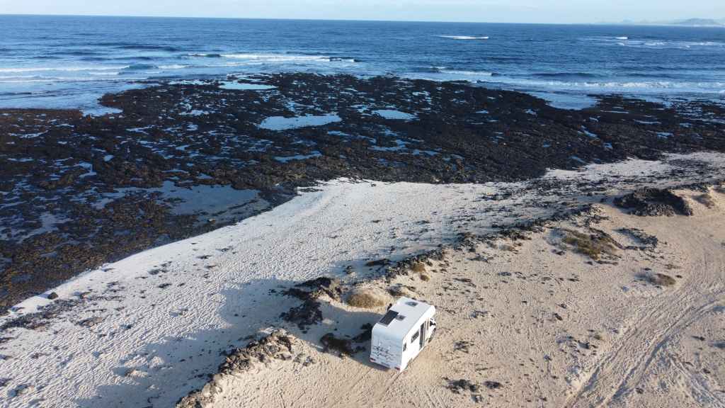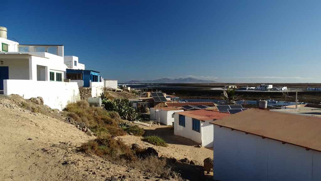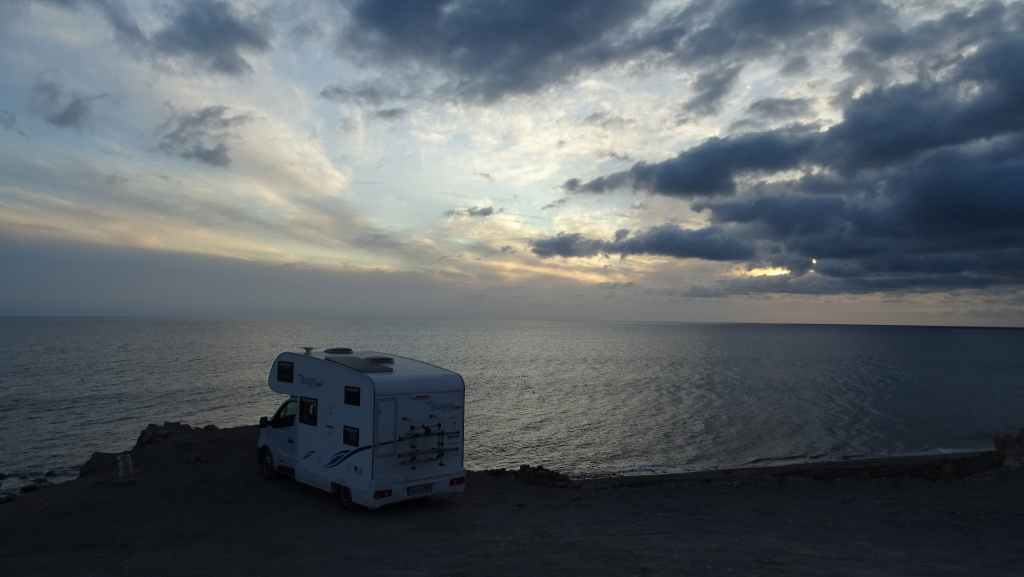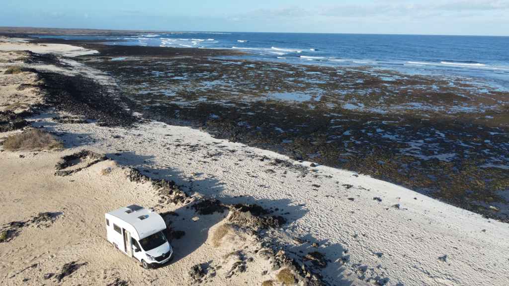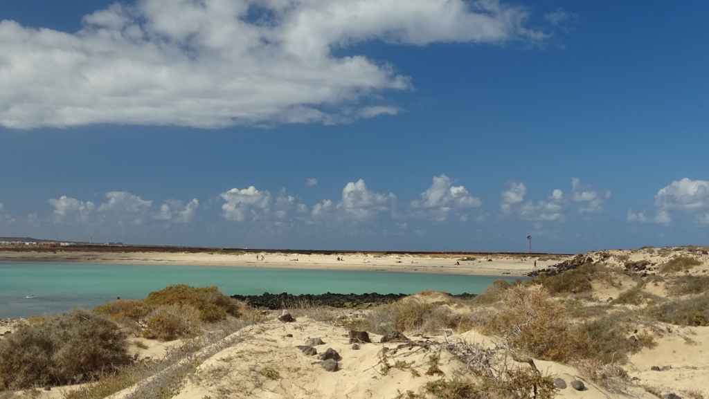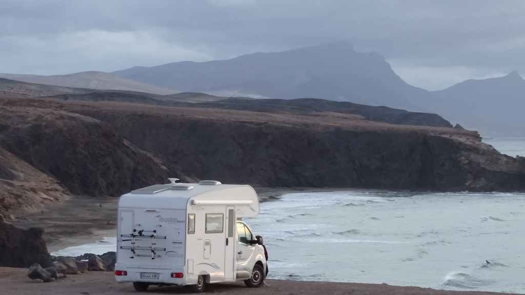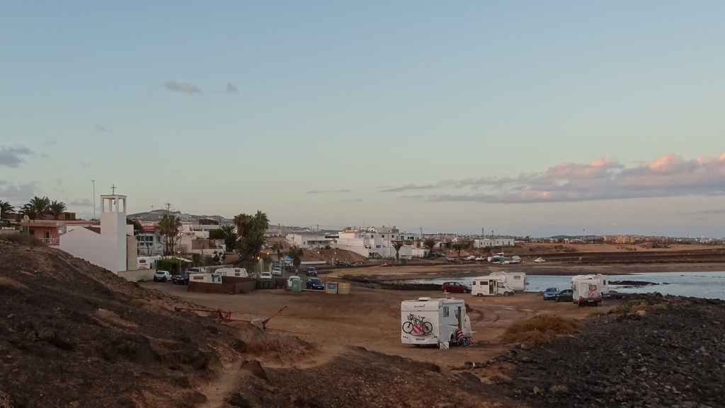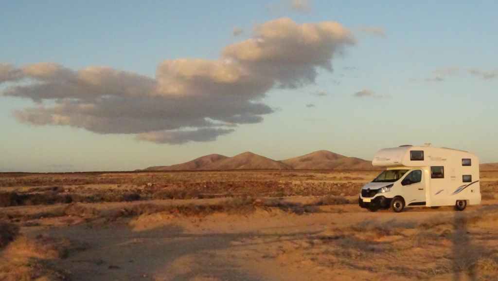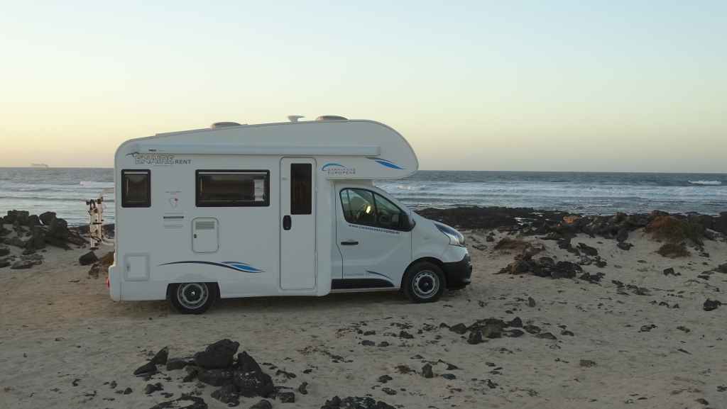 Le loueur de camping-car (CC) se situe à environ 15 mn de l’aéroport, de l’autre côté de l’autoroute. Mercedes (non, pas la marque du véhicule) nous accueille en anglais. Après les paperasses et des explications sur le fonctionnement, on prend la route vers le nord de l’île. Après quelques courses, on passe une première fois au bord du petit désert de dunes avant d’aller pique-niquer à Corralejo. Après une petite visite du port, on décide d’aller bivouaquer au bord de la Playa del Bajo de la Burra, très réputée pour sa couleur blanche.