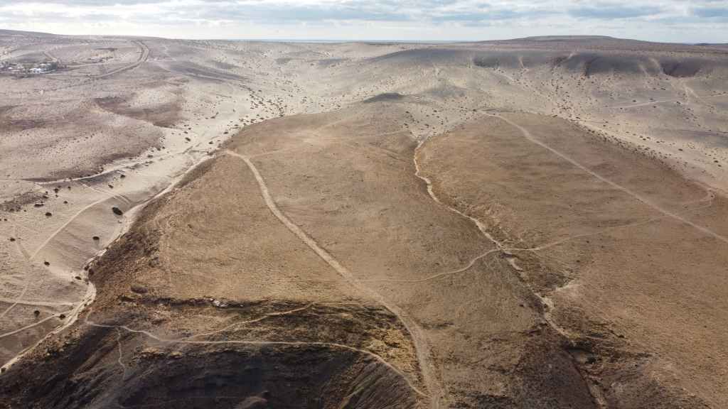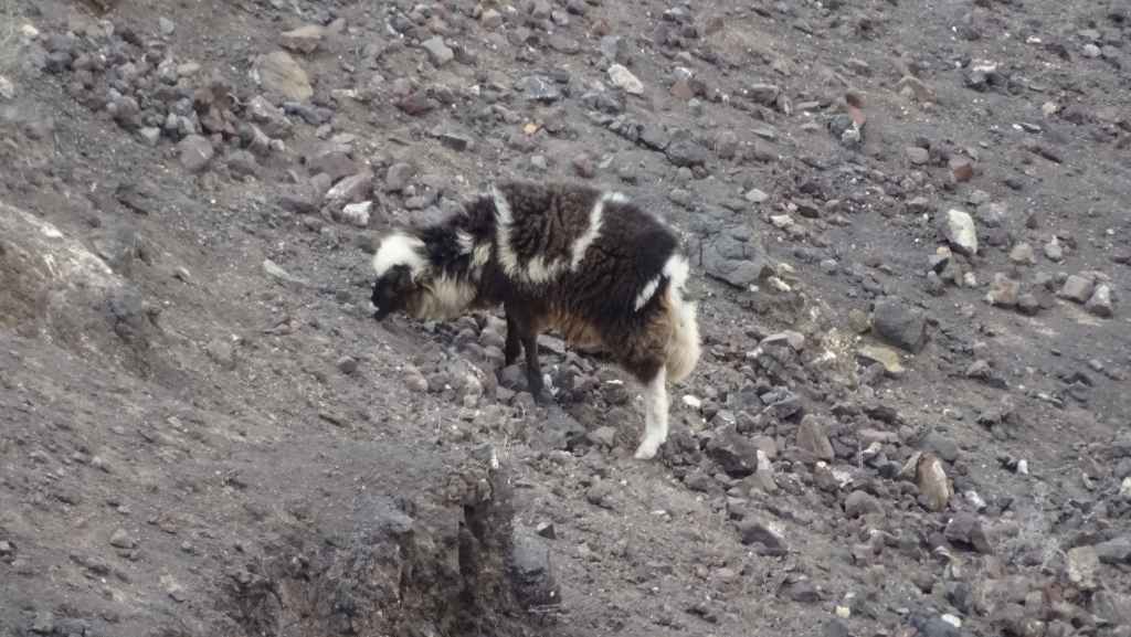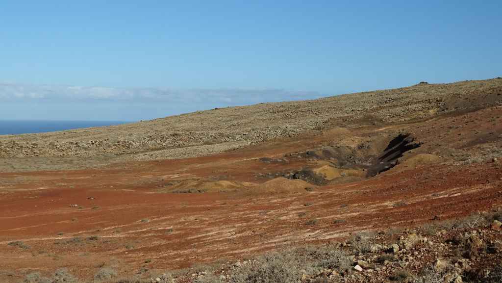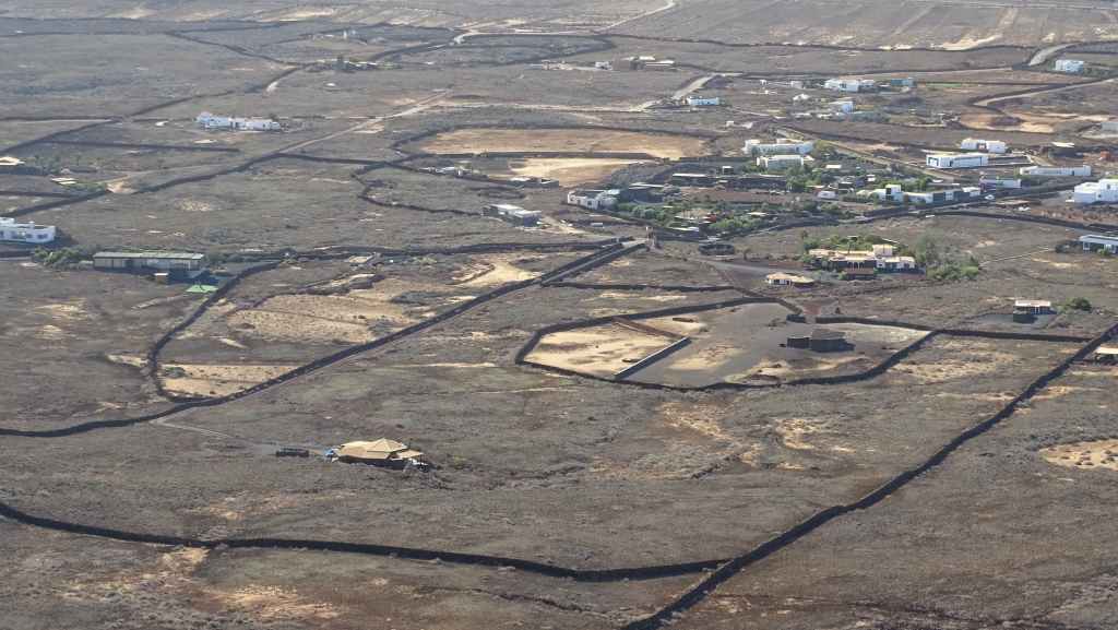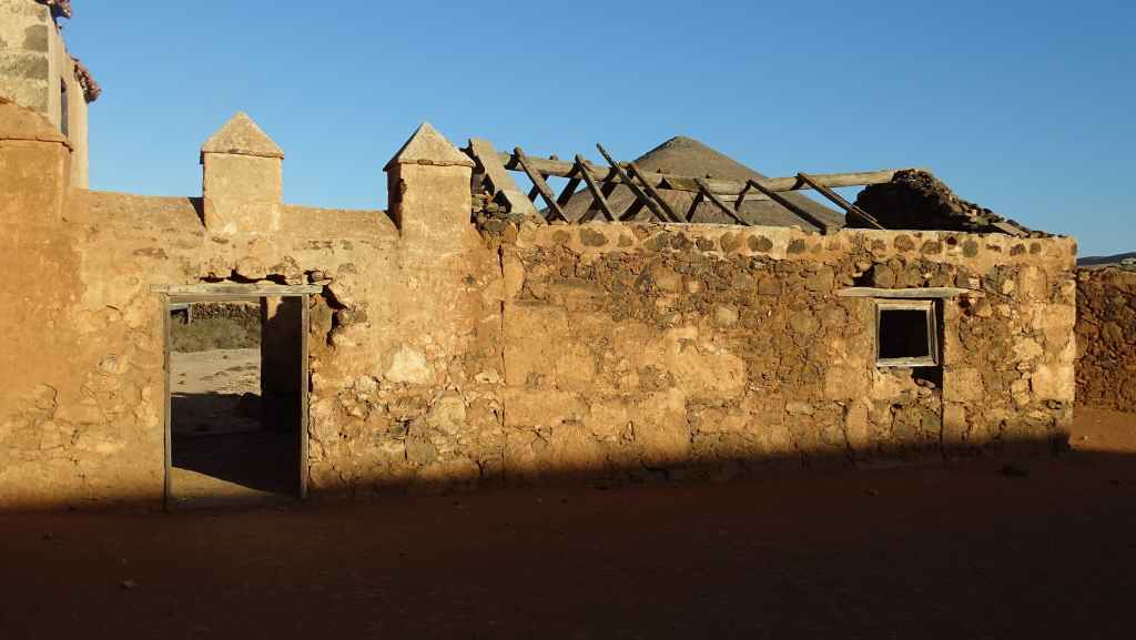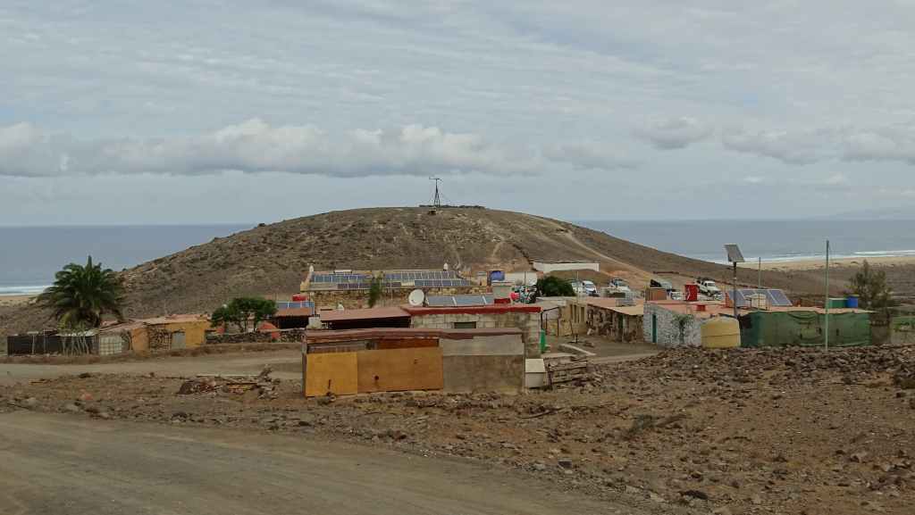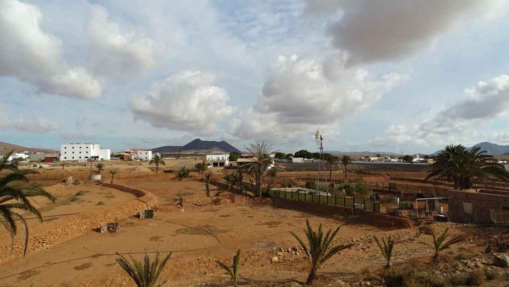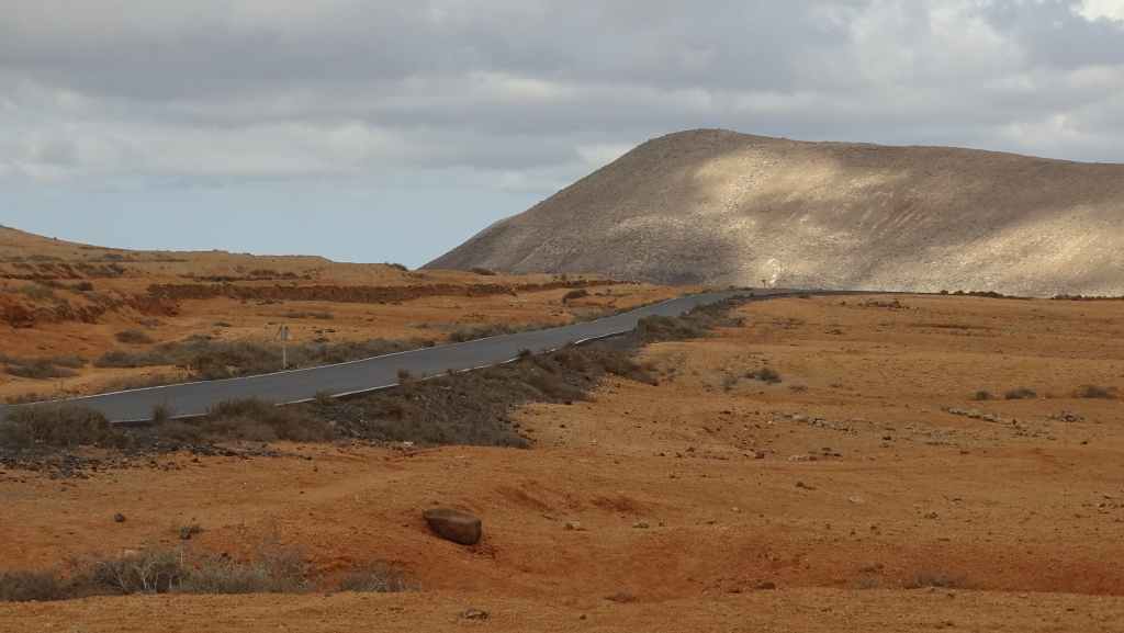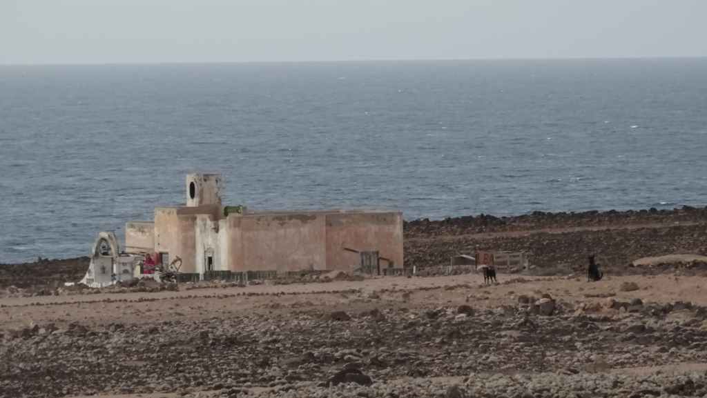 Puis nous traversons Tindaya où nous prenons une très mauvaise route qui nous emmène théoriquement en bord d’océan mais en fait, il s’agit d’un ancien emplacement prévu à l’origine pour la construction d’un lotissement touristique. Au loin, il y a 2 constructions que nous pensions en ruine mais une d’entre parait finalement habitée, au moins par 2 chiens qui donnent de la voix…