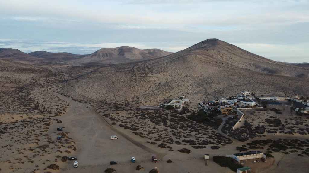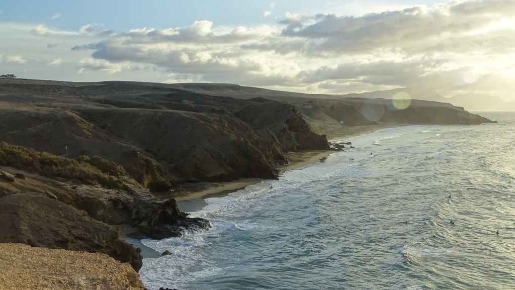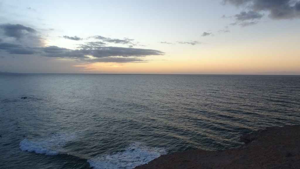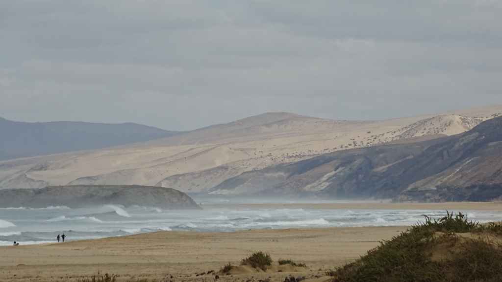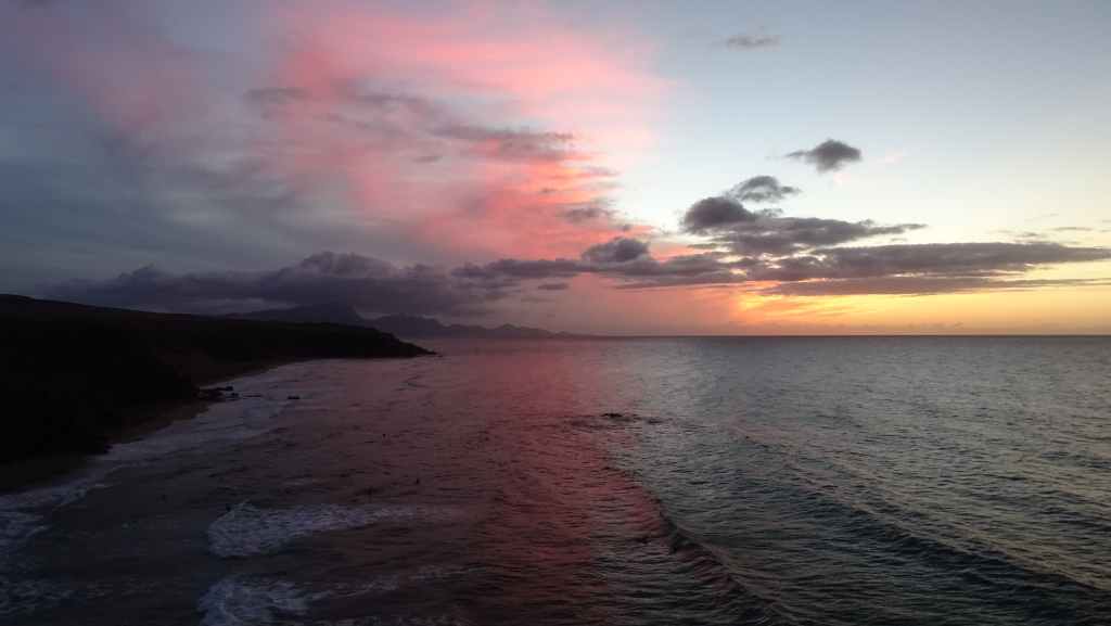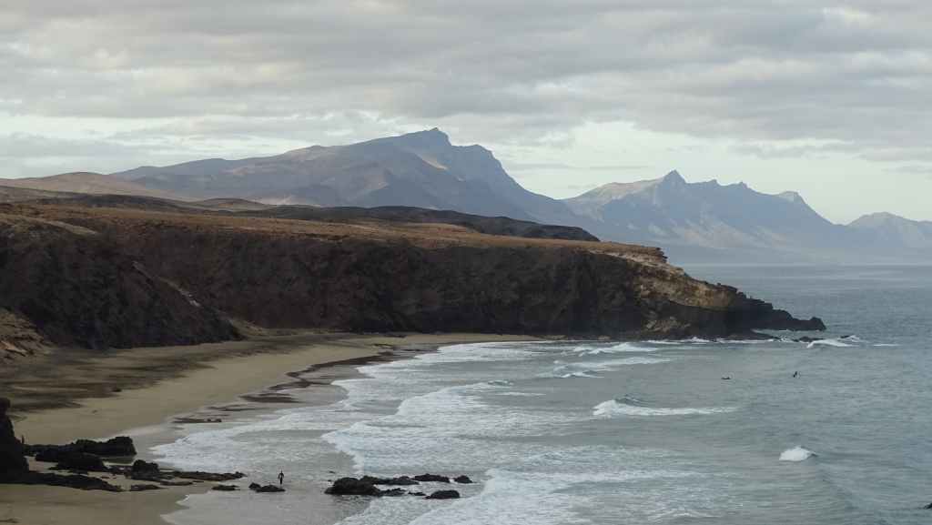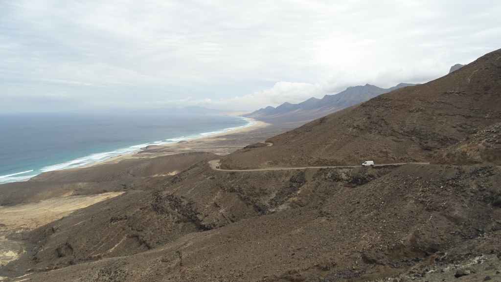 Nous reprenons ensuite la route FV-605 qui traverse de superbes panoramas. Nous rejoignons à pied un sommet qui donne accès à une vue imprenable sur la mer et les montagnes environnantes. Nous rejoignons ensuite La Pared, toujours sur la côte ouest où nous nous posons pour la nuit, avec d’autres camping-cars et vans. C’est un lieu connus des surfeurs et nous les observons à la tomber de la nuit.