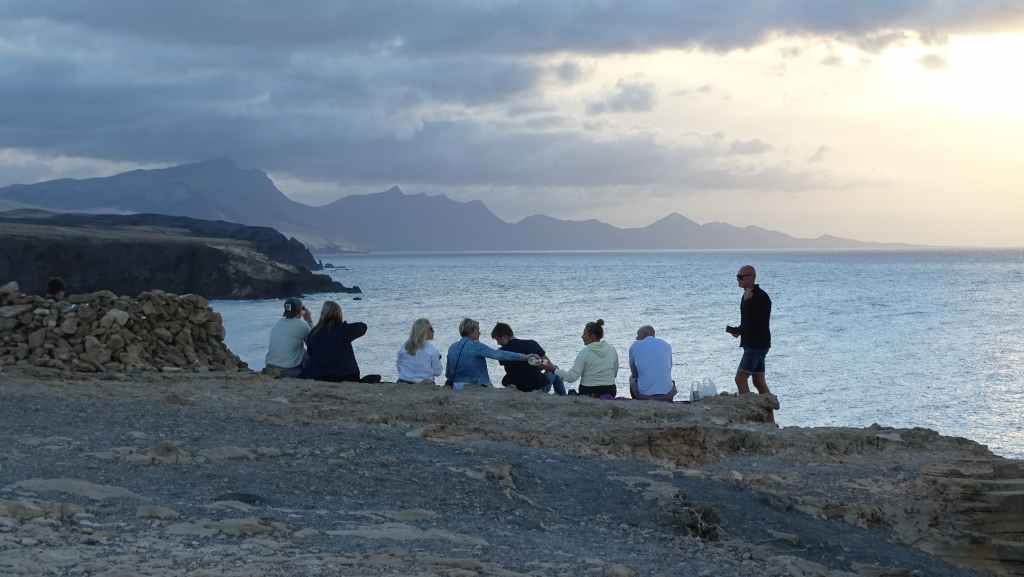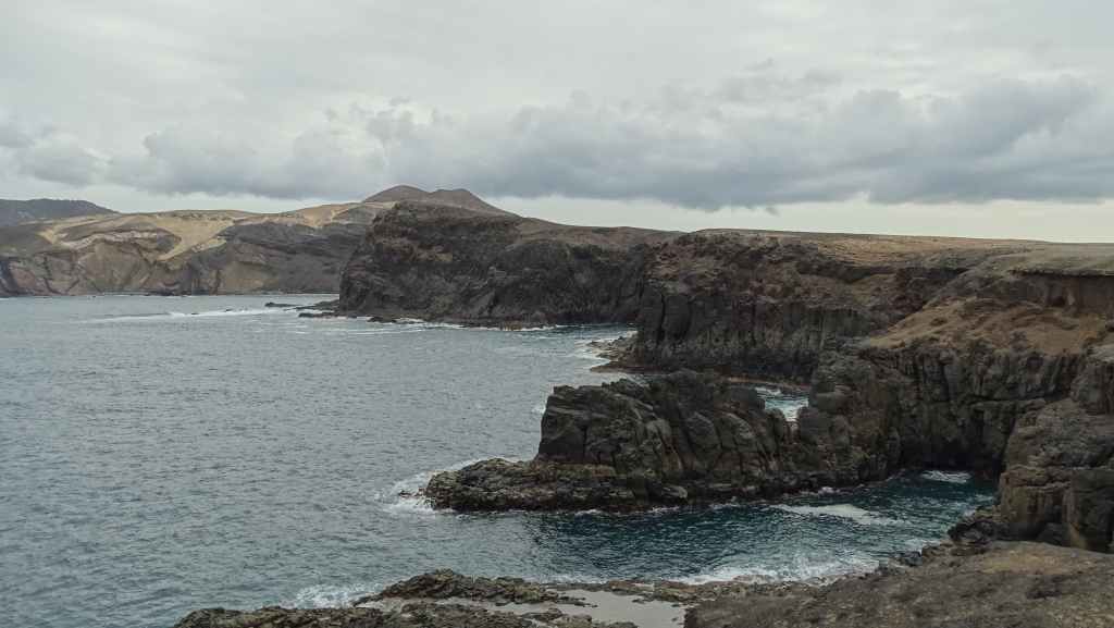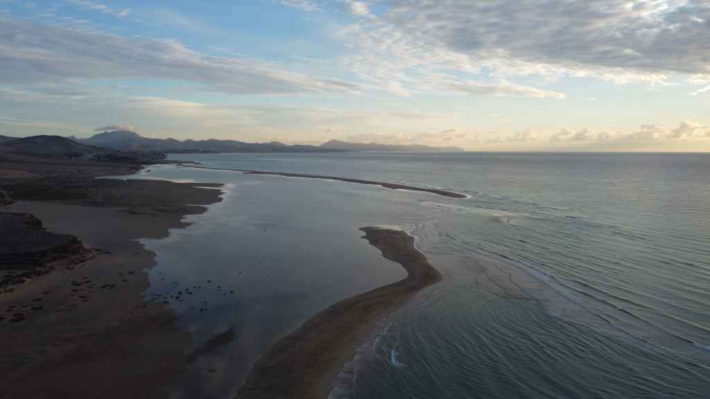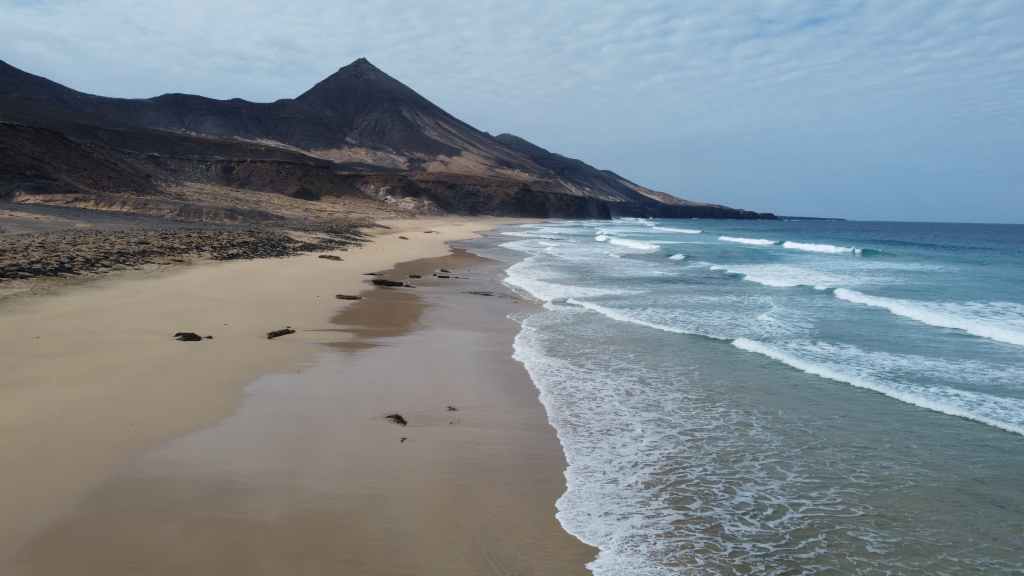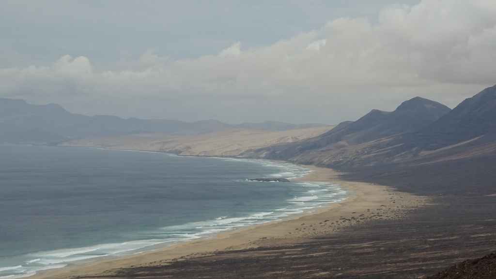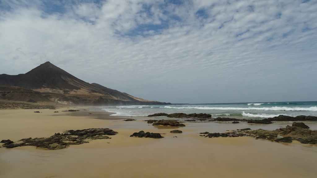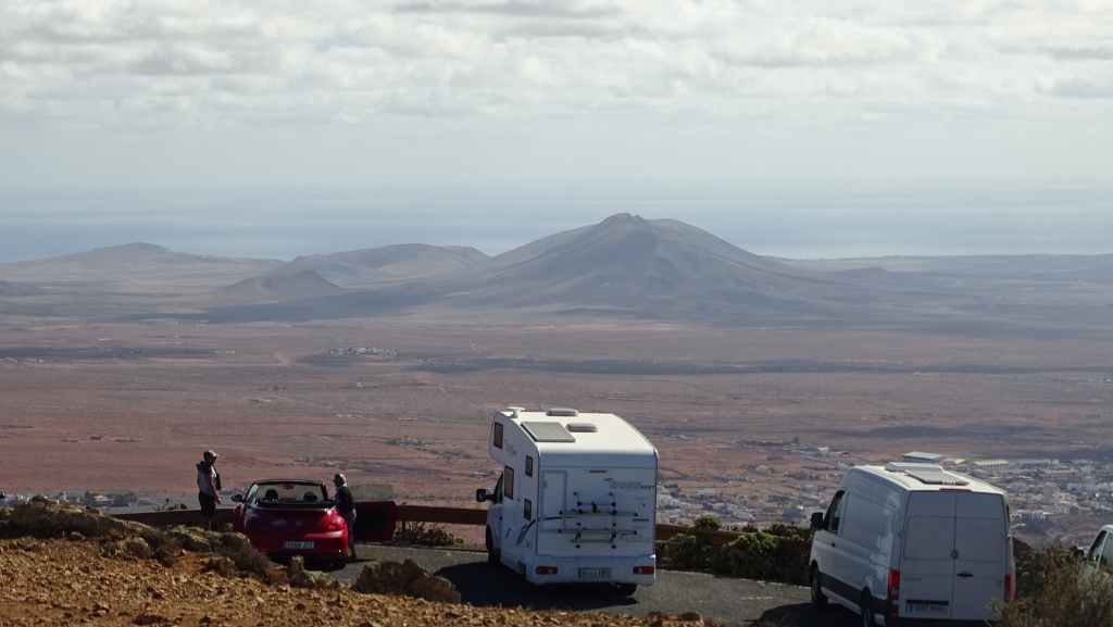 Nous reprenons ensuite la route FV-605 qui traverse de superbes panoramas. Nous rejoignons à pied un sommet qui donne accès à une vue imprenable sur la mer et les montagnes environnantes. Nous rejoignons ensuite La Pared, toujours sur la côte ouest où nous nous posons pour la nuit, avec d’autres camping-cars et vans. C’est un lieu connus des surfeurs et nous les observons à la tomber de la nuit.
