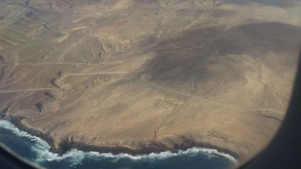 Le lever est très matinal. Avant de partir, nous faisons le ménage à l’intérieur et reprenons la route. A l’heure prévue, nous entrons dans le parc de l’agence où personne ne nous attend. On vide les cuves du CC, on sort nos valises et on retourne à l’aéroport à pied, sur la piste poussiéreuse. A notre arrivée, l’embarquement prend un peu de temps car les imprimantes ne fonctionnent pas ! Et donc impossible d’étiqueter les bagages de soute… Malgré tout, le décollage se fait presqu’à l’heure.