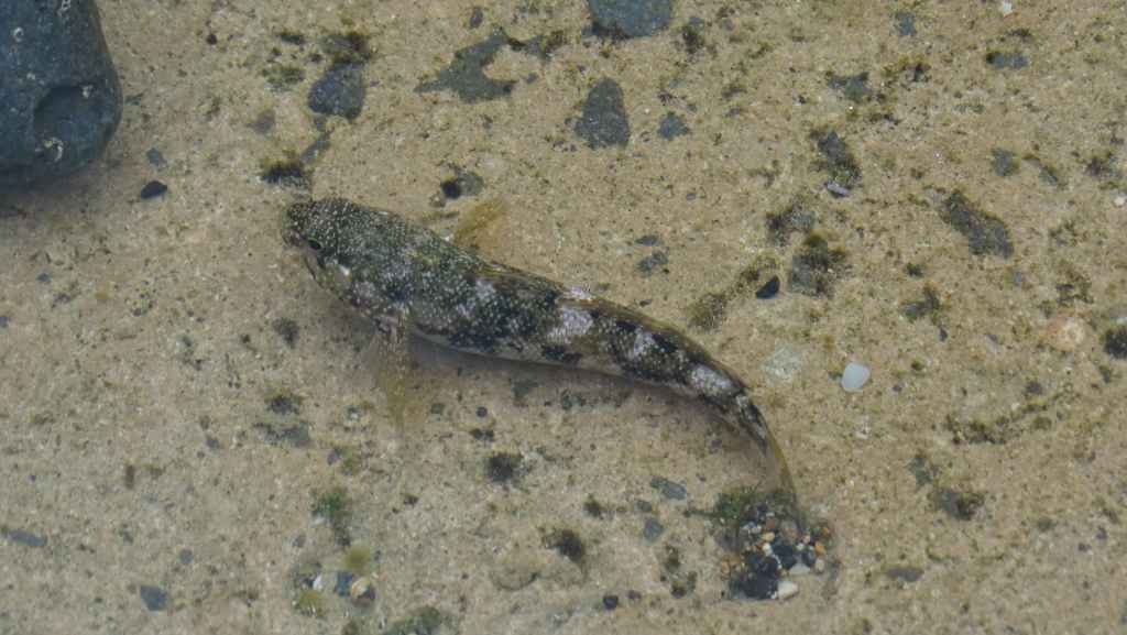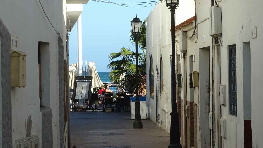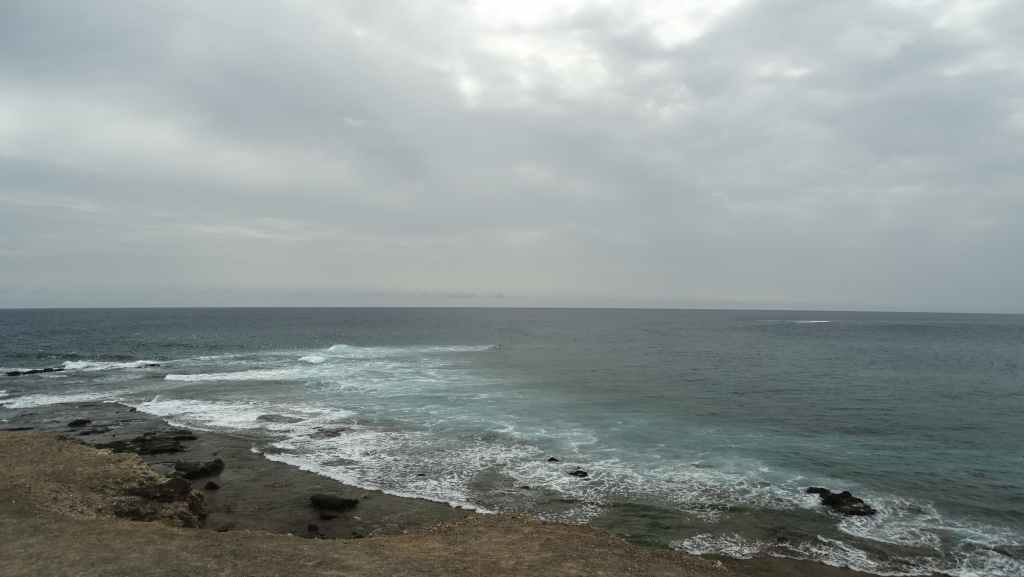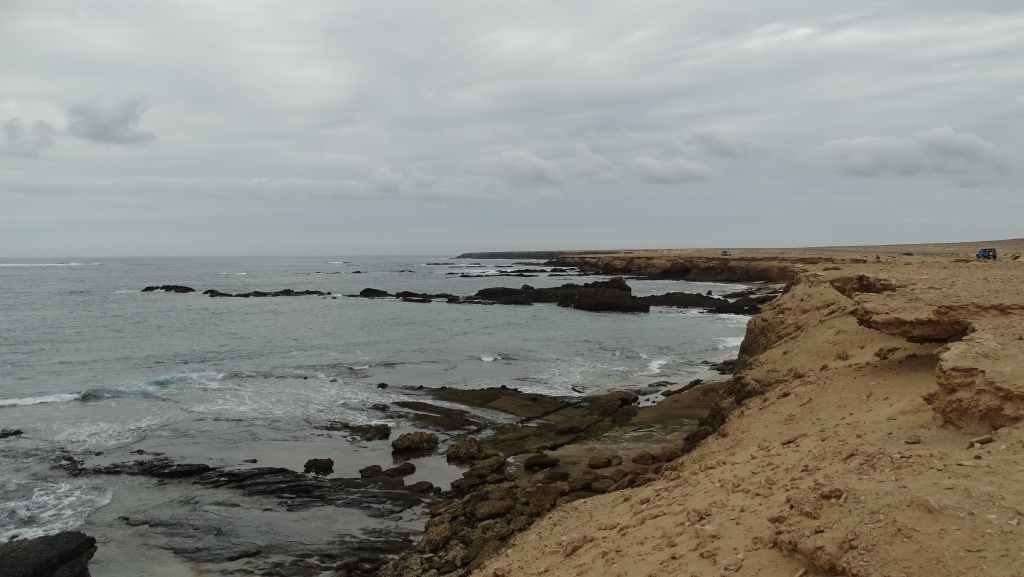 Nous faisons la pause déjeuner en bord d’océan, près de la plage de El Perchel, après avoir parcouru quelques centaines de mètres de piste. Quelques petits poissons barbottent dans de mini-piscines d’eau de mer, en attendant une prochaine grande marée.