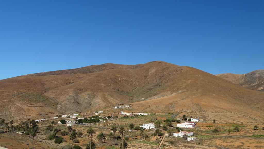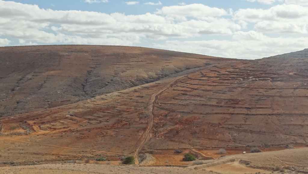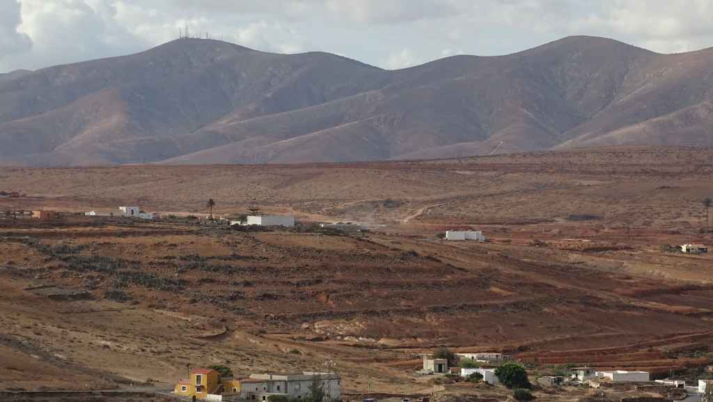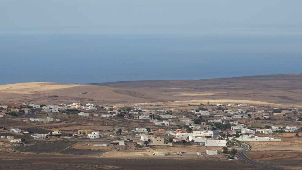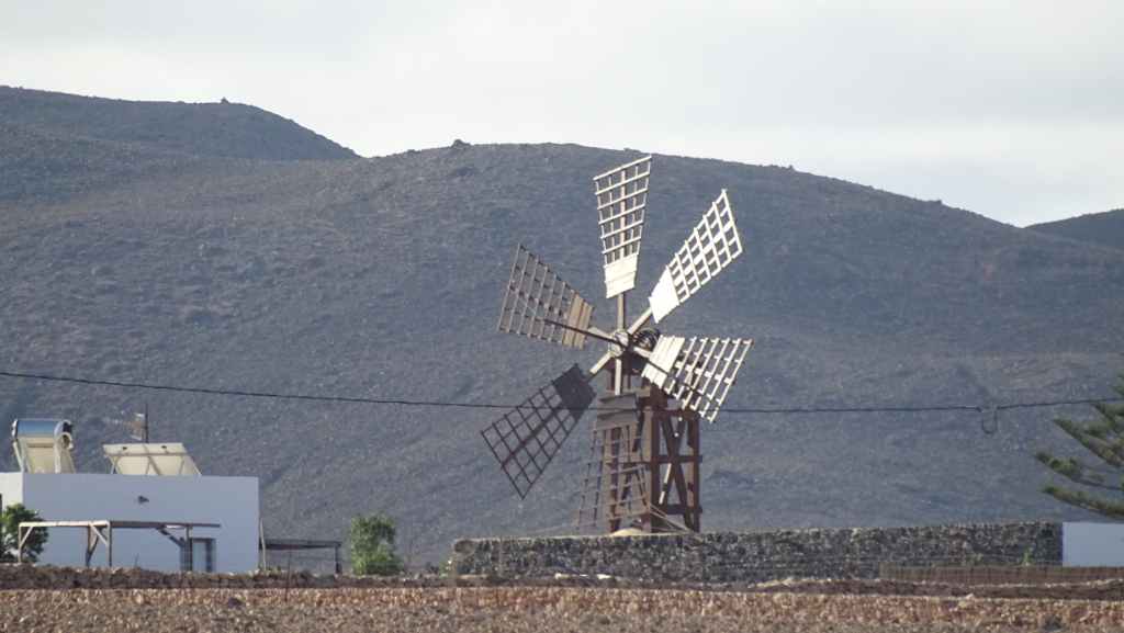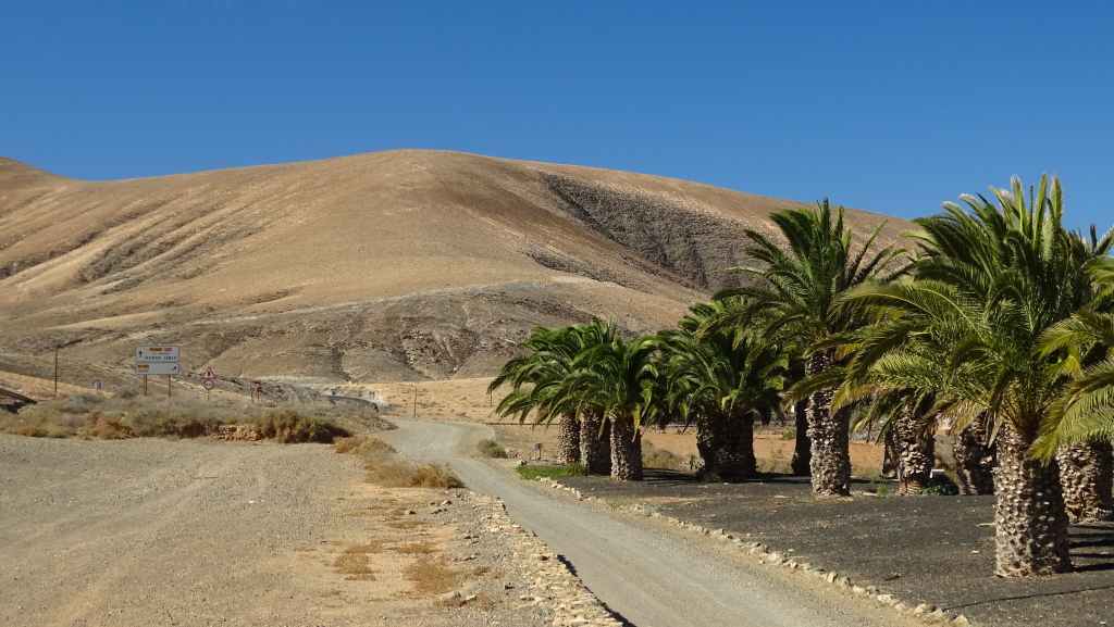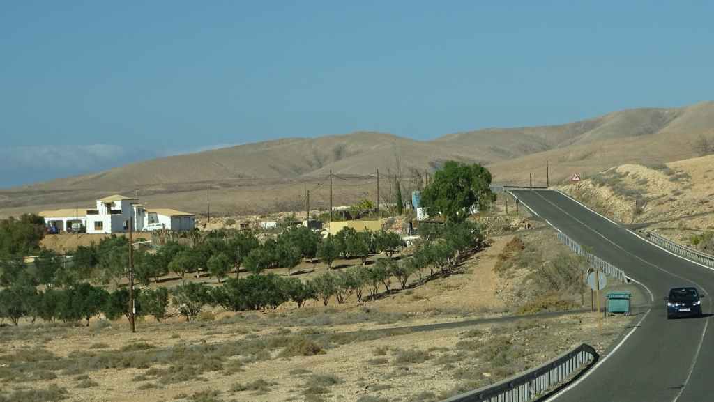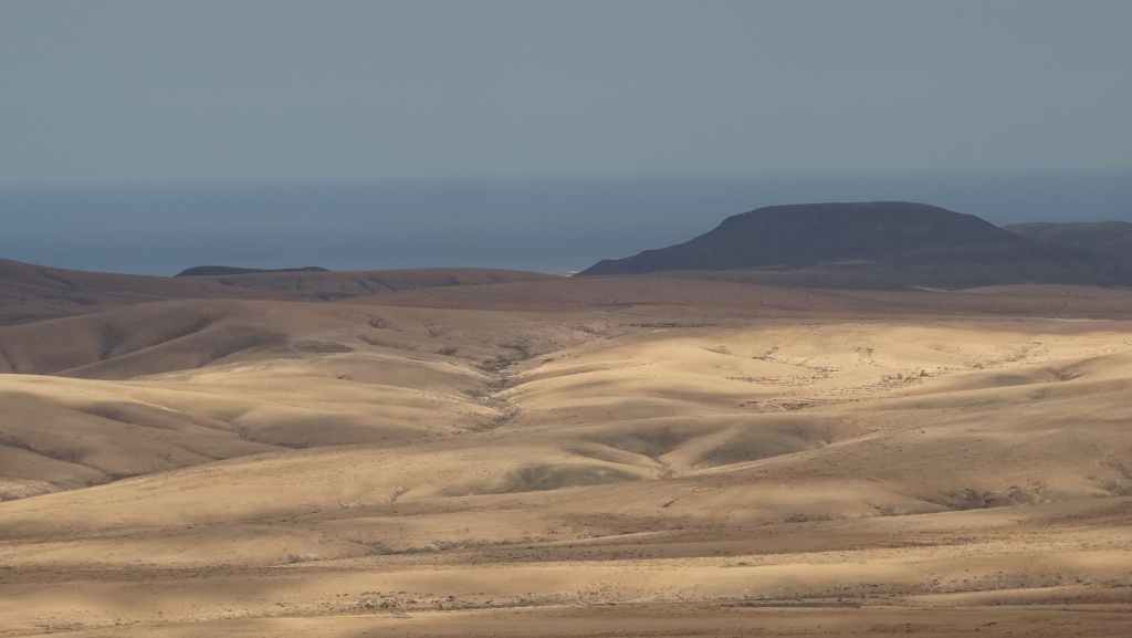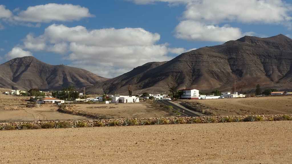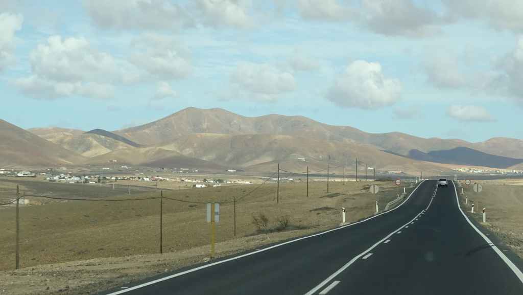 Aujourd’hui, nous repartons plein nord en direction de Corralejo, mais en prenant bien notre temps. Après un petit tour sur cette magnifique plage, nous remontons dans notre maison ambulante pour prendre la FV-2 puis la FV-20 avec un nouveau passage à Antigua. Nous nous arrêtons à Casillas del Angel pour visiter le centre ancien du village et son église Ste Anne, toute blanche mais à la façade noire faite de pierres basaltiques. Nous passons par Tetir, puis au niveau de Tindaya, nous grimpons une petite route sinueuse, la FV-103, qui nous mène à un joli belvédère avec vue sur les paysages désertiques de la côte ouest de l’île. Nous longeons une jolie vallée agricole où se baladent quelques chèvres puis plongeons… doucement… vers la côte est.
