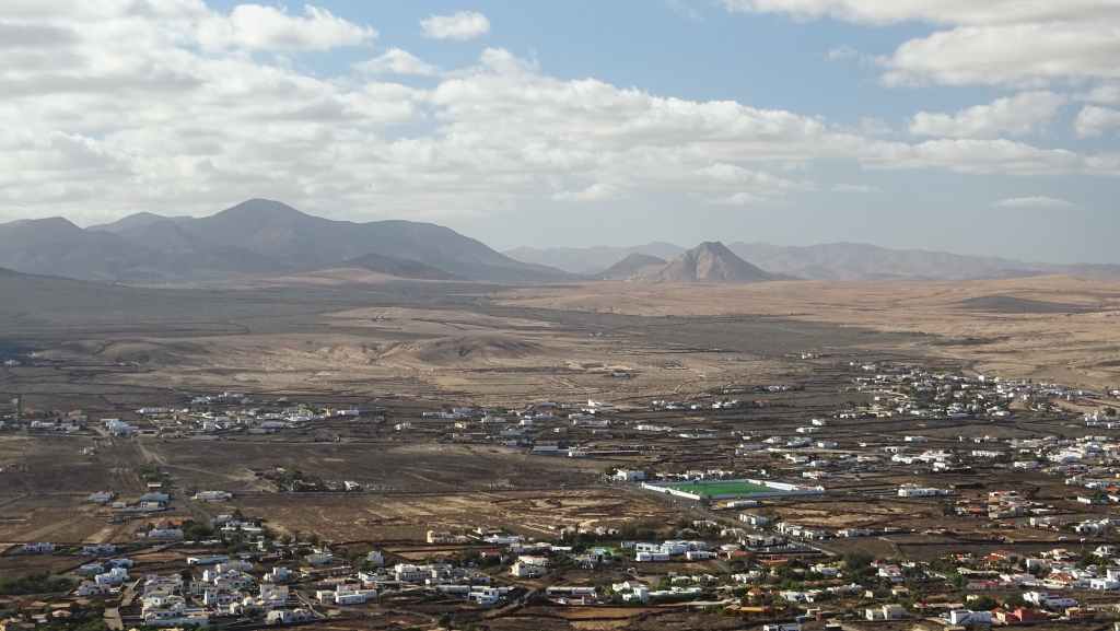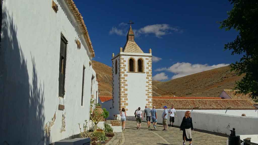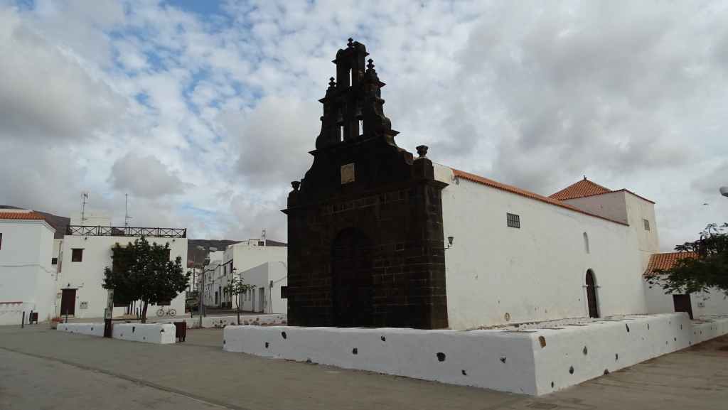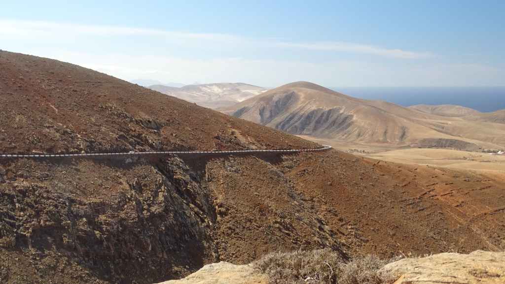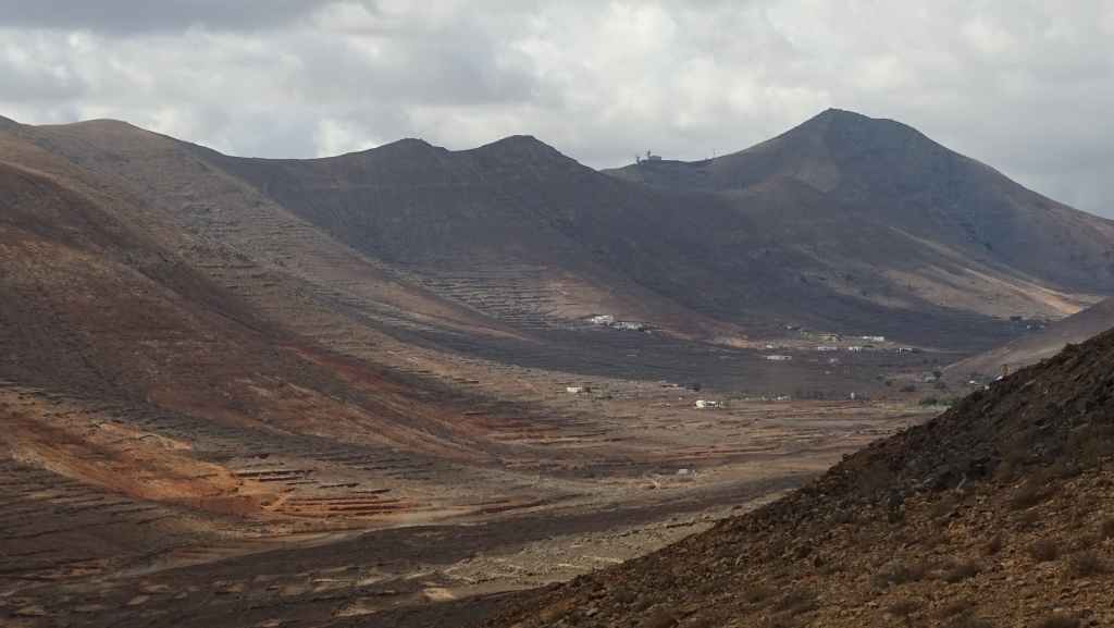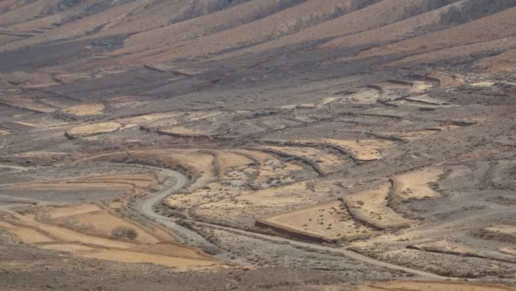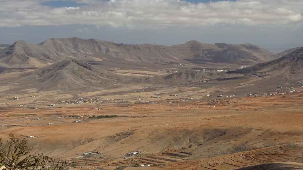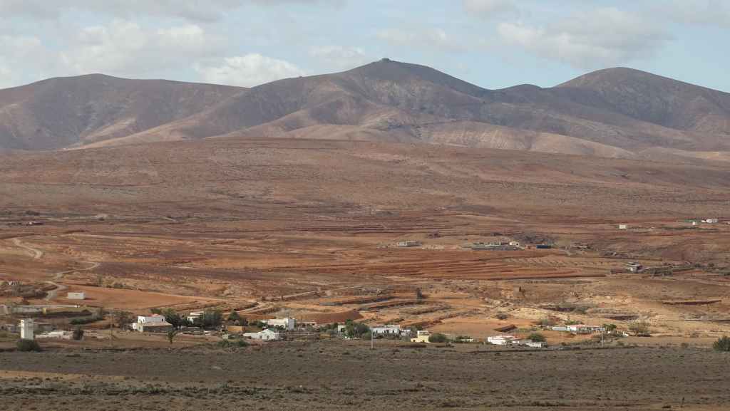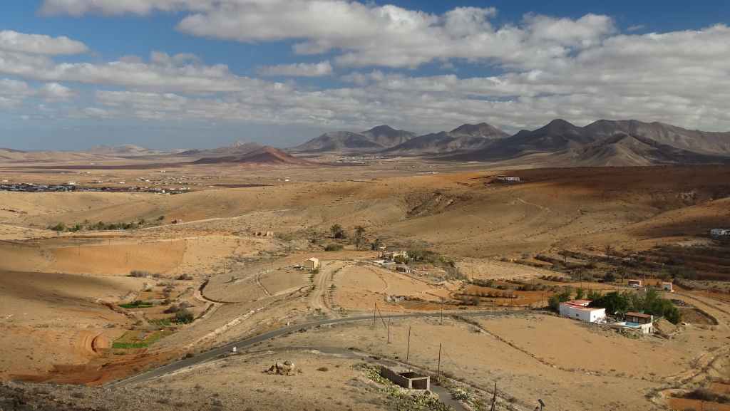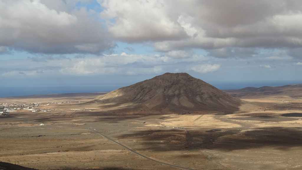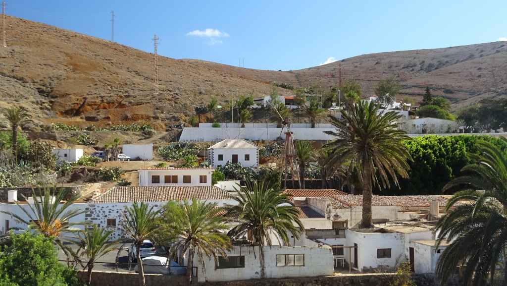 Aujourd’hui, nous repartons plein nord en direction de Corralejo, mais en prenant bien notre temps. Après un petit tour sur cette magnifique plage, nous remontons dans notre maison ambulante pour prendre la FV-2 puis la FV-20 avec un nouveau passage à Antigua. Nous nous arrêtons à Casillas del Angel pour visiter le centre ancien du village et son église Ste Anne, toute blanche mais à la façade noire faite de pierres basaltiques. Nous passons par Tetir, puis au niveau de Tindaya, nous grimpons une petite route sinueuse, la FV-103, qui nous mène à un joli belvédère avec vue sur les paysages désertiques de la côte ouest de l’île. Nous longeons une jolie vallée agricole où se baladent quelques chèvres puis plongeons… doucement… vers la côte est.