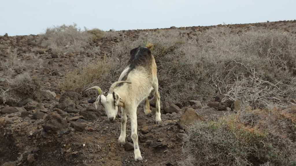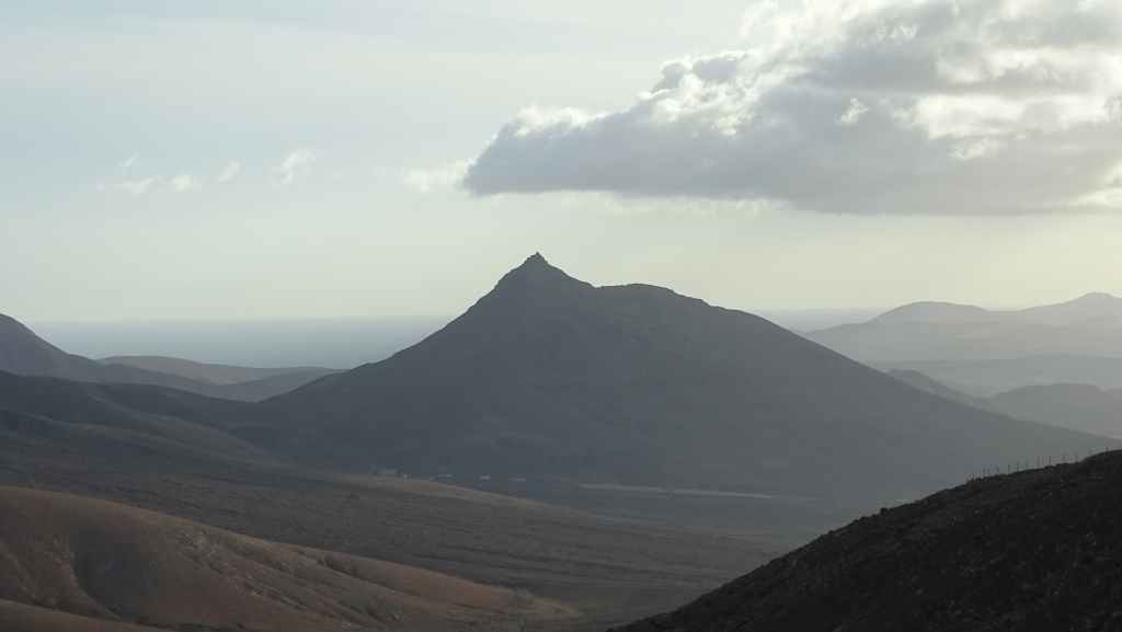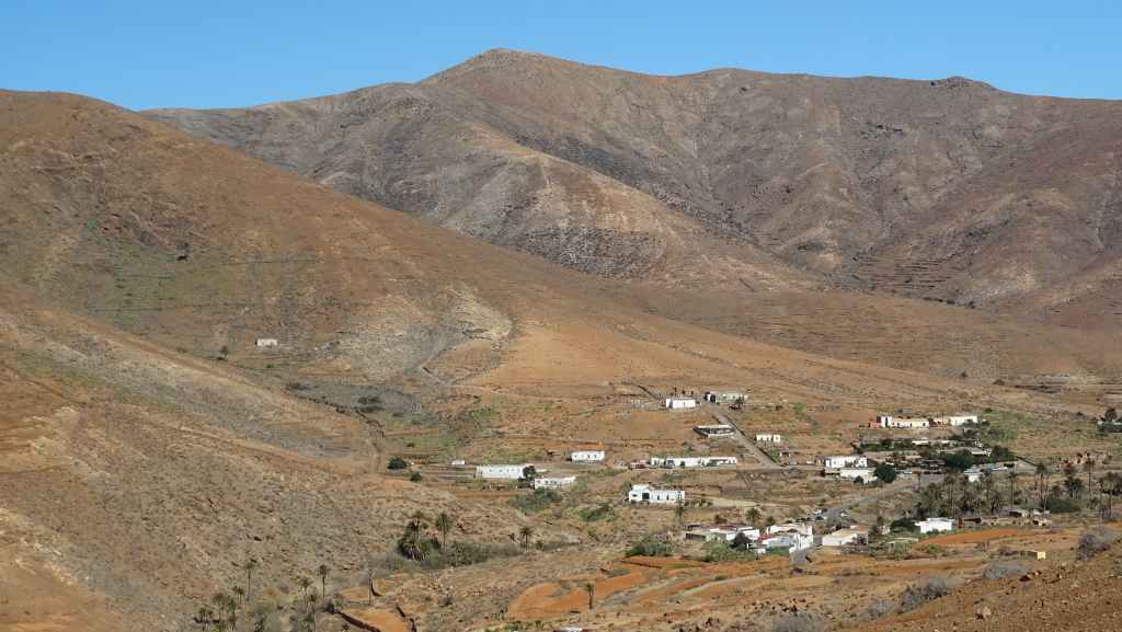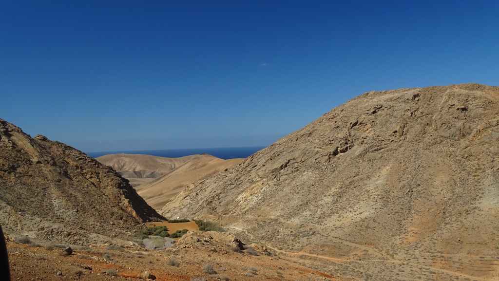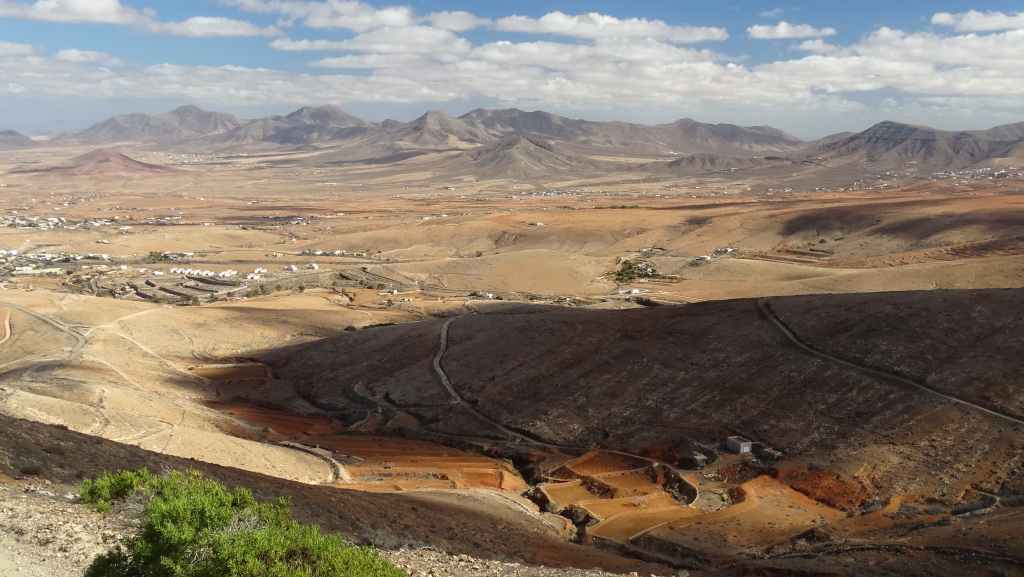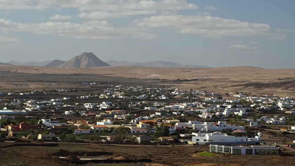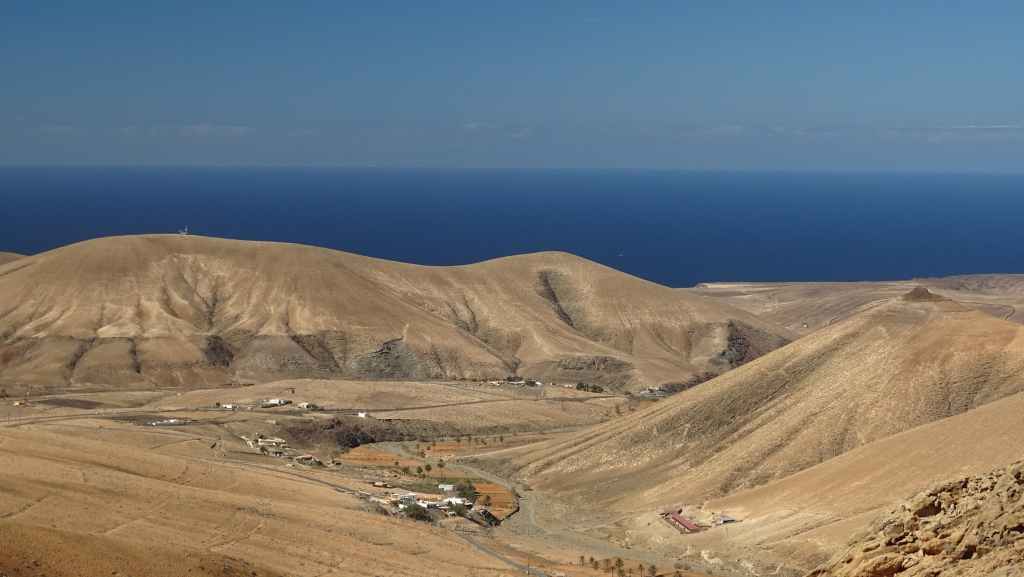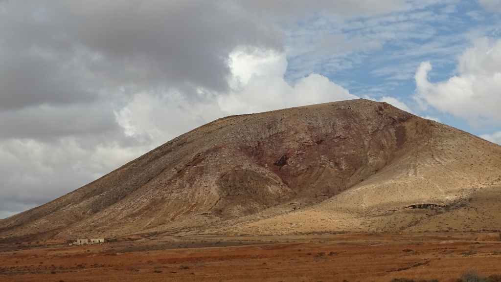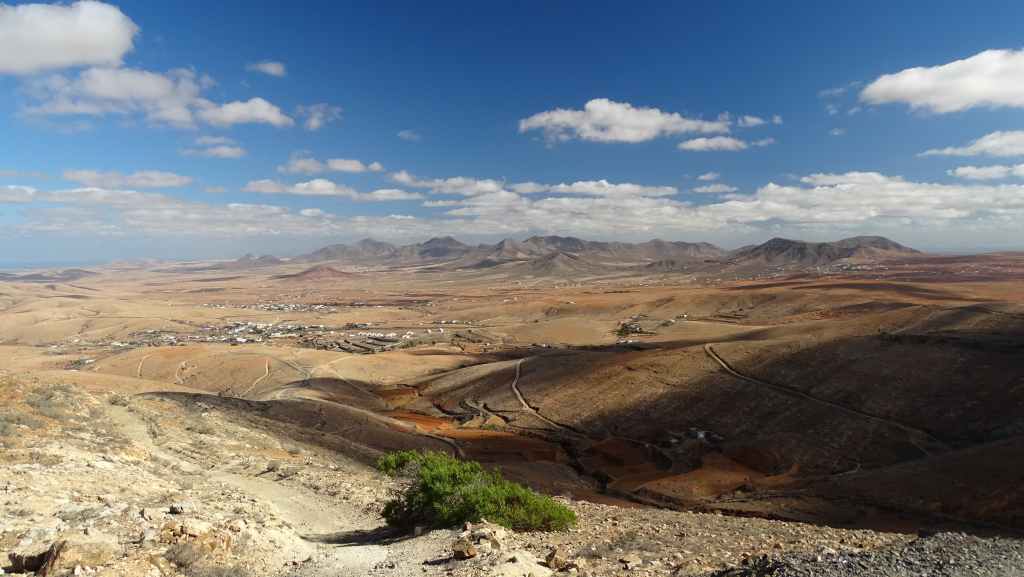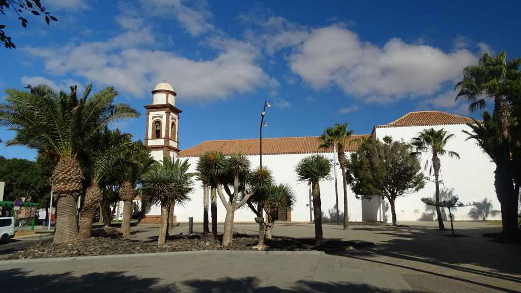 Aujourd’hui, nous repartons plein nord en direction de Corralejo, mais en prenant bien notre temps. Après un petit tour sur cette magnifique plage, nous remontons dans notre maison ambulante pour prendre la FV-2 puis la FV-20 avec un nouveau passage à Antigua. Nous nous arrêtons à Casillas del Angel pour visiter le centre ancien du village et son église Ste Anne, toute blanche mais à la façade noire faite de pierres basaltiques. Nous passons par Tetir, puis au niveau de Tindaya, nous grimpons une petite route sinueuse, la FV-103, qui nous mène à un joli belvédère avec vue sur les paysages désertiques de la côte ouest de l’île. Nous longeons une jolie vallée agricole où se baladent quelques chèvres puis plongeons… doucement… vers la côte est.
