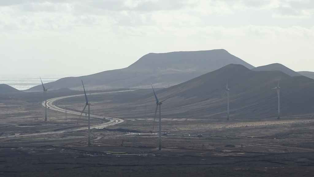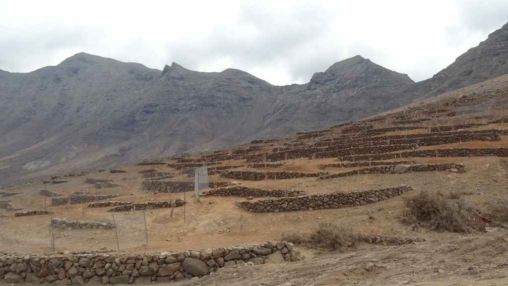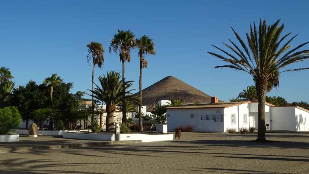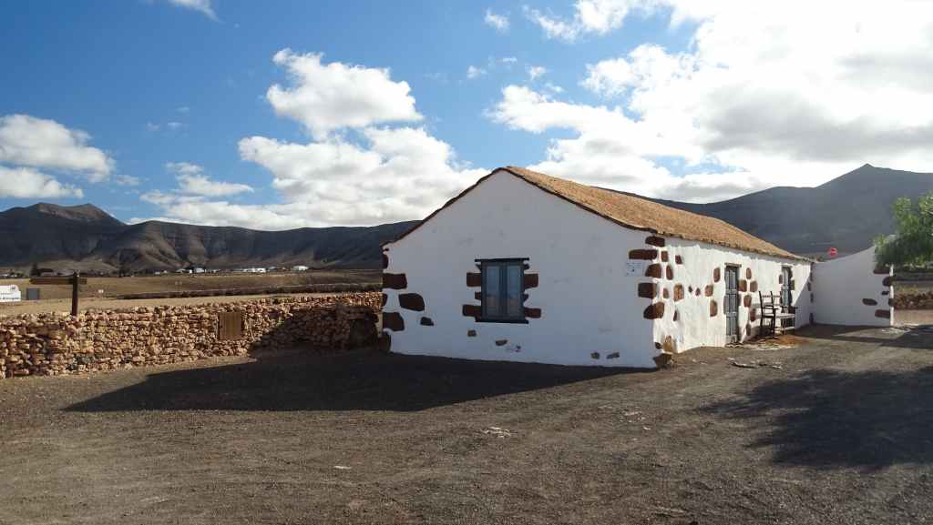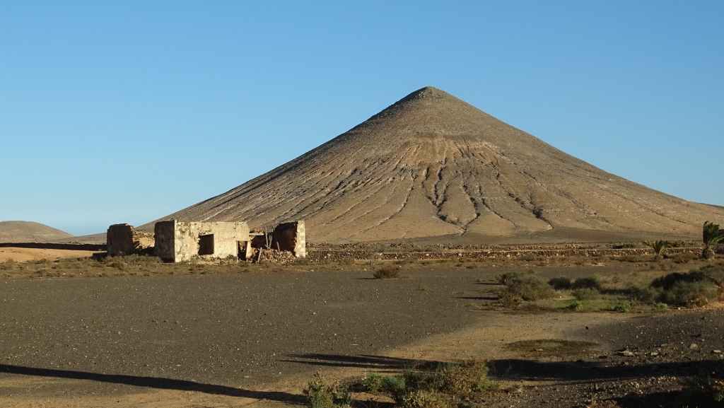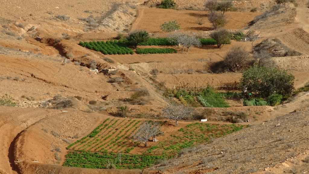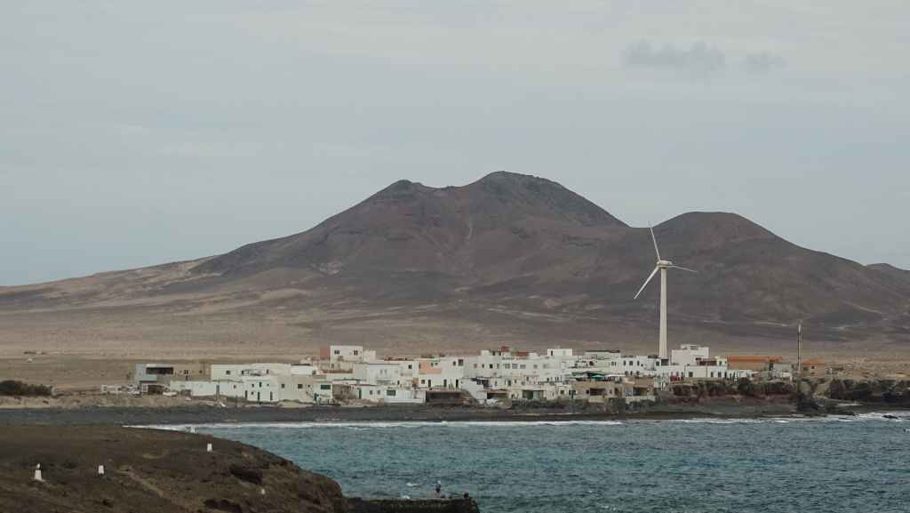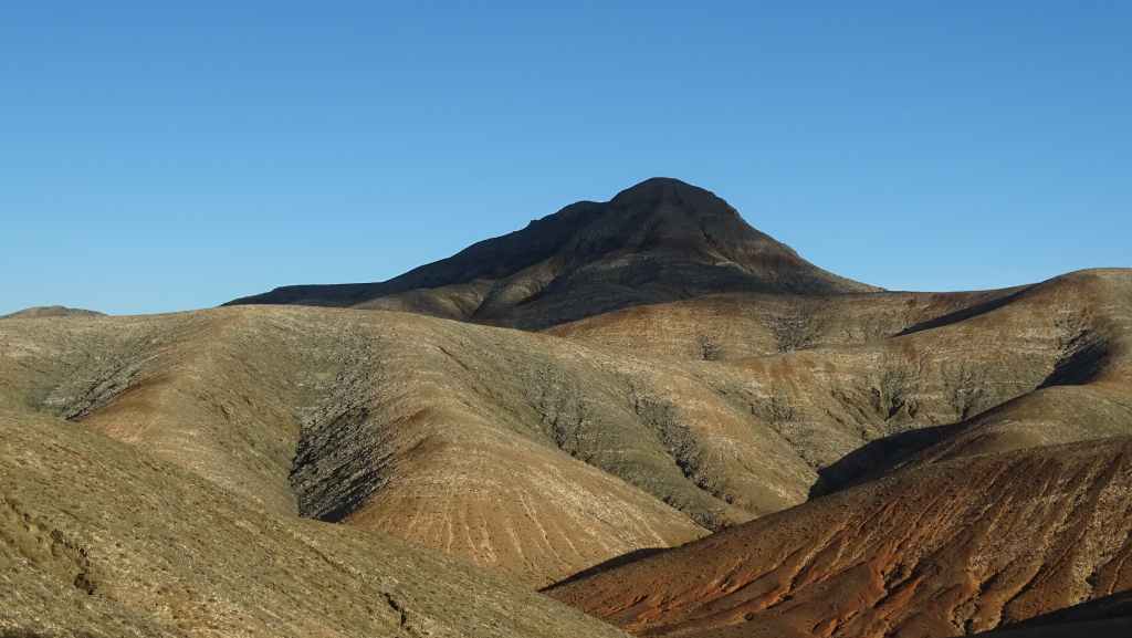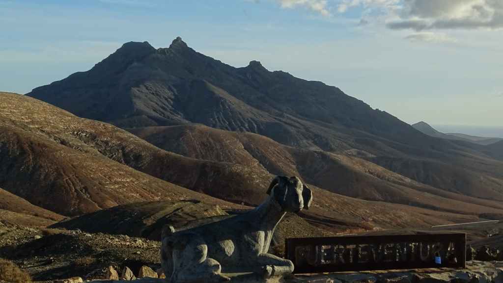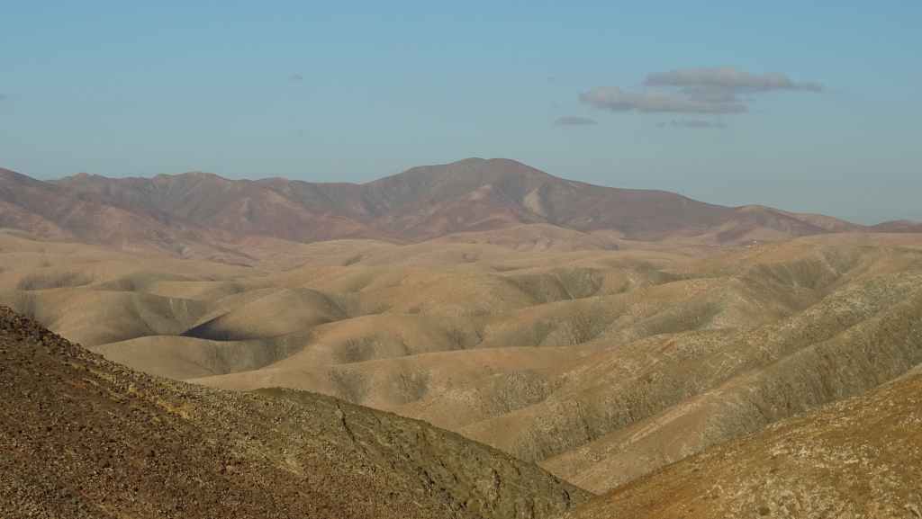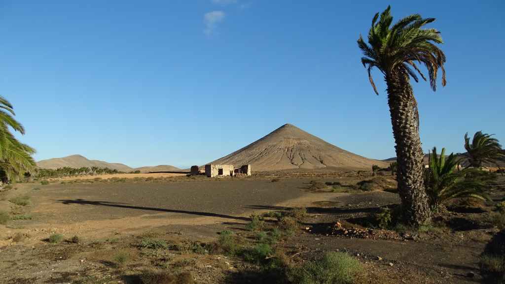 Aujourd’hui, nous repartons plein nord en direction de Corralejo, mais en prenant bien notre temps. Après un petit tour sur cette magnifique plage, nous remontons dans notre maison ambulante pour prendre la FV-2 puis la FV-20 avec un nouveau passage à Antigua. Nous nous arrêtons à Casillas del Angel pour visiter le centre ancien du village et son église Ste Anne, toute blanche mais à la façade noire faite de pierres basaltiques. Nous passons par Tetir, puis au niveau de Tindaya, nous grimpons une petite route sinueuse, la FV-103, qui nous mène à un joli belvédère avec vue sur les paysages désertiques de la côte ouest de l’île. Nous longeons une jolie vallée agricole où se baladent quelques chèvres puis plongeons… doucement… vers la côte est.