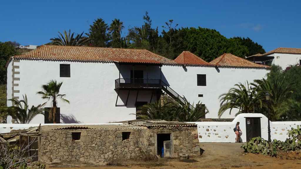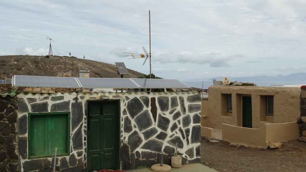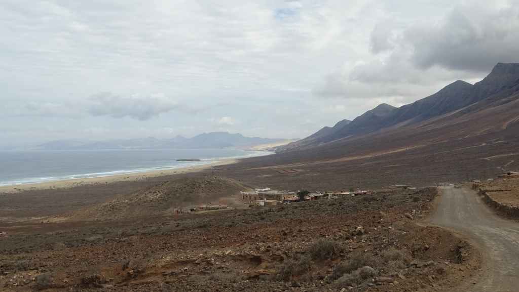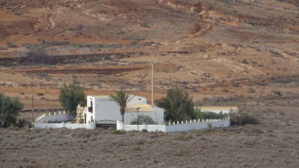 Et il y a déjà du monde qui circule sur cette piste de tôle ondulée : de très nombreuses voitures de location interdites sur ce genre de voies non goudronnées et quelques 4×4 avec guides et touristes. Quant à nous, nous sommes très secoués dans notre véhicule et la tenue de route est aléatoire, peut-être plus qu’en berline ! Mais nous, on a le droit… Après une douzaine de kilomètres, nous montons sur une piste secondaire qui permet de basculer, au niveau d’un col, de l’autre côté de l’île. Nous avons droit à une vue magnifiques sur les plages de Cofete. Une petite piste descend en direction de l’océan et nous la suivons jusqu’au bout. Nous poursuivons à pied jusque sur la plage. Nous remontons et nous dirigeons vers le hameau de Cofete, fait de petites maisons de pierres avec jardinets mais presque toutes sont inhabitées à cette époque. Nous y retrouvons les nombreux touristes qui viennent manger au seul restaurant du hameau. Au loin, on aperçoit la villa Winter qui a été construite par l’allemand Gustav Winter lié à l’époque nazie et où auraient eu lieu tortures et expériences « médicales »… et de nombreuses hypothèses et légendes circulent sur cette bâtisse.