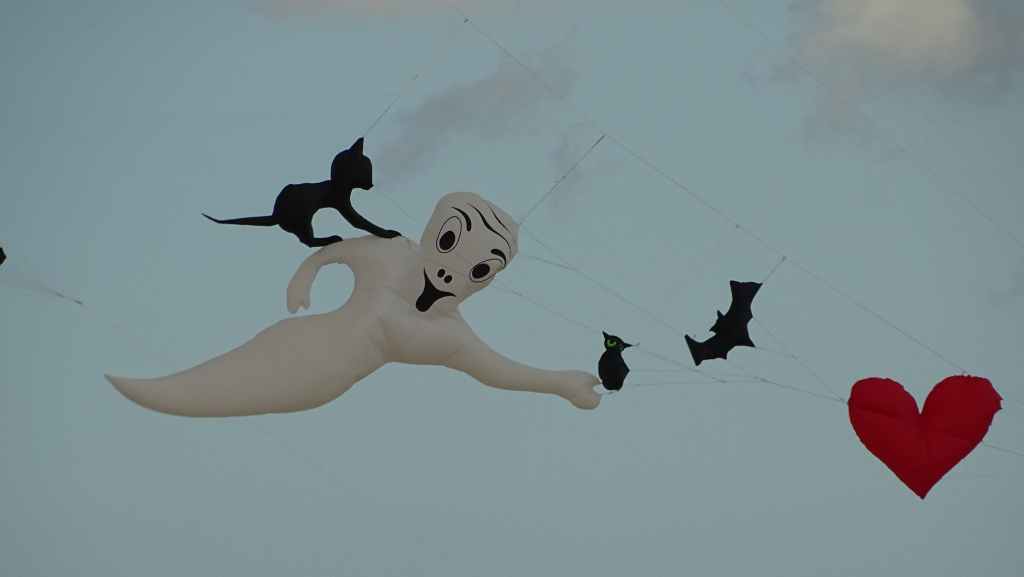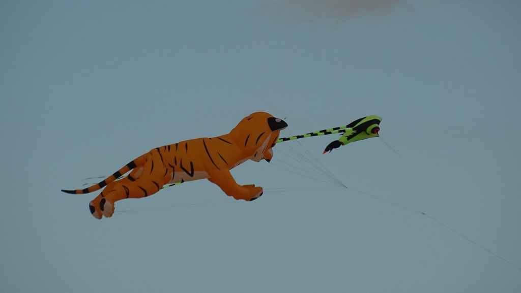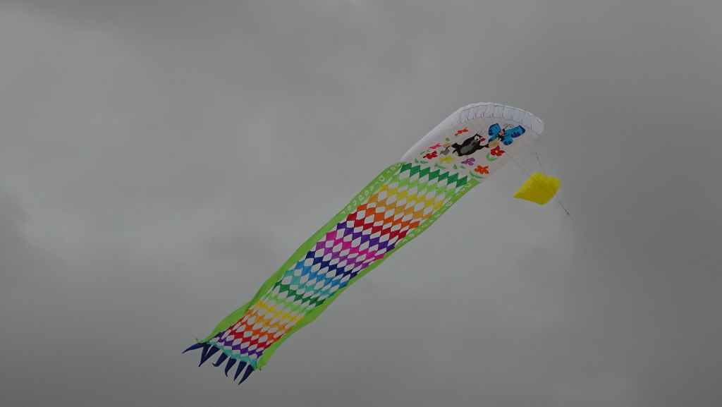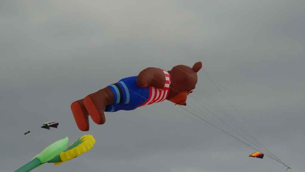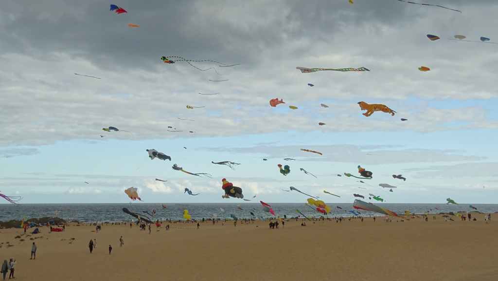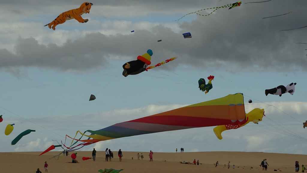Puis nous continuons cette piste qui rejoint un peu plus loin une zone résidentielle et la route principale. Nous nous arrêtons, comme prévu, dans le Parc Naturel des dunes où un festival de cerfs-volants à lieu. Il y a beaucoup de monde et beaucoup de couleurs dans le ciel qui s’est chargé de nuages gris.