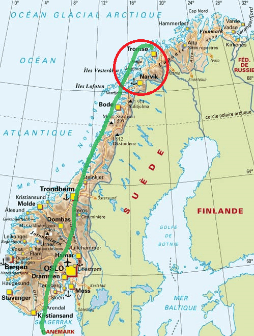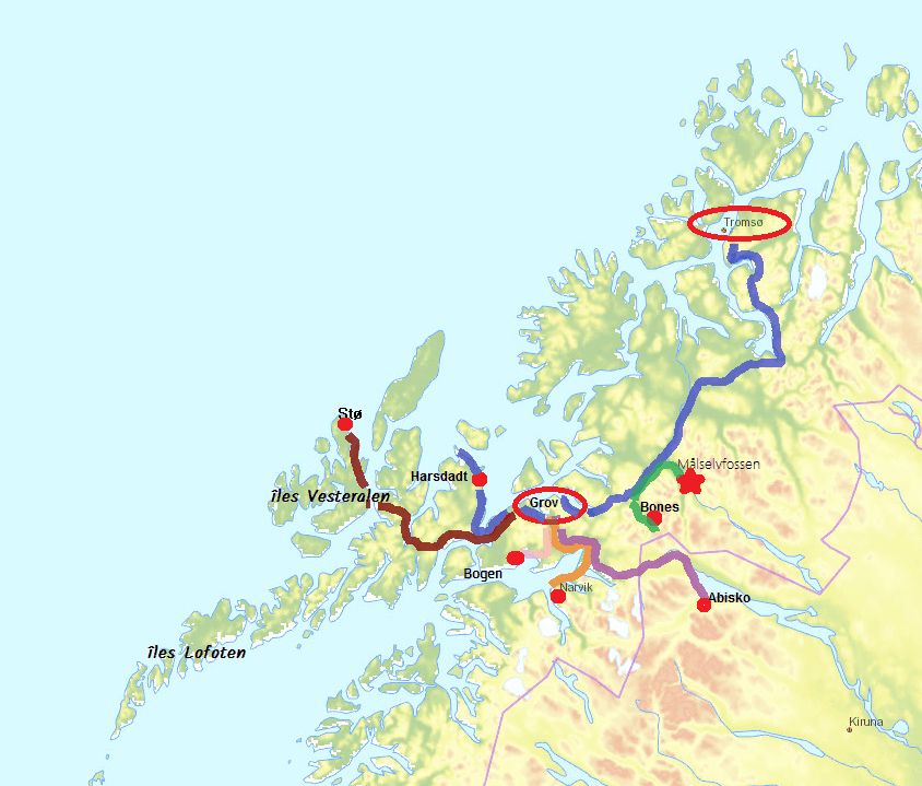 Nous sommes partis dans le Troms, région du nord de la Norvège, au niveau des îles Lofoten. La capitale de cette province est Tromsø, située à environ 300 km au nord du cercle polaire. C’est ici que nous avons atterri avec un vol Lufthansa depuis Francfort en Allemagne. C’est le seul vol direct possible que nous ayons trouvé lors de la réservation. Bien sûr, il faut 4h30 pour rejoindre Francfort depuis la maison, 3h30 de vol pour atteindre Tromsø, puis à nouveau 4h00 de route pour redescendre à Grov, notre lieu de villégiature ! Ça fait long mais c’est toujours moins que les 4000 km et 4 jours minimum de route pour y aller en voiture.
