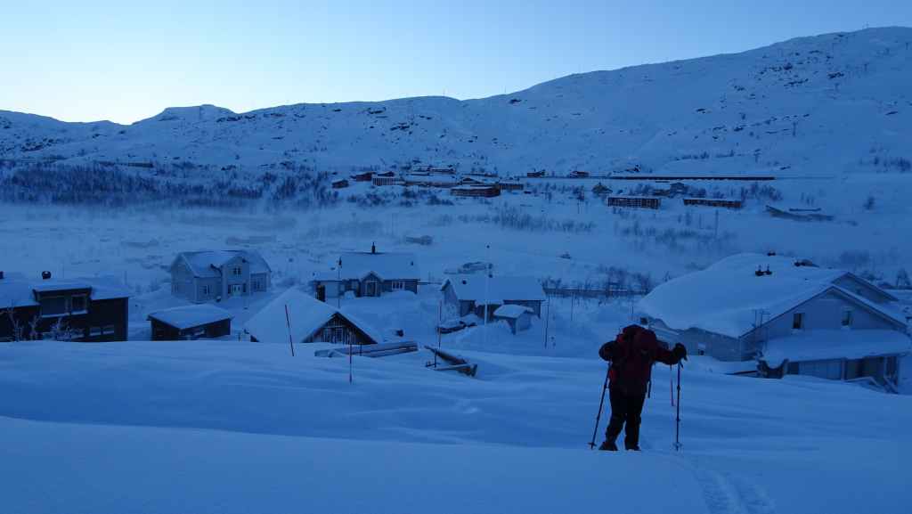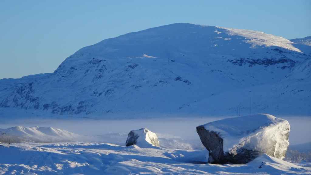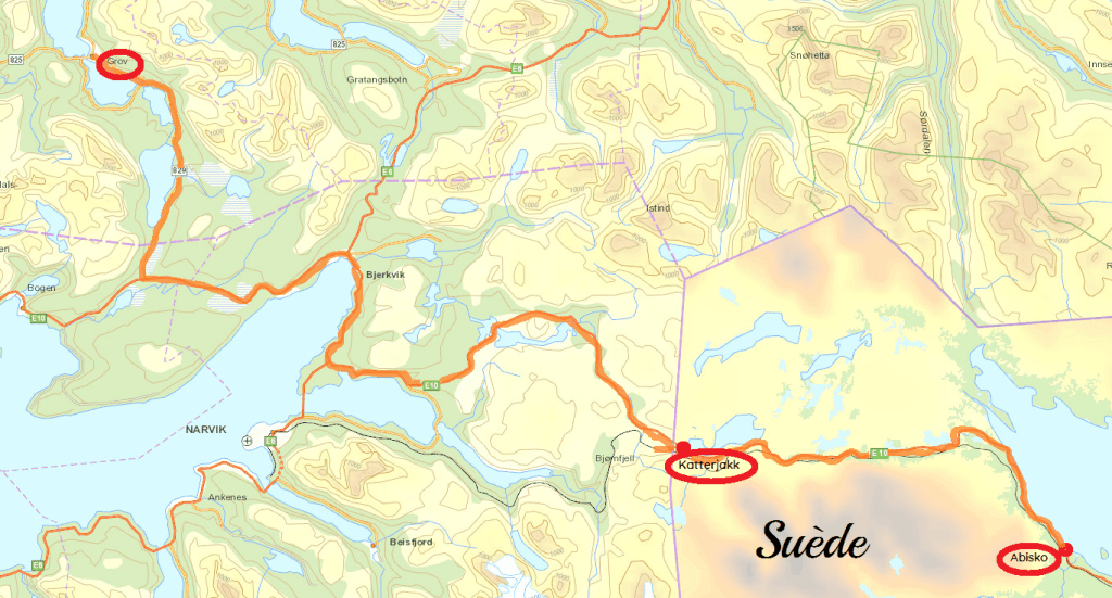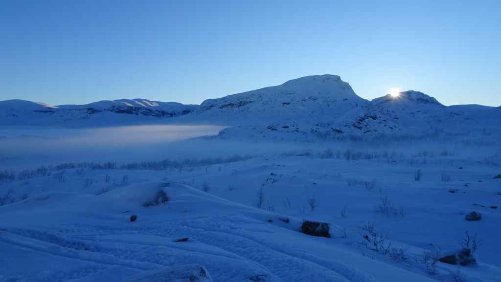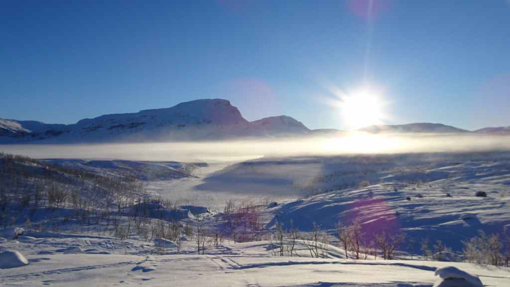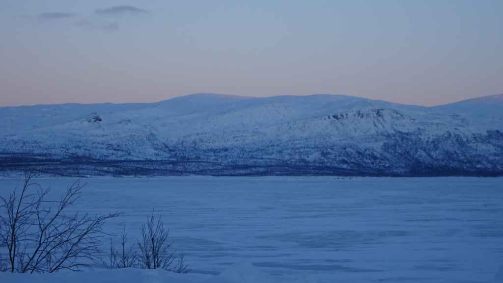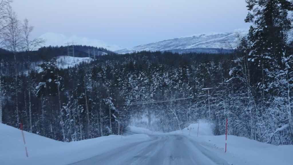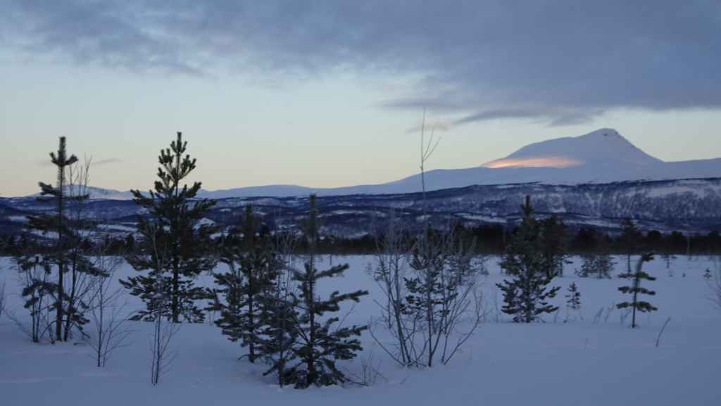 C’est une petite station touristique que nous connaissons bien mais nous la découvrons pour la première fois sous la neige. Il y a un village, une maison du parc national, des hébergements, et une boutique où l’on peut faire des achats d’artisanat local ou du matériel de randonnée puisque bon nombre de randonneurs s’arrêtent ici pour passer la nuit ou pour débuter ou terminer le Kungsleden (« le sentier royal » qui traverse le massif du Kebnekaise sur 400 km). Nous rentrons à Grov vers 19h00 à l’heure de l’apéro !