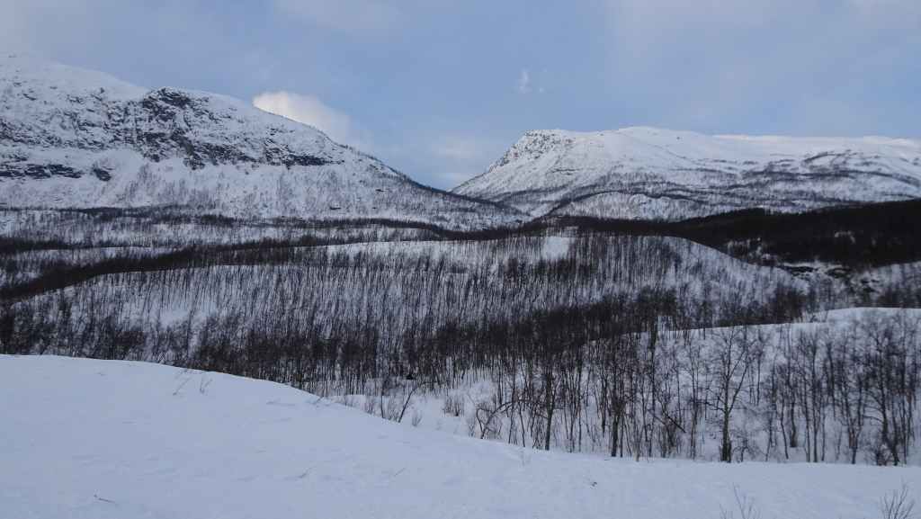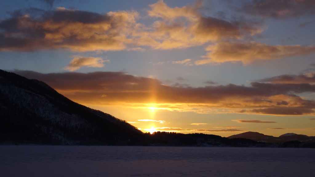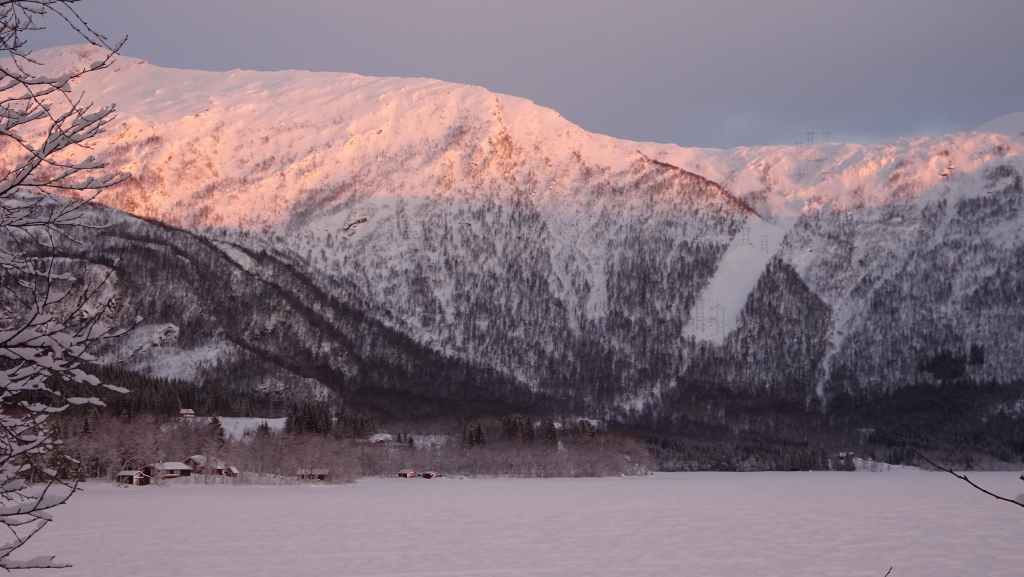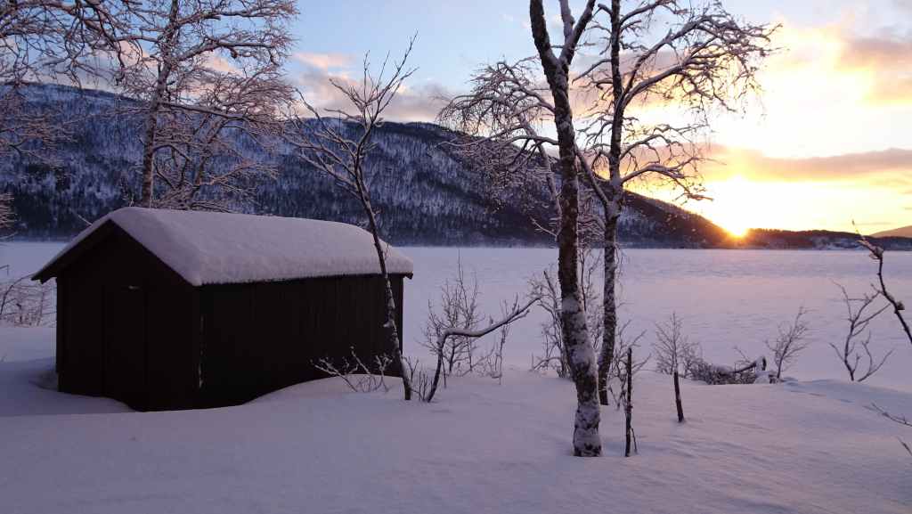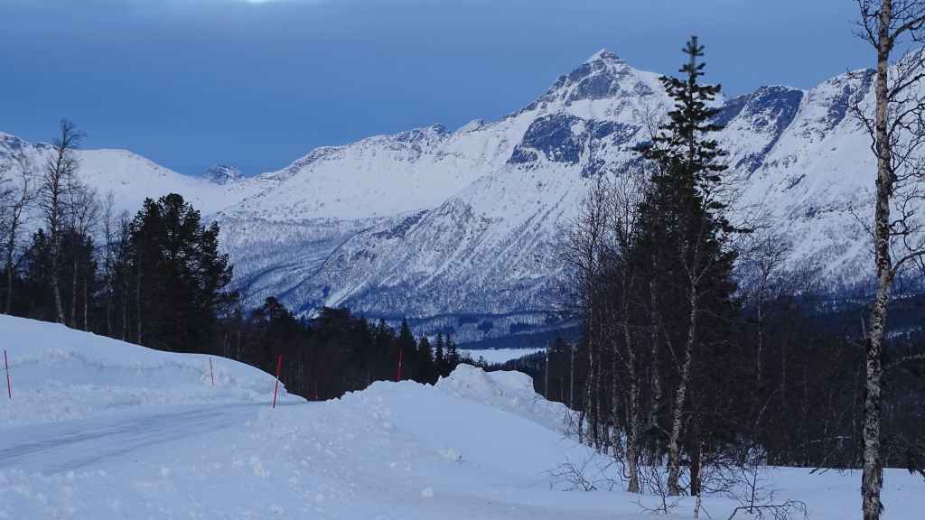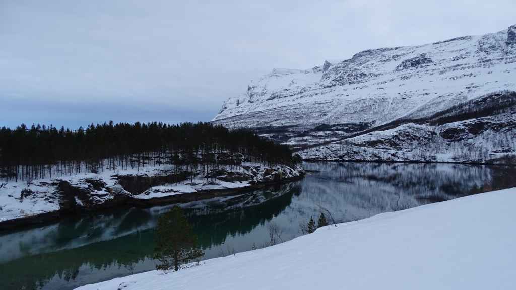 J’ai repéré un circuit d’environ 12 km qui mène à 3 lacs de montagne sur une carte internet (https://ut.no/kart/#6.56/68.712/15.599) bien pratique mais moins précises que nos cartes françaises ou suisses. Nous trouvons une place de parking juste au départ du sentier d’été. Ça grimpe dur dès le départ et pour faire la trace, je m’enfonce parfois jusqu’à mi-cuisse : c’est épuisant ! Nous devons rejoindre le haut d’une conduite forcée avant de continuer sur du plat… mais une barre rocheuse (non matérialisée sur la carte que j’ai imprimée), franchissable en été, nous bloque le passage et il nous est impossible de poursuivre la randonnée. Nous redescendons donc et du coup, nous mangeons au chaud dans la voiture.