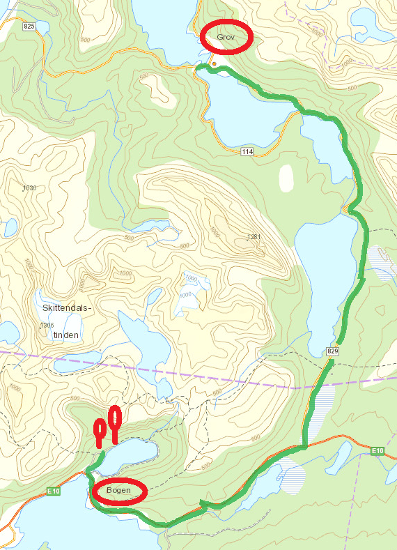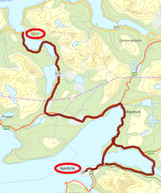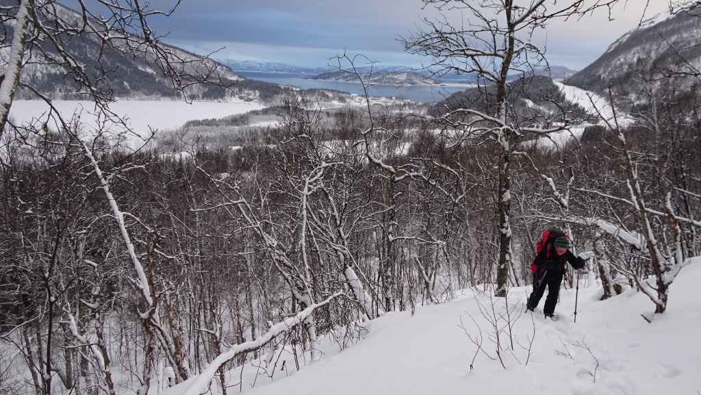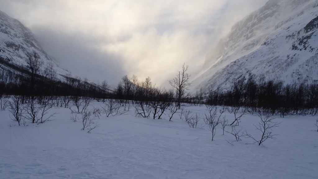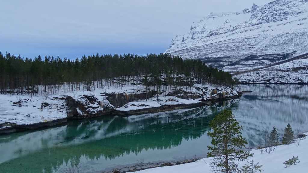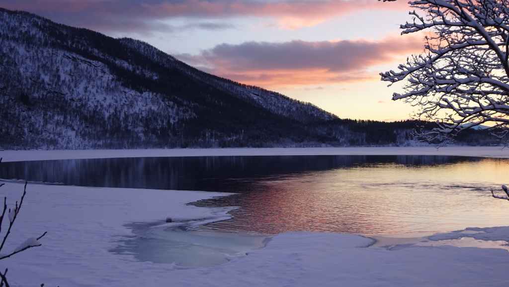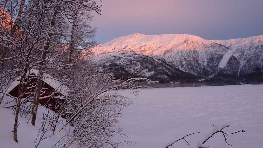 J’ai repéré un circuit d’environ 12 km qui mène à 3 lacs de montagne sur une carte internet (https://ut.no/kart/#6.56/68.712/15.599) bien pratique mais moins précises que nos cartes françaises ou suisses. Nous trouvons une place de parking juste au départ du sentier d’été. Ça grimpe dur dès le départ et pour faire la trace, je m’enfonce parfois jusqu’à mi-cuisse : c’est épuisant ! Nous devons rejoindre le haut d’une conduite forcée avant de continuer sur du plat… mais une barre rocheuse (non matérialisée sur la carte que j’ai imprimée), franchissable en été, nous bloque le passage et il nous est impossible de poursuivre la randonnée. Nous redescendons donc et du coup, nous mangeons au chaud dans la voiture.