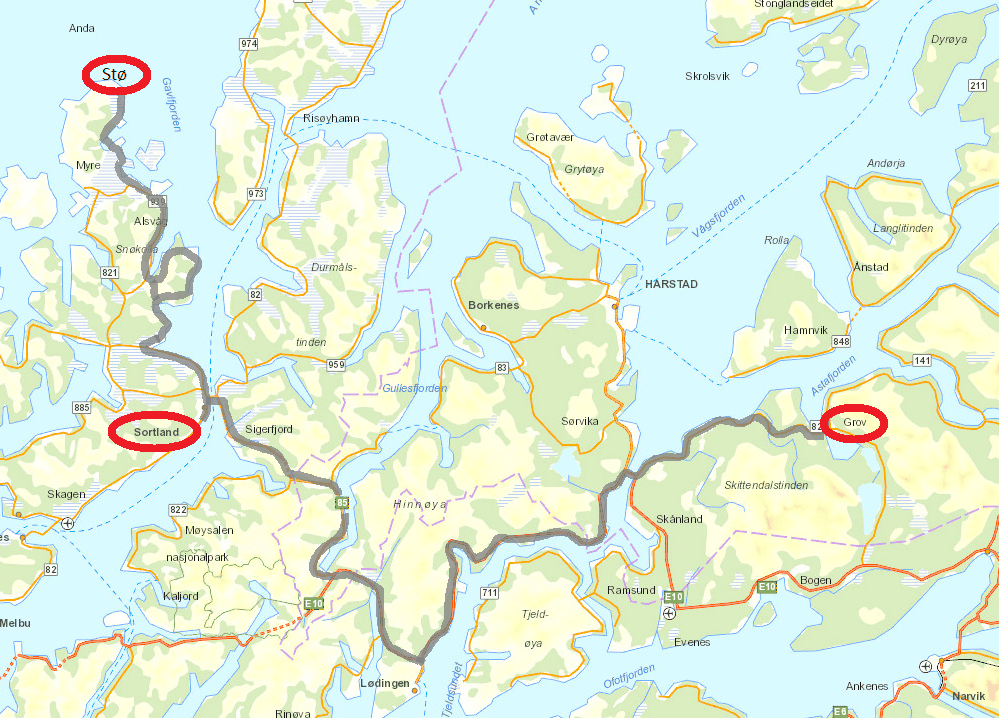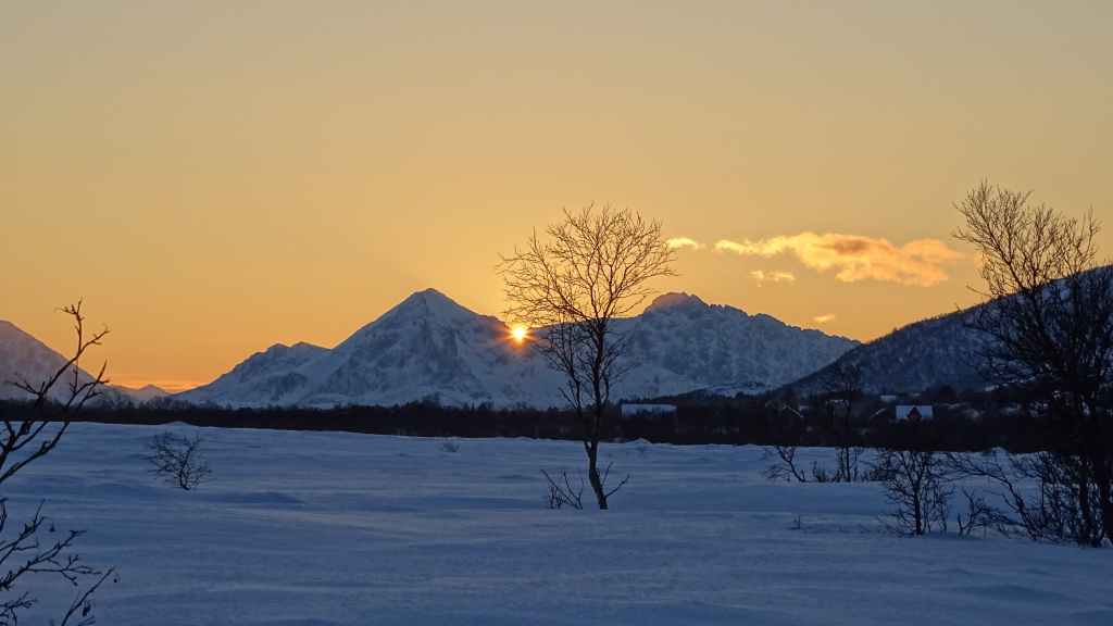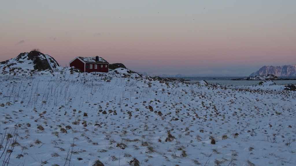Puis nous continuons vers le nord en direction de Myre puis Stø à l’extrême nord de l’île de Langøya, l’île la plus à l’ouest de l’archipel des Vesteralen. Les paysages, toujours aussi magnifiques, sont malgré tout un peu différent et la mer domine. Puis retour de nuit vers Grov. Comme le jour, la nuit met environ 2h30 pour prendre possession du ciel : de 7h00 (premières lueurs) à 9h30 (jour clair) pour le lever du jour. L’après-midi, le ciel s’assombrit vers 14h30 pour faire nuit noire en 16h30 et 17h00. Et dans la semaine, nous avons gagné la bagatelle d’1 heure de jour !