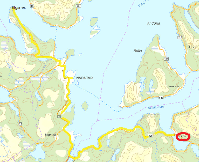 Ça y est, on est déjà au dernier jour de notre séjour à Grov et comme on a déjà fait pas mal de kilomètres durant la semaine, on a un peu envie de se poser et de ce fait, on préfère aller faire une petite balade à pied sur la petite route déserte qui longe le Grovfjord : on découvre une petite île couverte de pins entourée d’une eau claire toute verte…