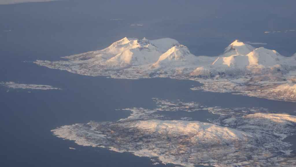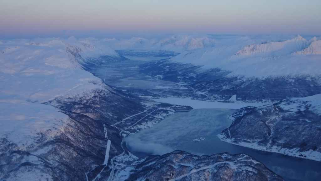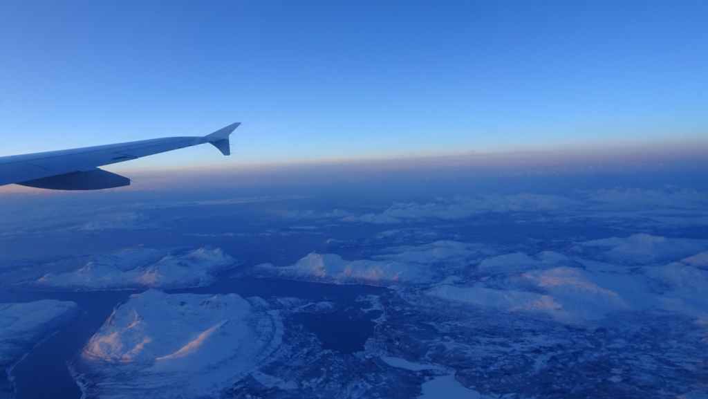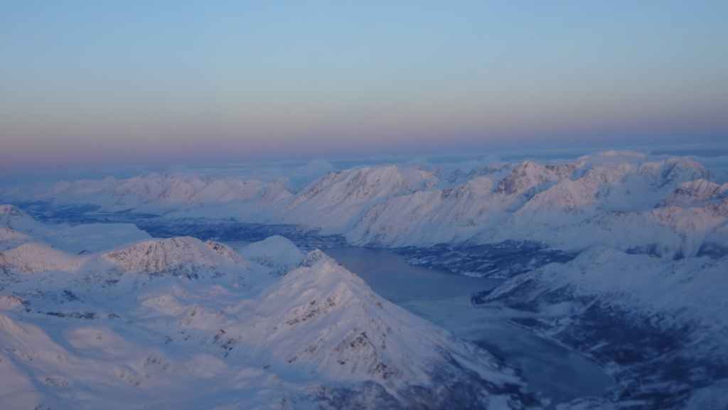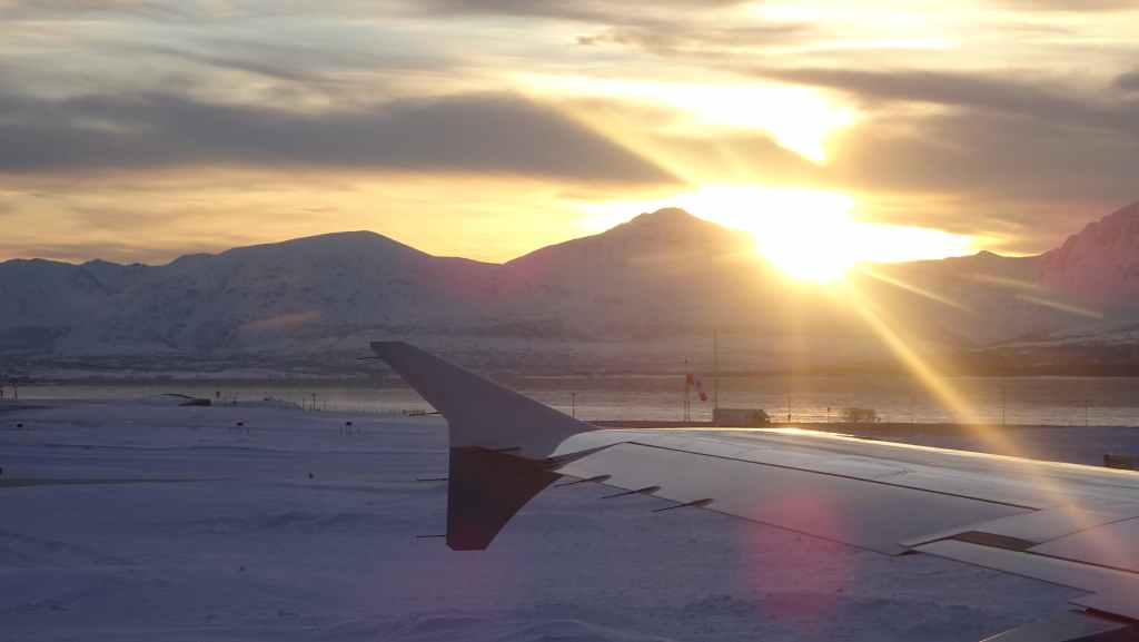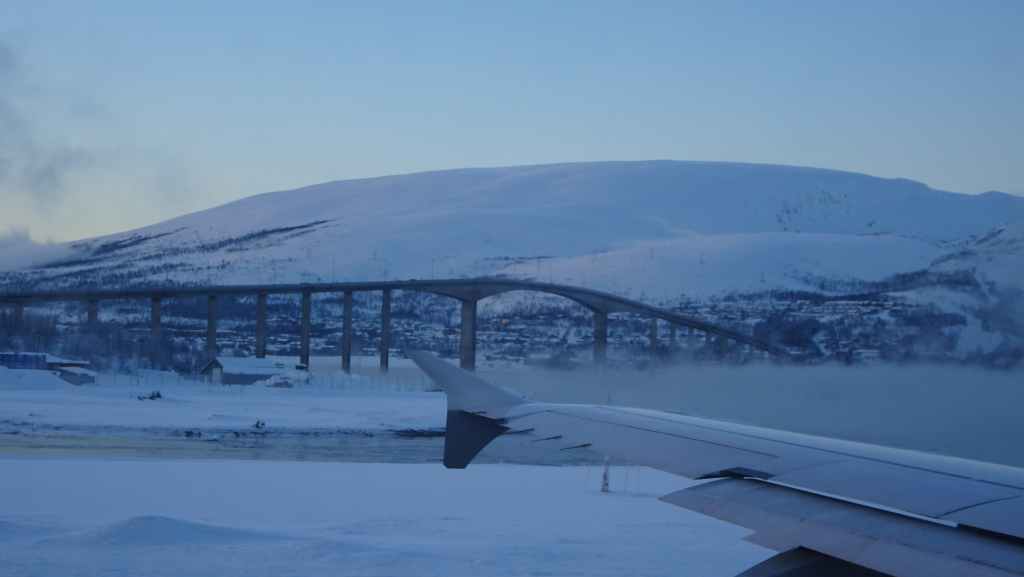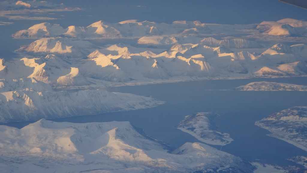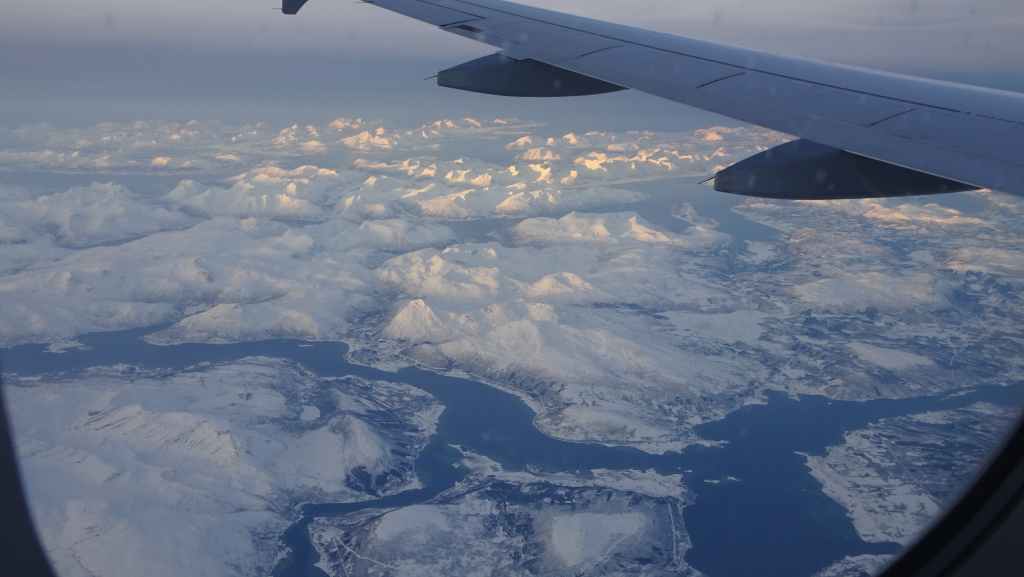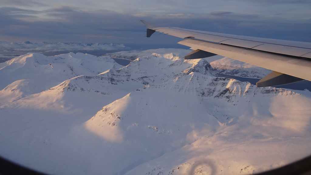 On décolle, avec 1 heure de retard, dans la grisaille et nous trouvons le soleil à 10000 m d’altitude… 3 h plus tard les nuages s’éparpillent laissant apparaitre de bien jolis paysages enneigés. Et plus on se rapproche de Tromsø, plus les montagnes rondes se transforment en pics acérés. Les fjords commencent parfois à geler, les lacs le sont eux depuis longtemps… L’atterrissage se fait sans problème après avoir survolé la ville de 70000 habitants.
