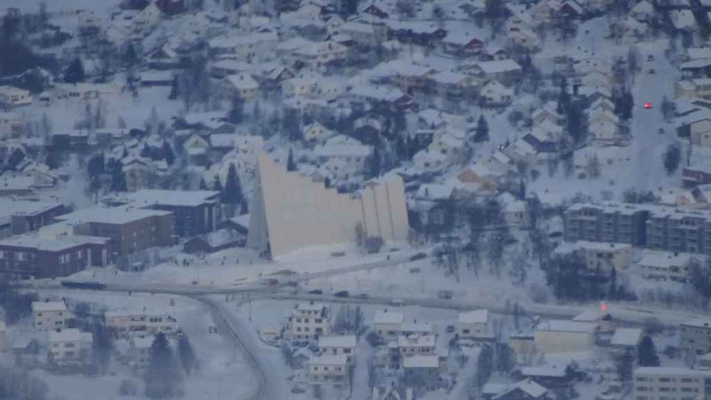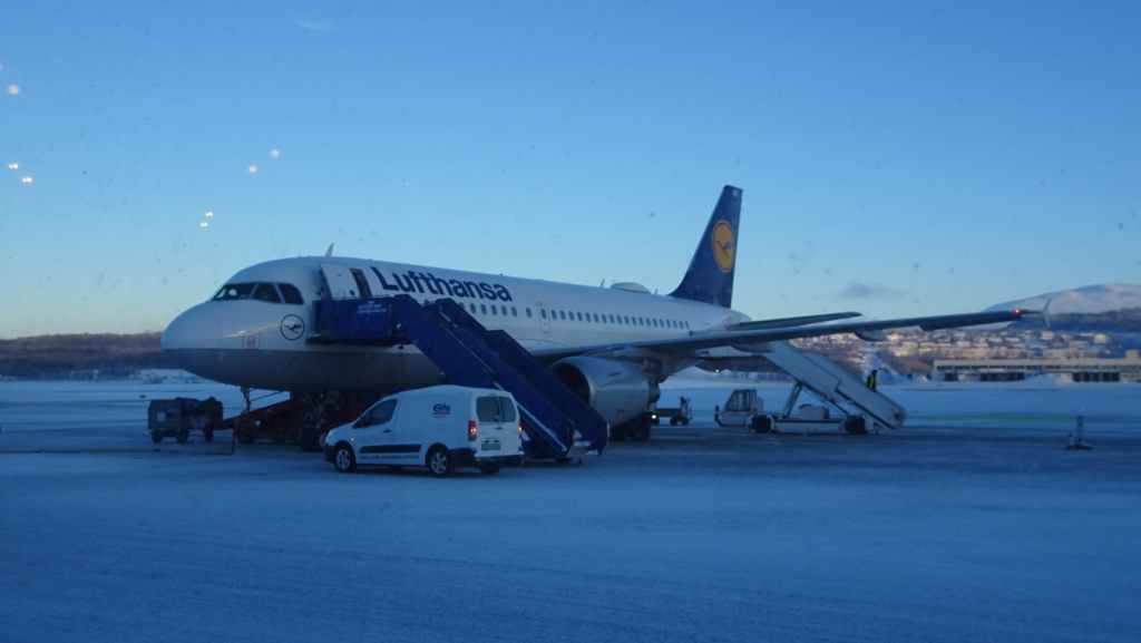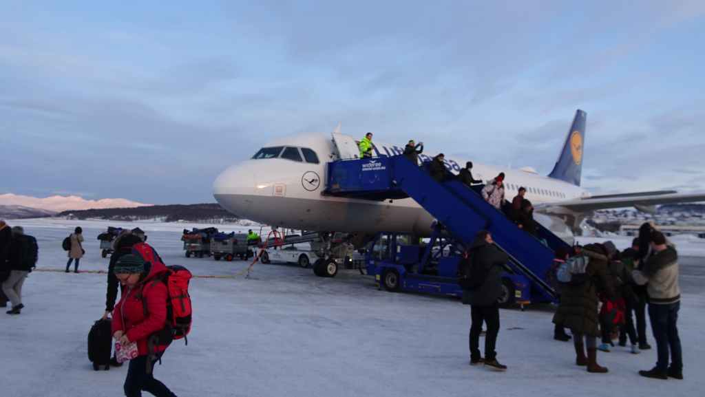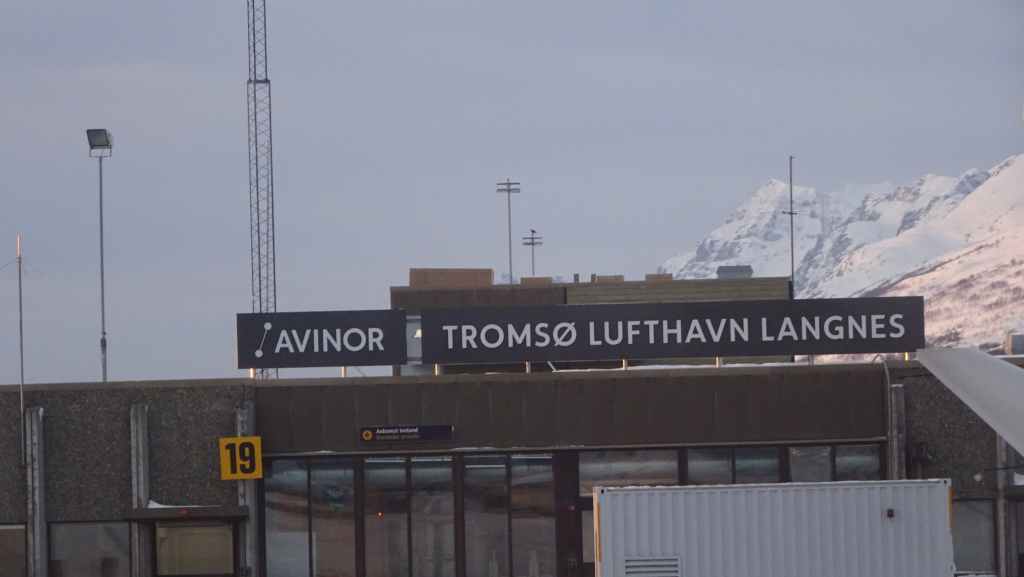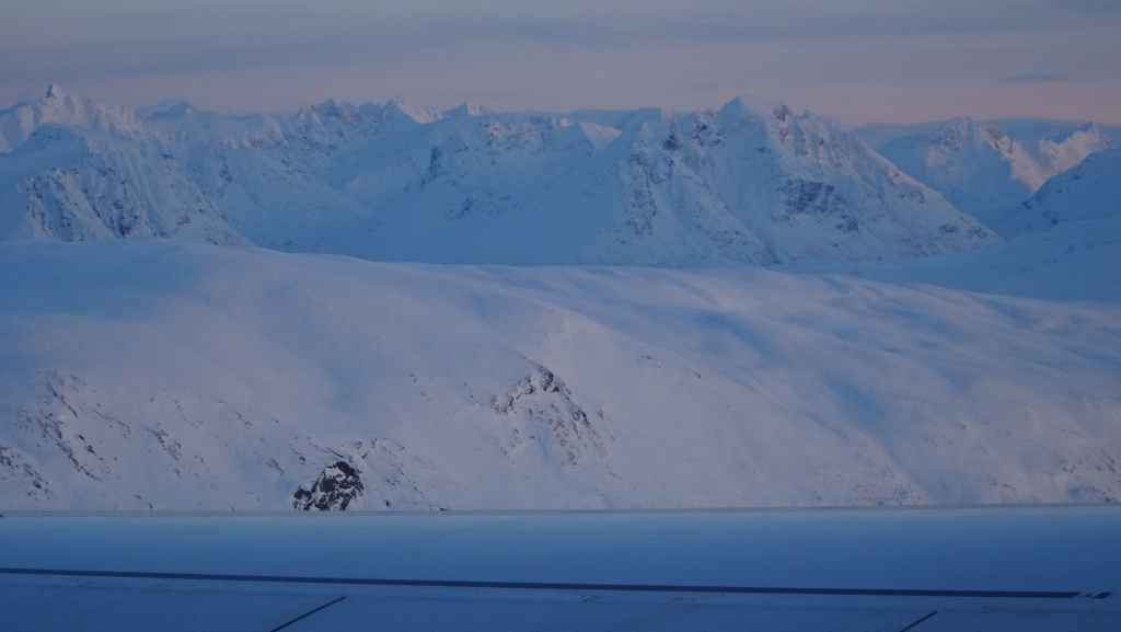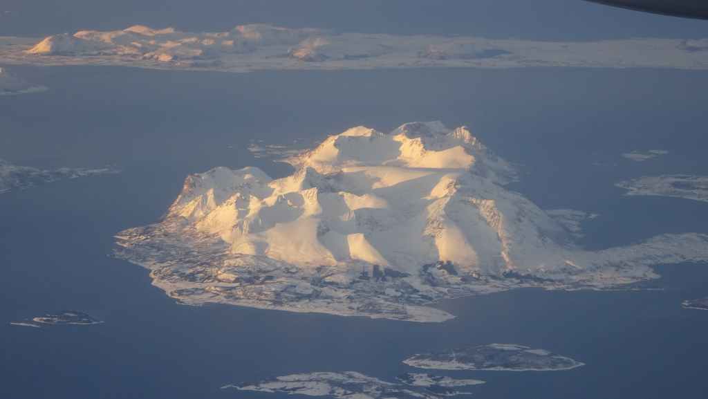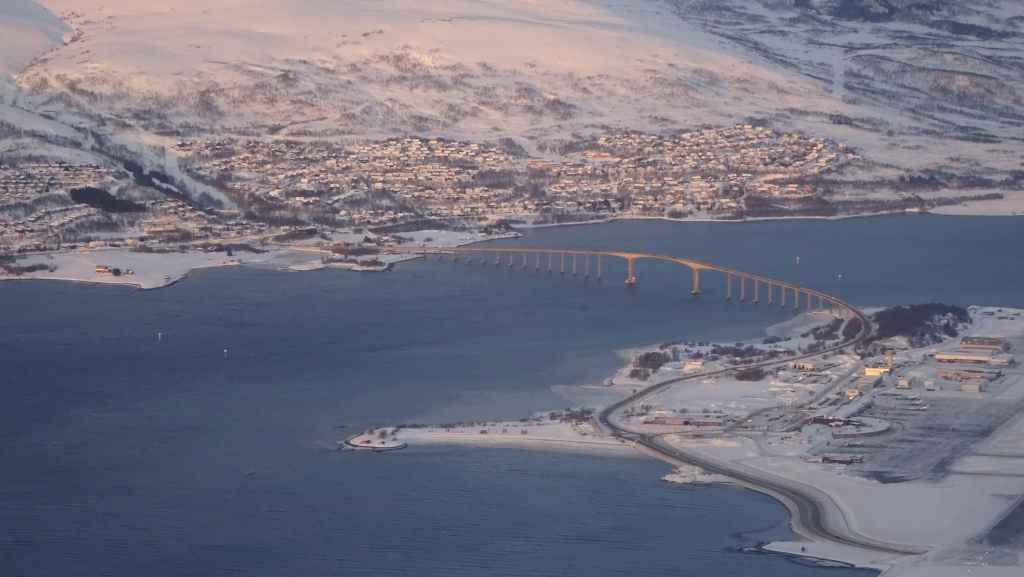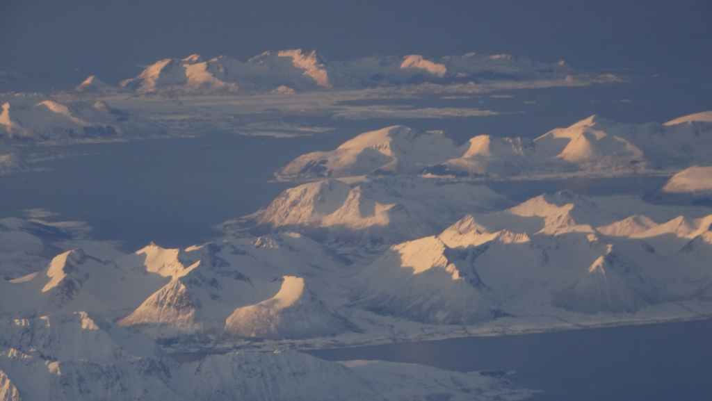 On décolle, avec 1 heure de retard, dans la grisaille et nous trouvons le soleil à 10000 m d’altitude… 3 h plus tard les nuages s’éparpillent laissant apparaitre de bien jolis paysages enneigés. Et plus on se rapproche de Tromsø, plus les montagnes rondes se transforment en pics acérés. Les fjords commencent parfois à geler, les lacs le sont eux depuis longtemps… L’atterrissage se fait sans problème après avoir survolé la ville de 70000 habitants.