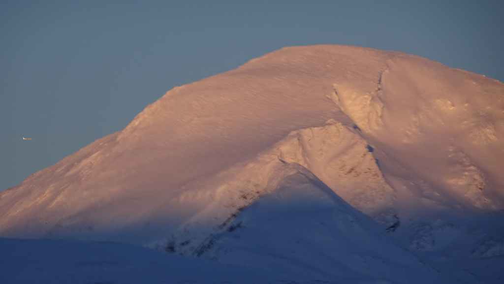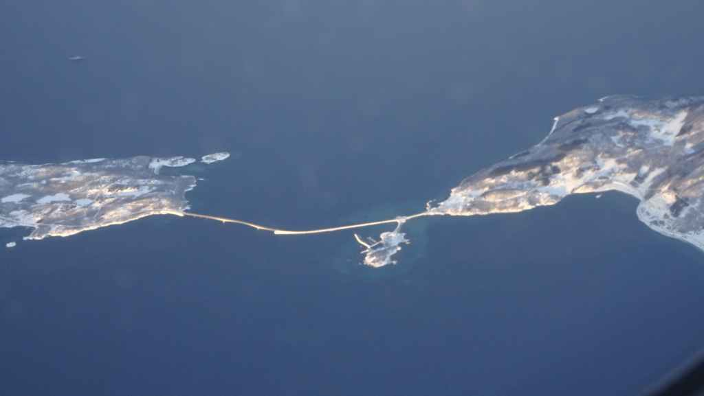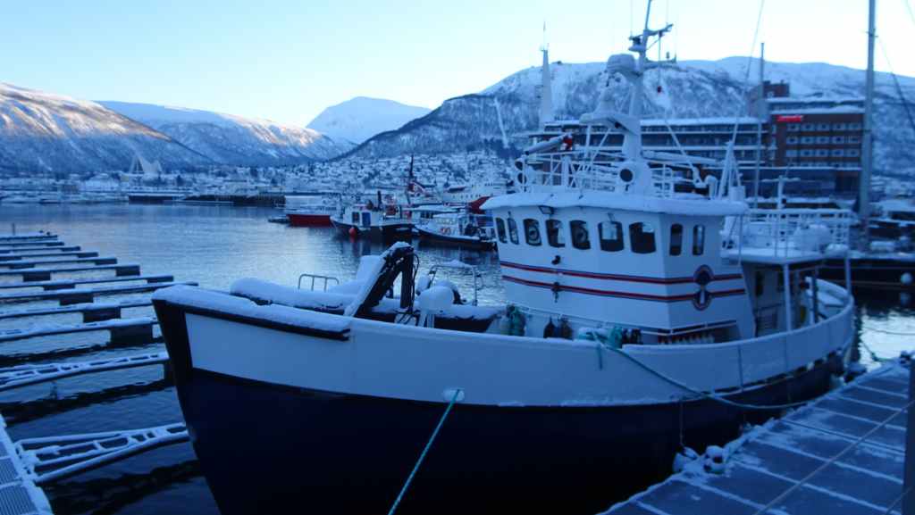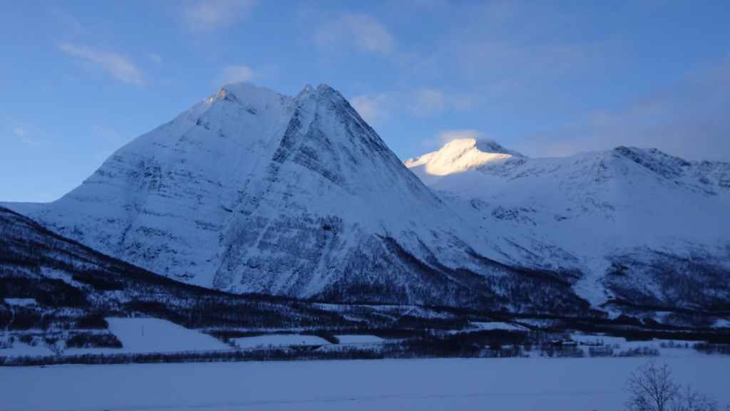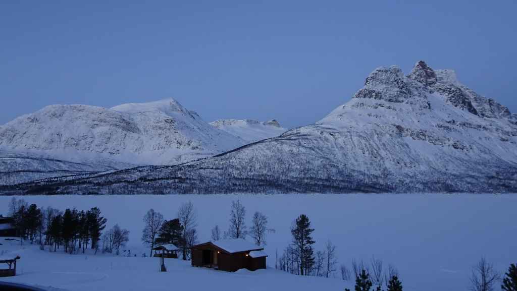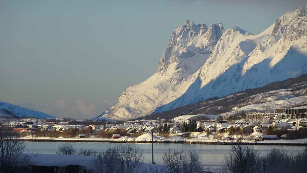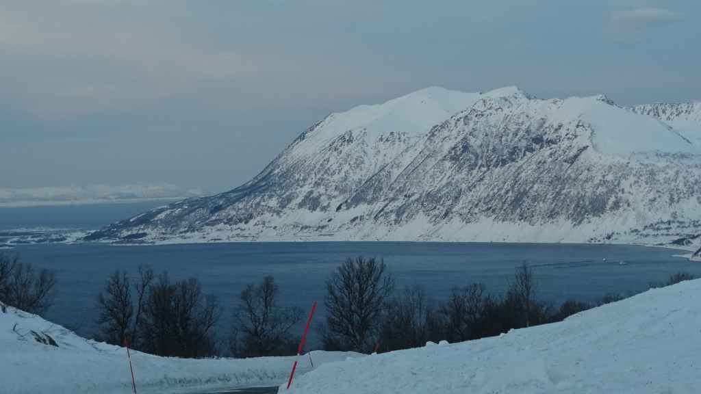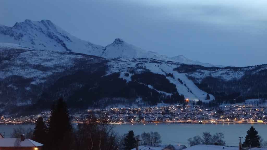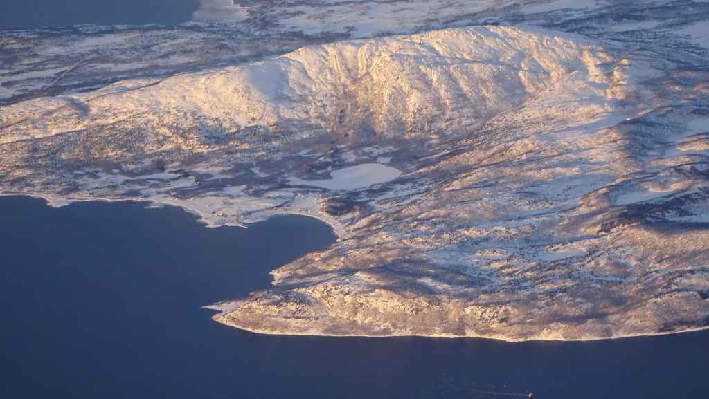 On décolle, avec 1 heure de retard, dans la grisaille et nous trouvons le soleil à 10000 m d’altitude… 3 h plus tard les nuages s’éparpillent laissant apparaitre de bien jolis paysages enneigés. Et plus on se rapproche de Tromsø, plus les montagnes rondes se transforment en pics acérés. Les fjords commencent parfois à geler, les lacs le sont eux depuis longtemps… L’atterrissage se fait sans problème après avoir survolé la ville de 70000 habitants.