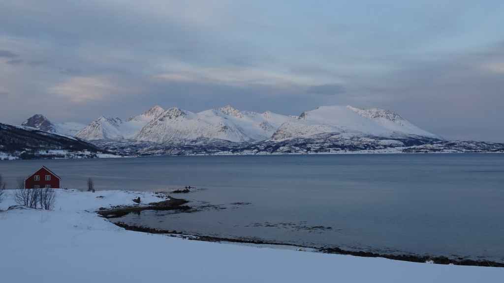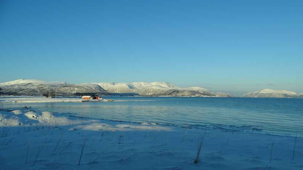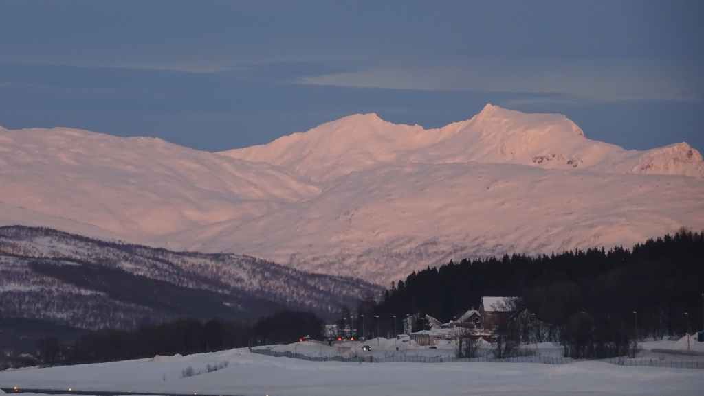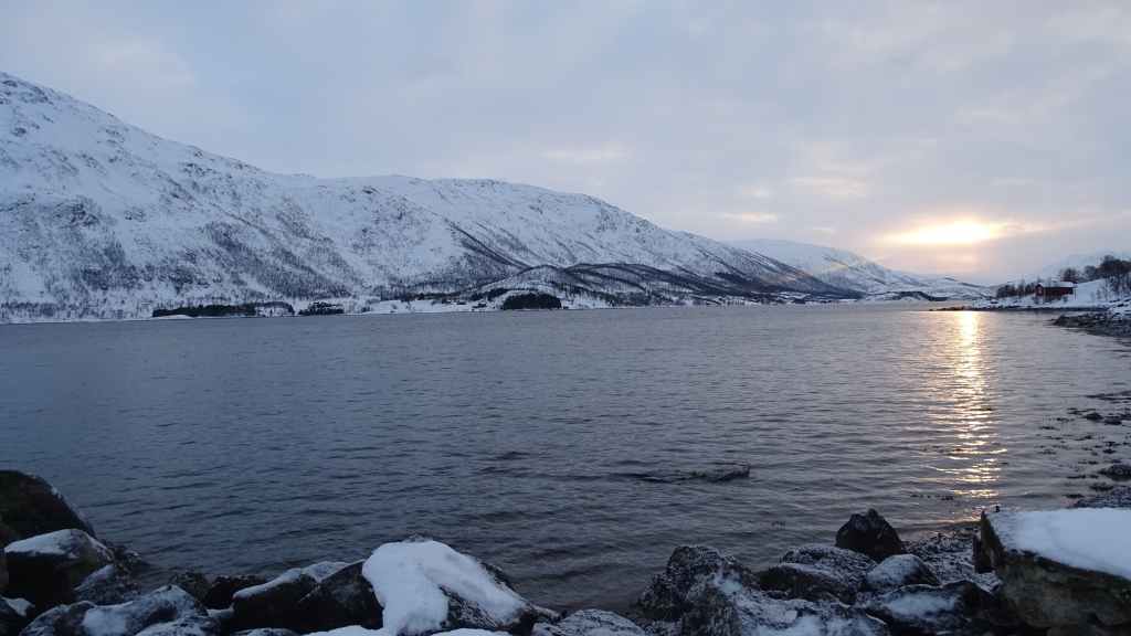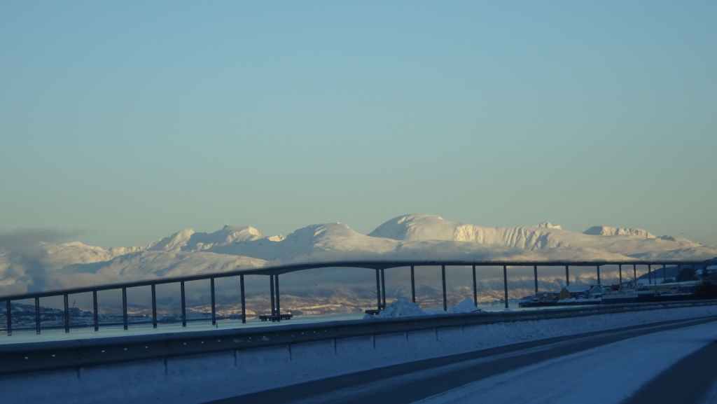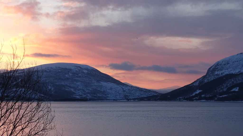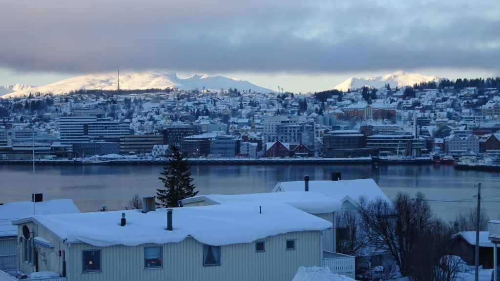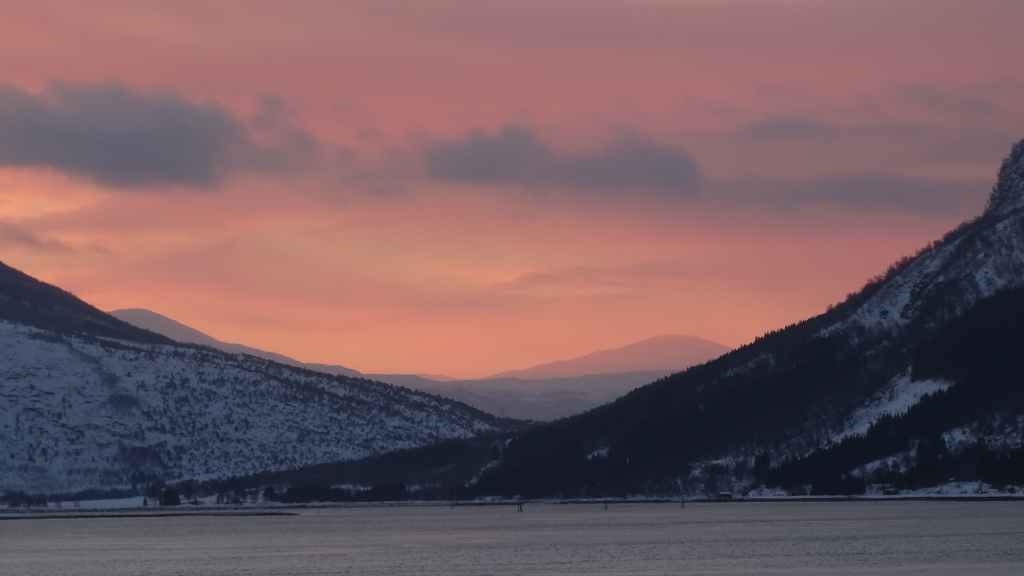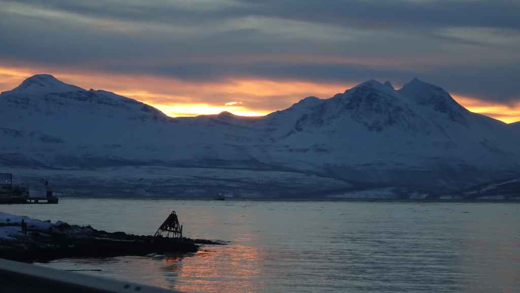 Notre avion décolle cet après-midi à 14h05, mais vu le temps mis à l’aller et que l’on veut faire un petit tour dans Tromsø, nous quittons notre appartement à 7h00, heure où les premières lueurs du jour apparaissent au bout du fjord…