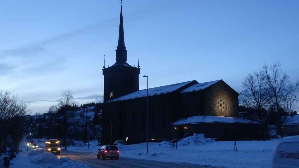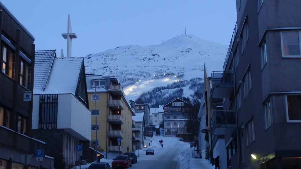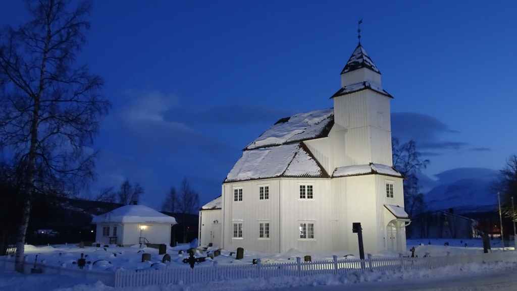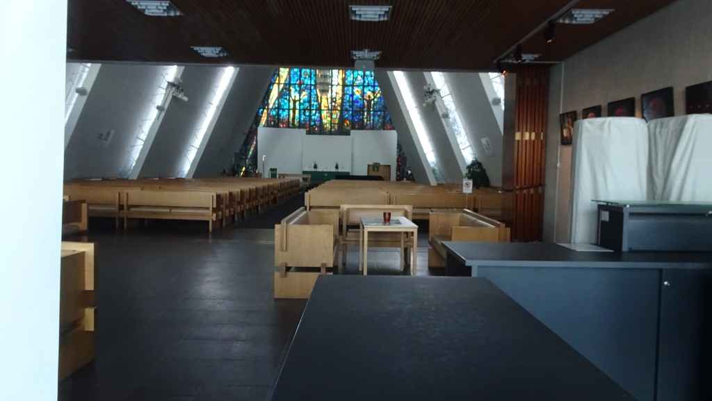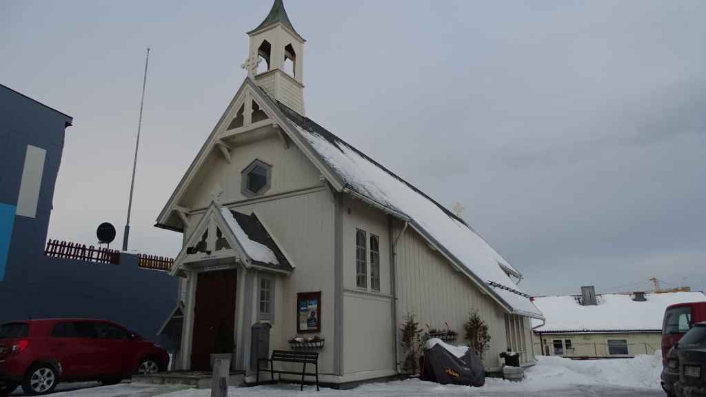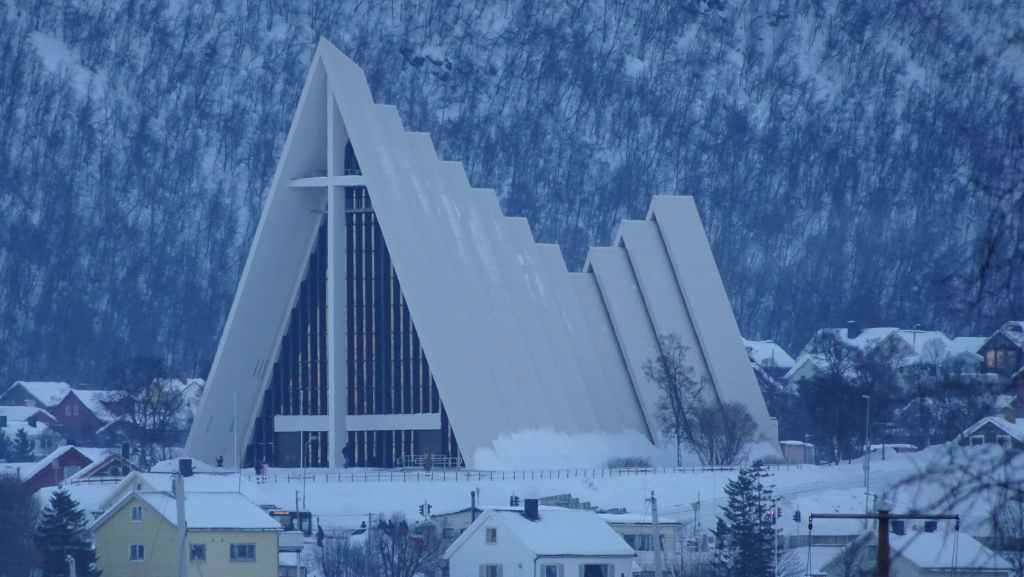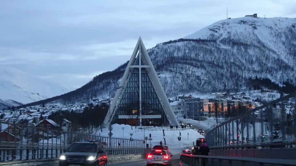 A 10h30, on a la cathédrale arctique en point de mire. On se gare pour aller la visiter mais elle ouvre seulement l’après-midi en hiver. On aperçoit tout de même l’intérieur contemporain.