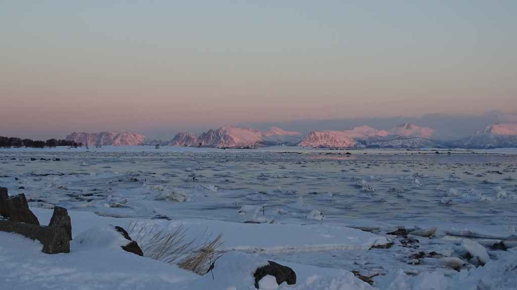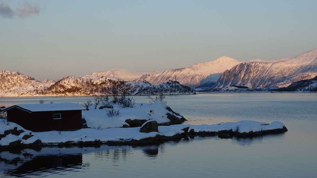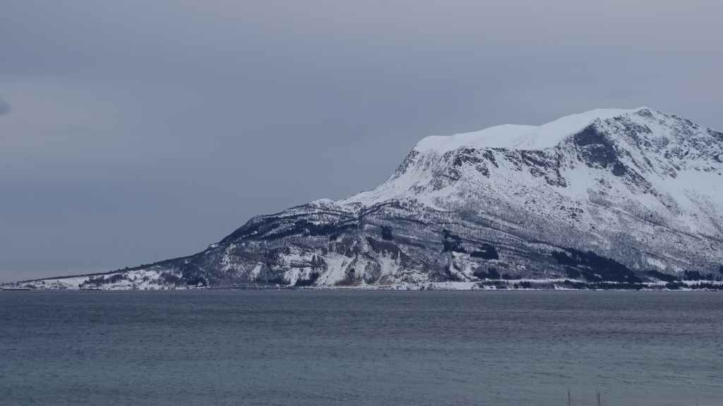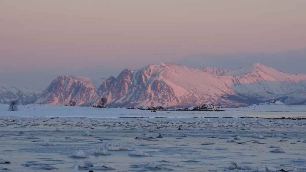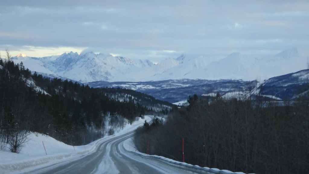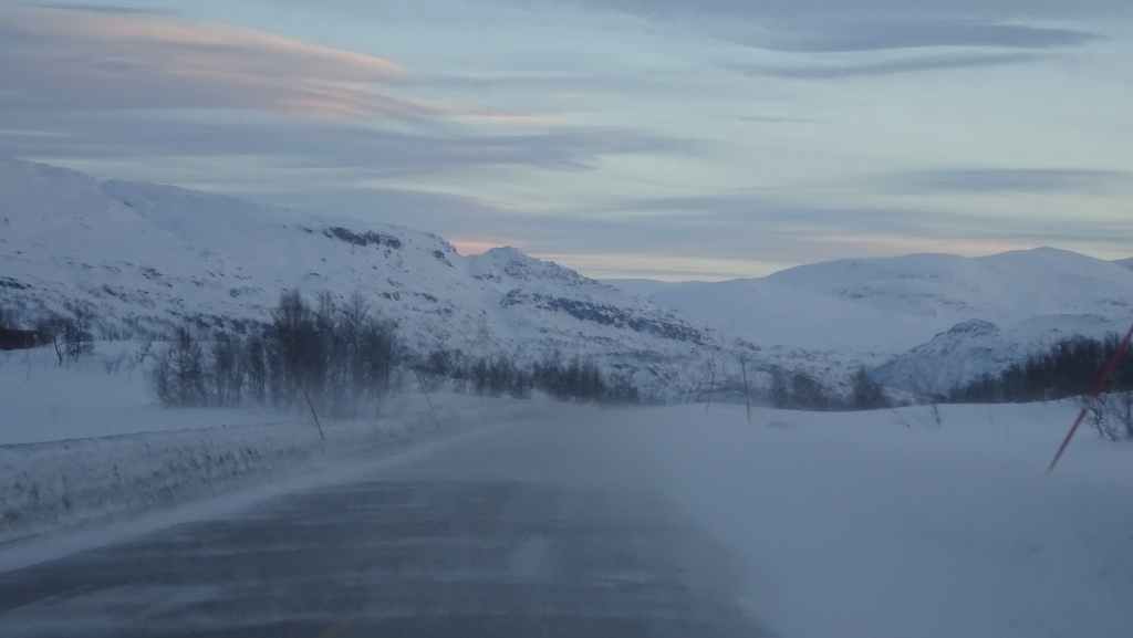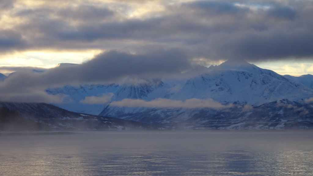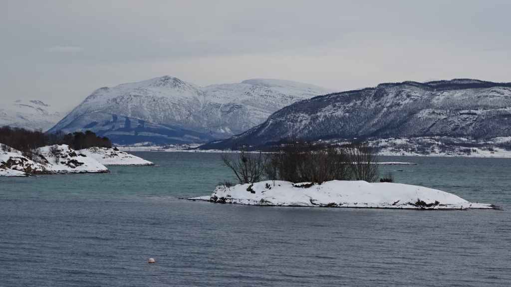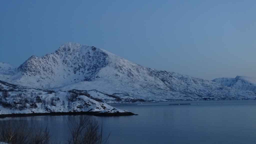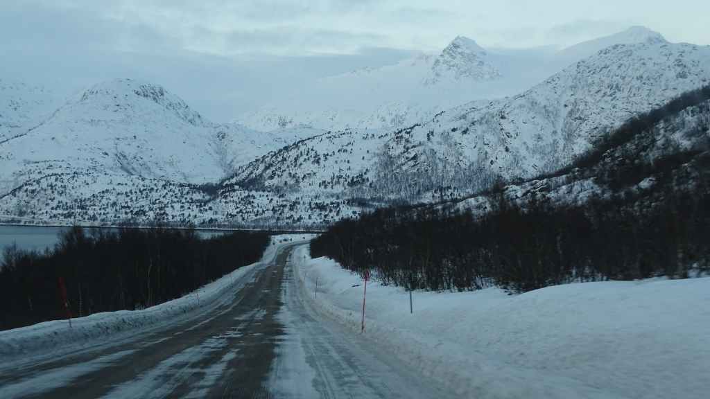 Mais à mesure que nous avançons vers l’ouest, le ciel se charge de nuages et la neige se met à tomber lorsque nous passons un col à au moins… 80 m d’altitude ! Dilemme : doit-on continuer vers les îles Lofoten au risque de ne rien voir où doit-on continuer vers les îles Vesteralen où le ciel à l’air de rester bien bleu ? Le choix est vite fait et à Gullesfjord, nous quittons la N10 pour prendre la N85 en direction de Sortland. Pour arriver dans cette ville, déjà visitée en 2016, on traverse de magnifiques paysages blancs, bleus, orangés, des bancs de brume de froid et des pics de granites grandioses…