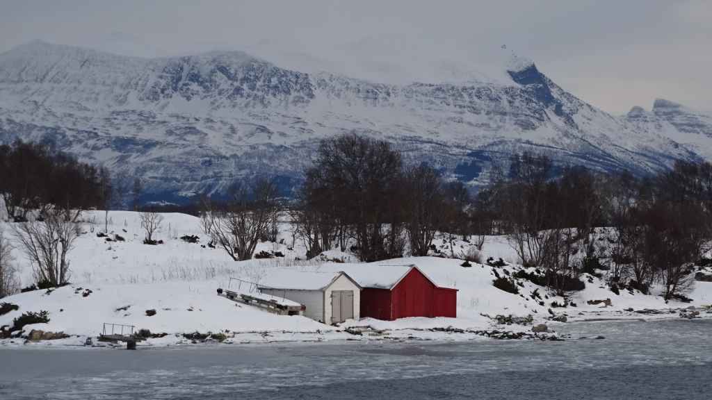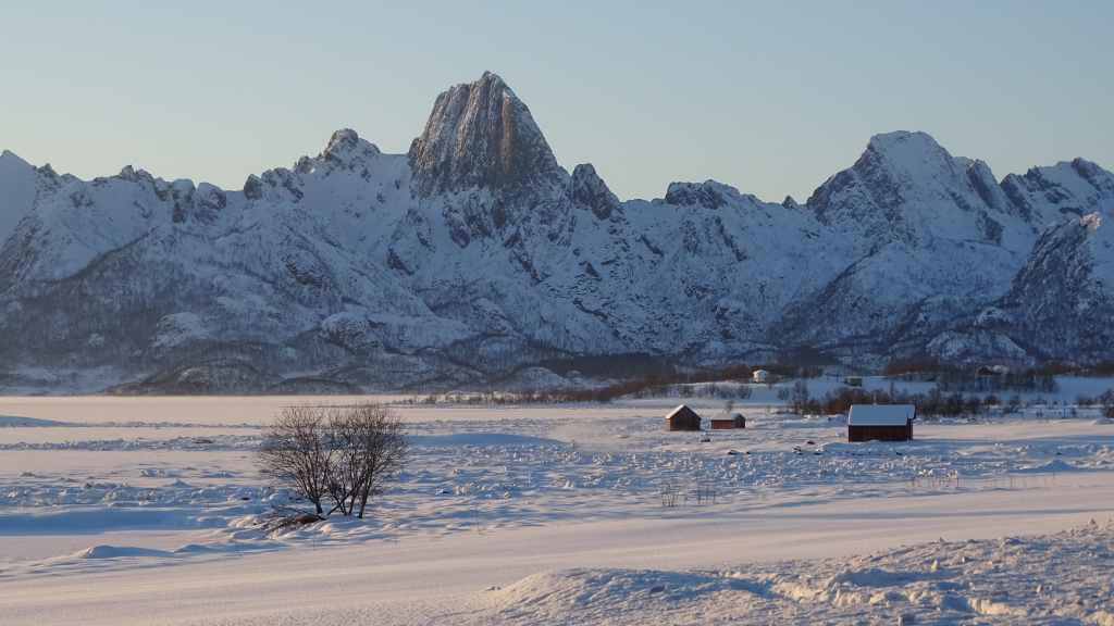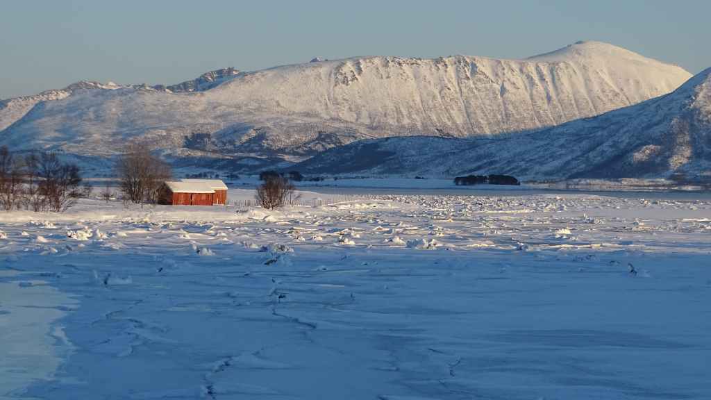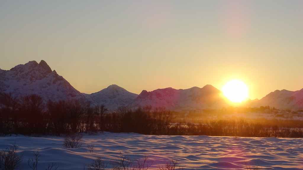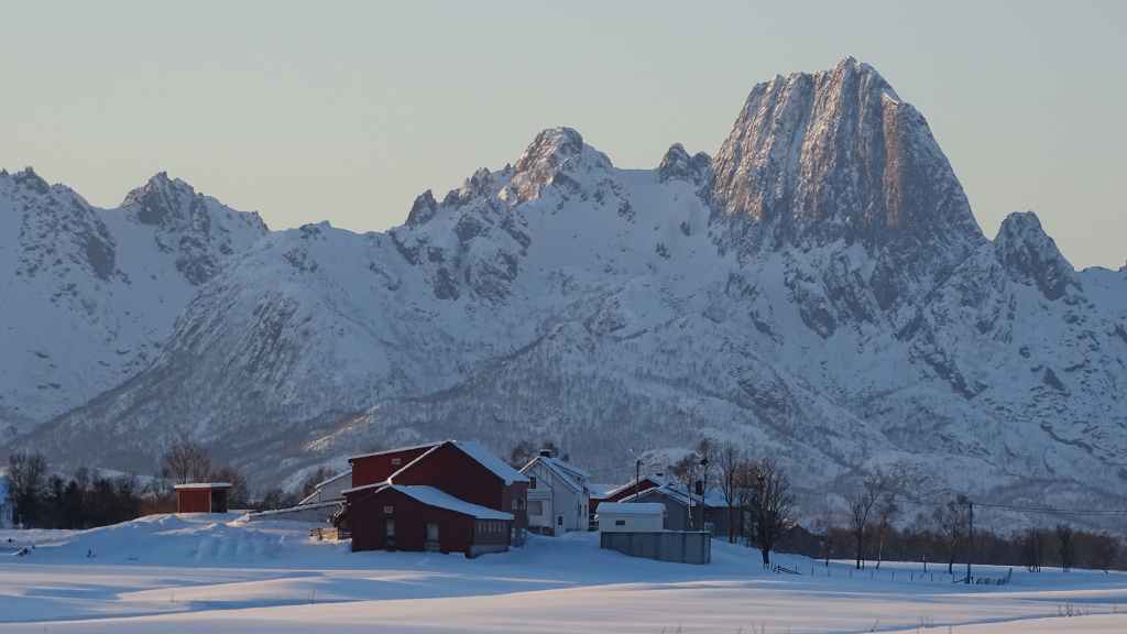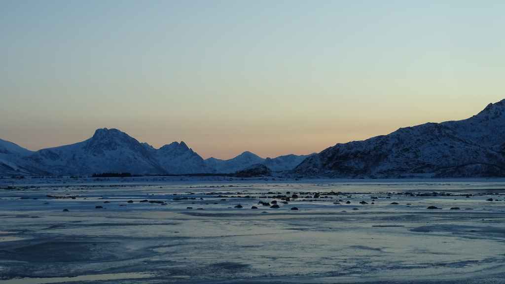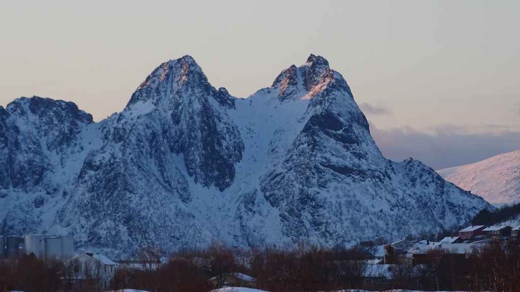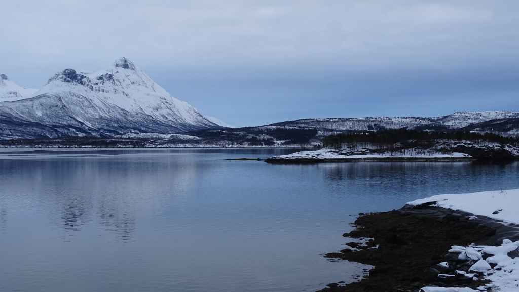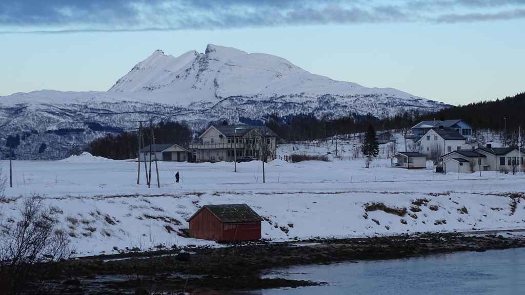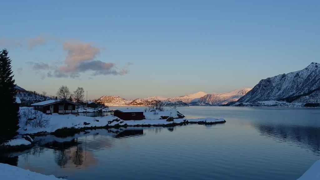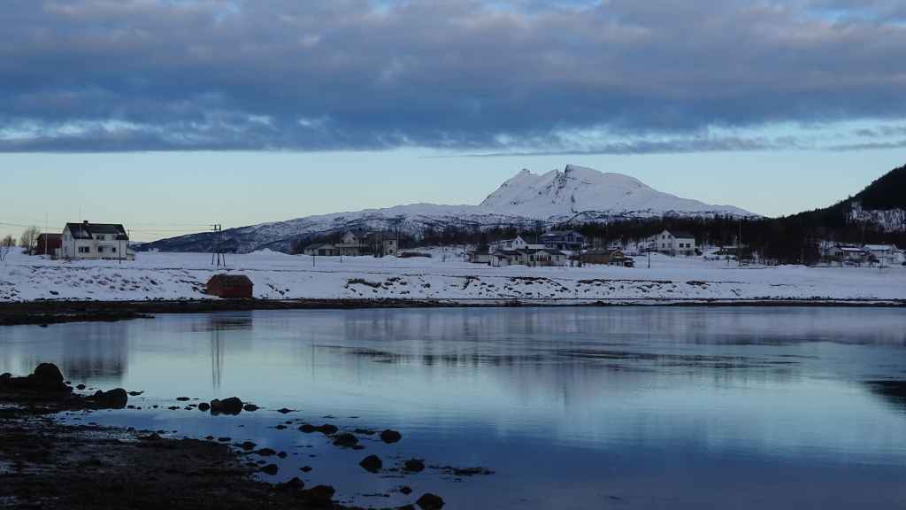 Mais à mesure que nous avançons vers l’ouest, le ciel se charge de nuages et la neige se met à tomber lorsque nous passons un col à au moins… 80 m d’altitude ! Dilemme : doit-on continuer vers les îles Lofoten au risque de ne rien voir où doit-on continuer vers les îles Vesteralen où le ciel à l’air de rester bien bleu ? Le choix est vite fait et à Gullesfjord, nous quittons la N10 pour prendre la N85 en direction de Sortland. Pour arriver dans cette ville, déjà visitée en 2016, on traverse de magnifiques paysages blancs, bleus, orangés, des bancs de brume de froid et des pics de granites grandioses…