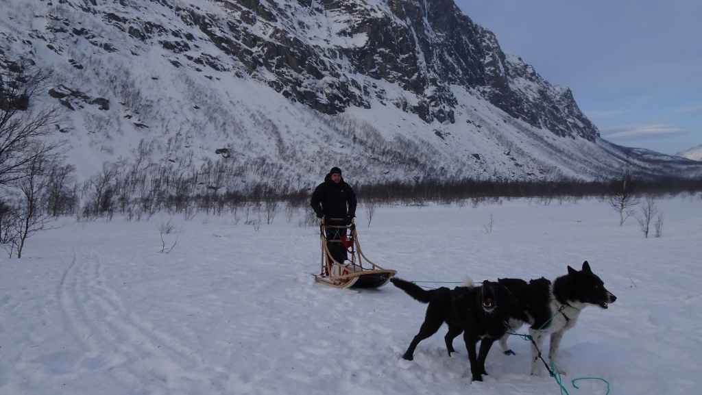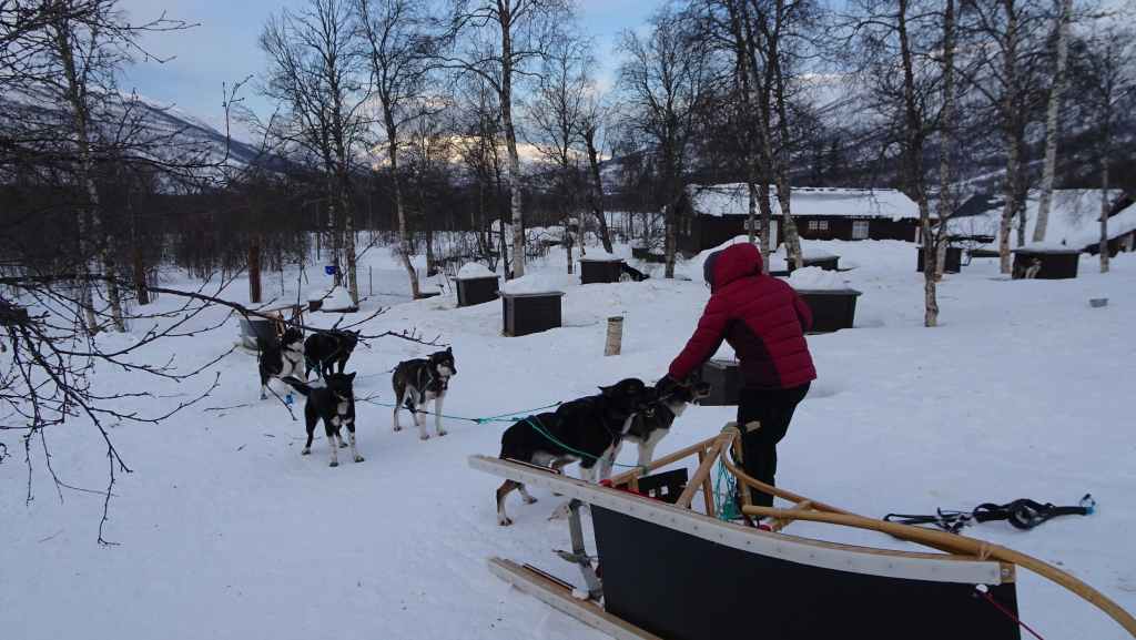 Nous avions réservé depuis la France, une activité de traîneau à chiens à Bones à 68 km et 1h10 de route au NE de Grov. 1h10 mais il faut toujours ajouter du temps supplémentaire pour les routes gelées, malgré les 4 pneus hiver cloutés qui accrochent extrêmement bien à la glace. Nous avons RDV à 10h00 au Bardu Huskylodge… Le patron, Jan, nous redirige vers Daniel, le jeune musher qui va nous guider…