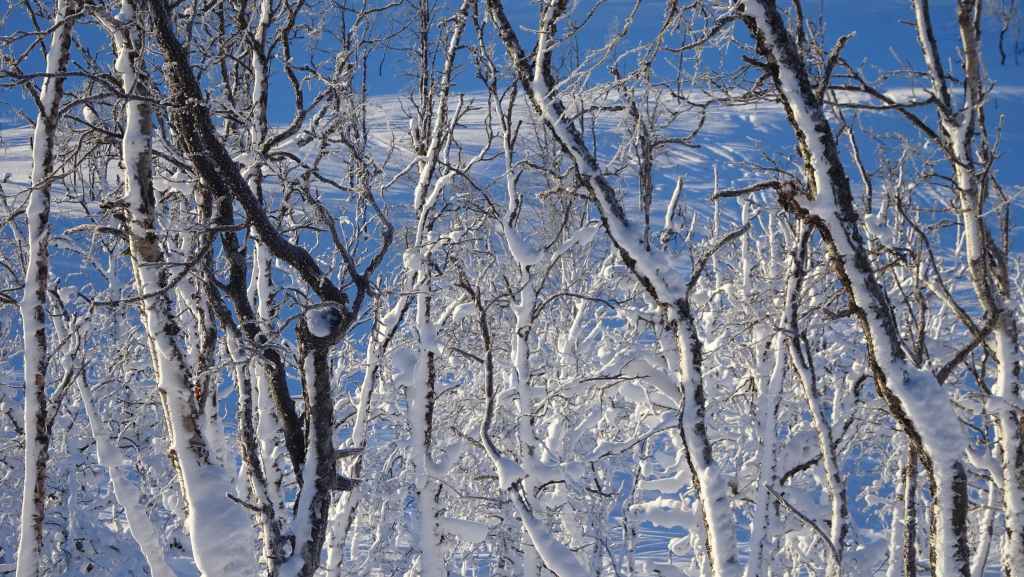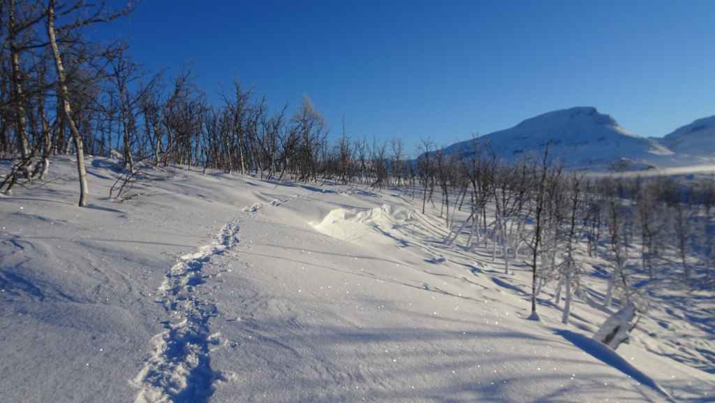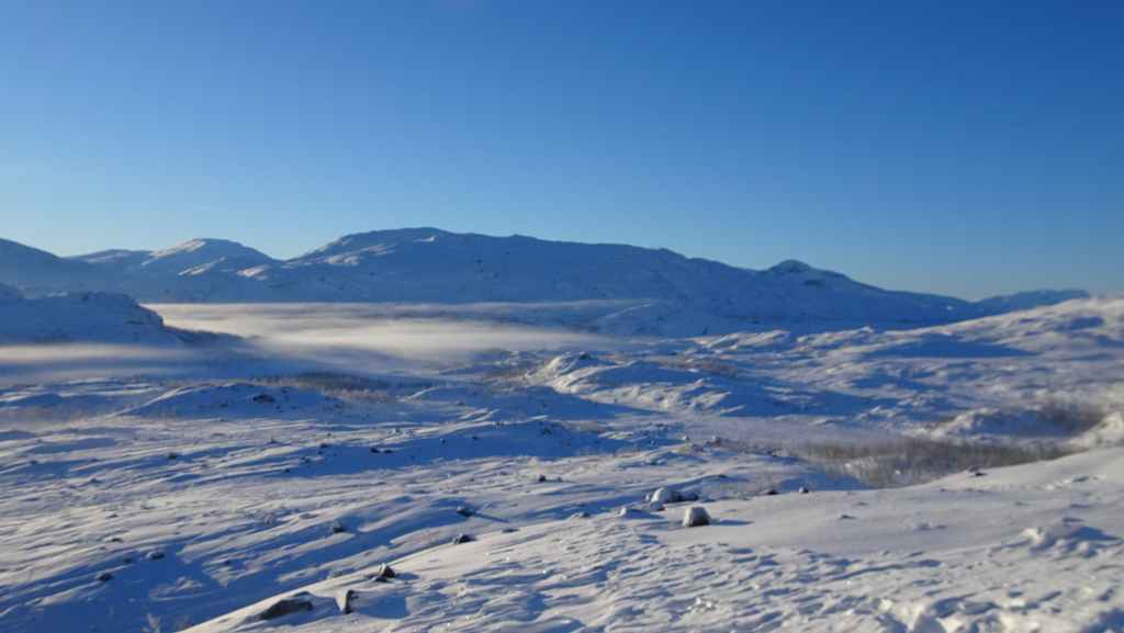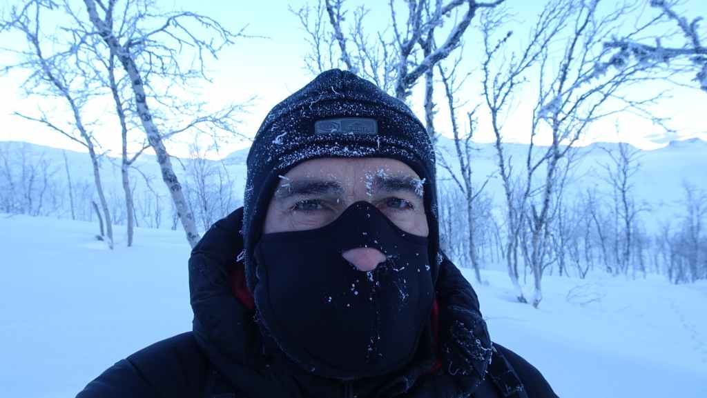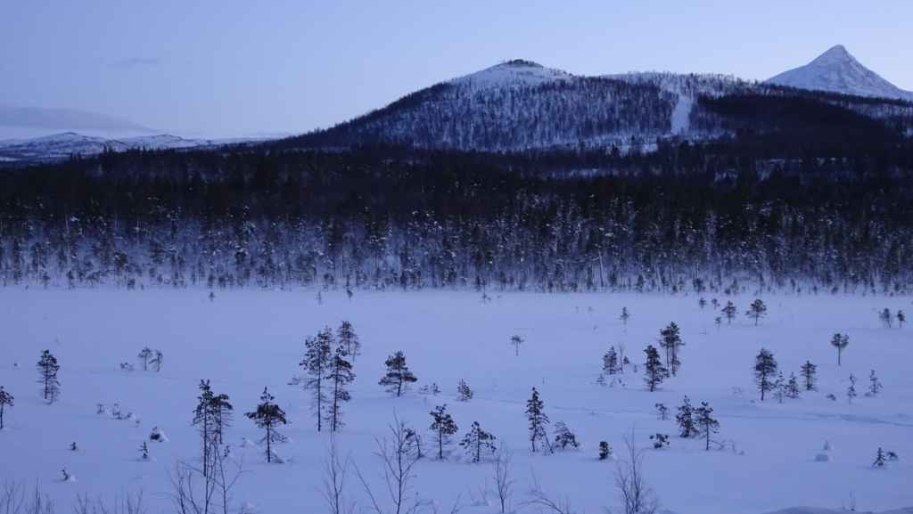 On enfile nos vêtements les plus chauds puis on part vers le nord. En peu de temps, tous les poils non recouverts blanchissent de givre… Nous marchons encore à l’ombre mais les sommets s’éclairent du soleil d’hiver. Les paysages sont assez typiques du pays Sami (Laponie) : lac, marécages, forêt clairsemée de bouleaux, le tout recouverts de neige. En plus du bruit de la fraise à neige maintenant plus lointain, le bruit des motoneiges vient perturber le calme relatif du lieu… C’est en effet le terrain de jeux des touristes locaux ! Je n’ai pas choisi le bon coin pour bénéficier du calme de cette région !