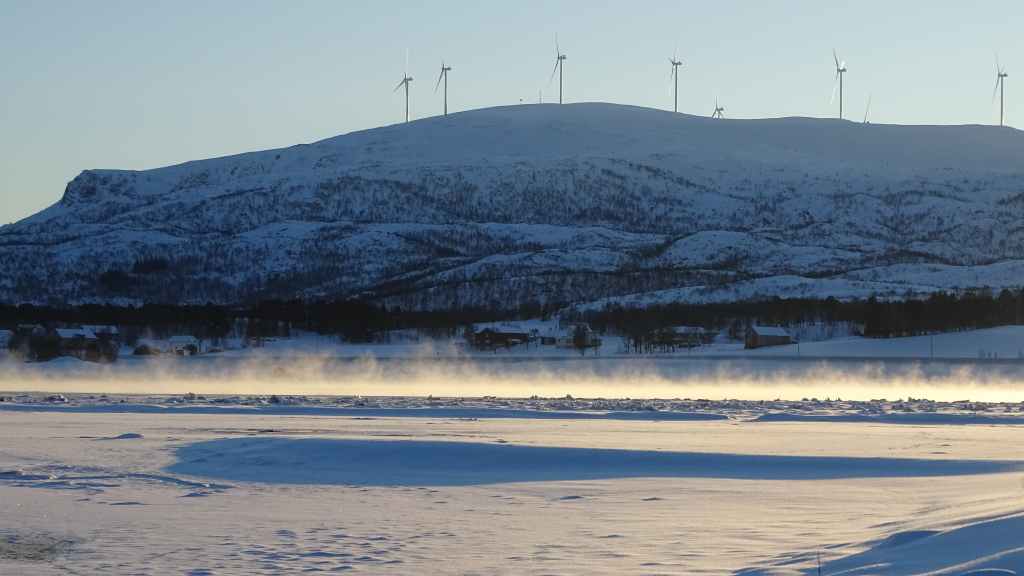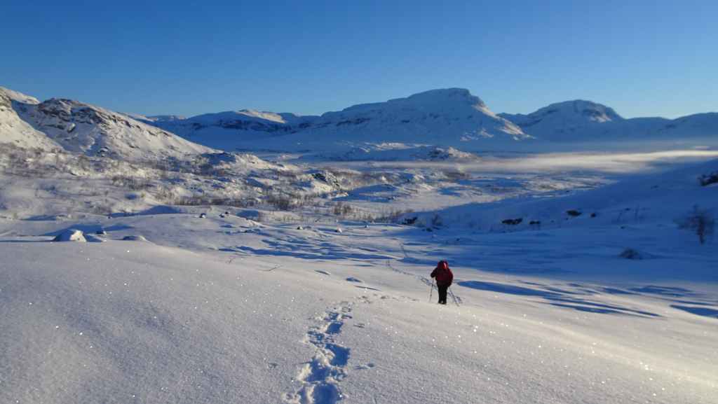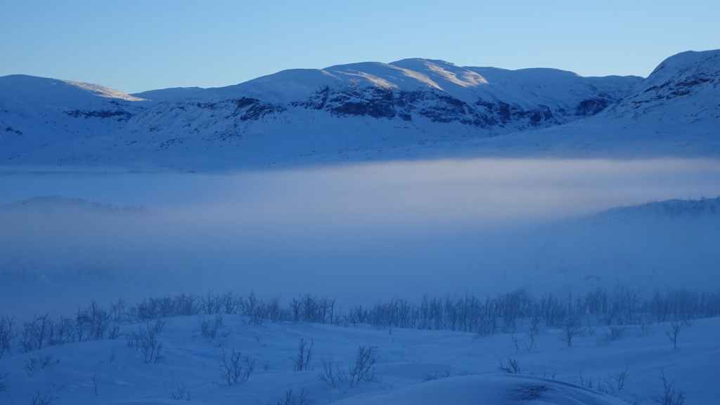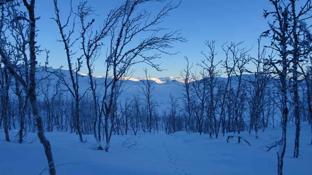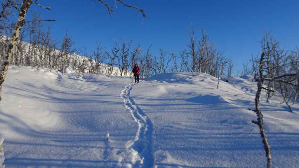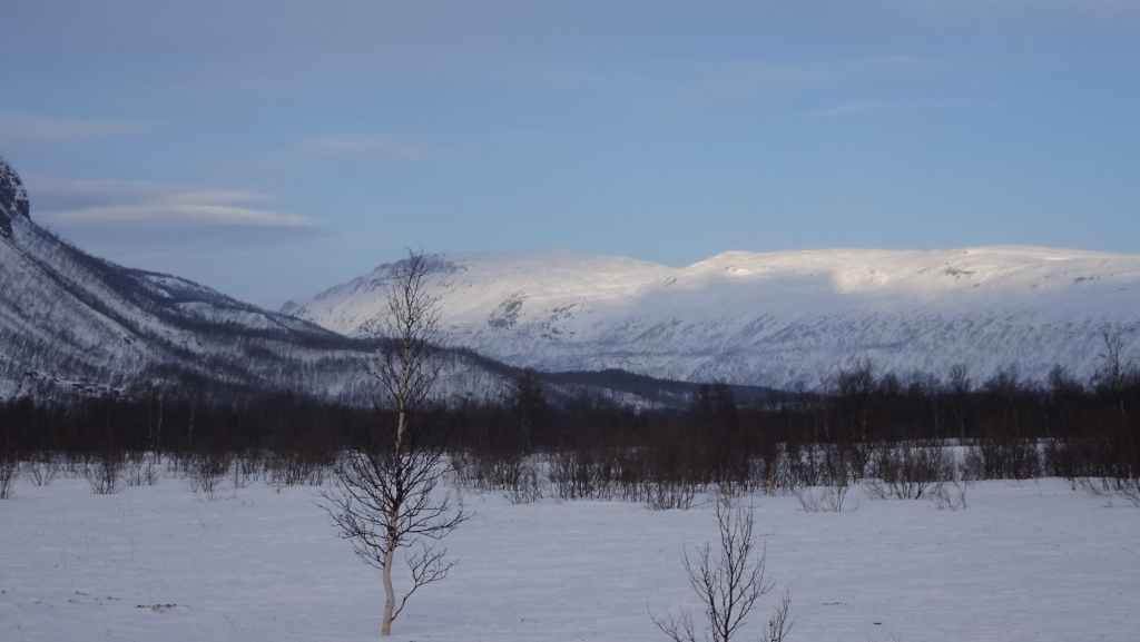 On enfile nos vêtements les plus chauds puis on part vers le nord. En peu de temps, tous les poils non recouverts blanchissent de givre… Nous marchons encore à l’ombre mais les sommets s’éclairent du soleil d’hiver. Les paysages sont assez typiques du pays Sami (Laponie) : lac, marécages, forêt clairsemée de bouleaux, le tout recouverts de neige. En plus du bruit de la fraise à neige maintenant plus lointain, le bruit des motoneiges vient perturber le calme relatif du lieu… C’est en effet le terrain de jeux des touristes locaux ! Je n’ai pas choisi le bon coin pour bénéficier du calme de cette région !