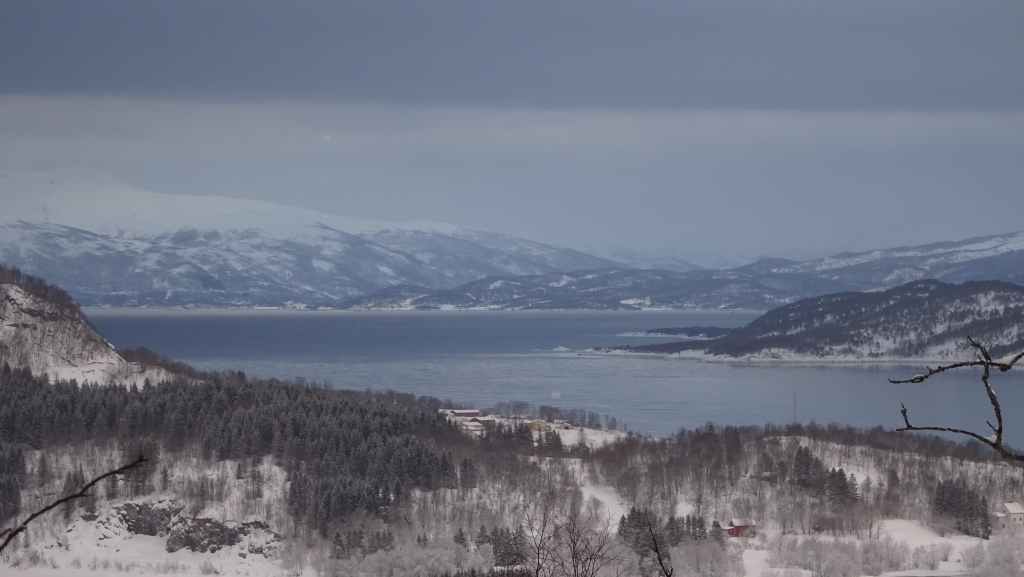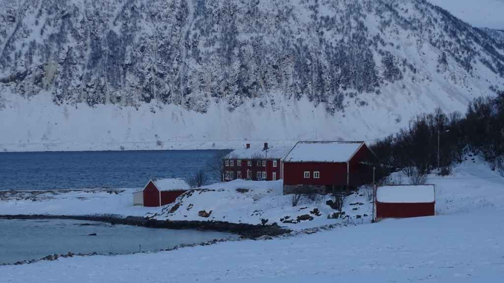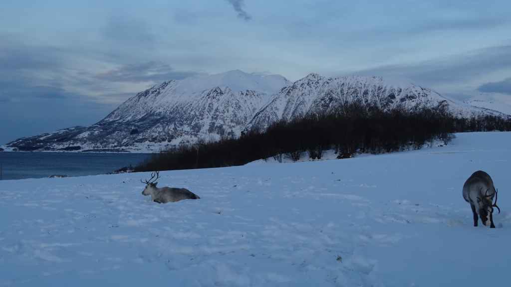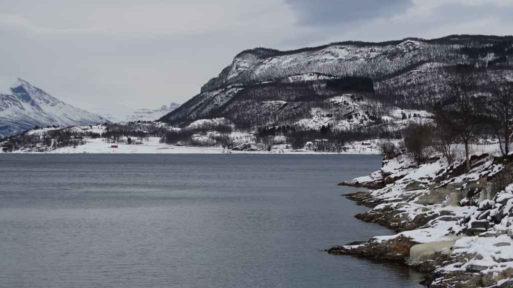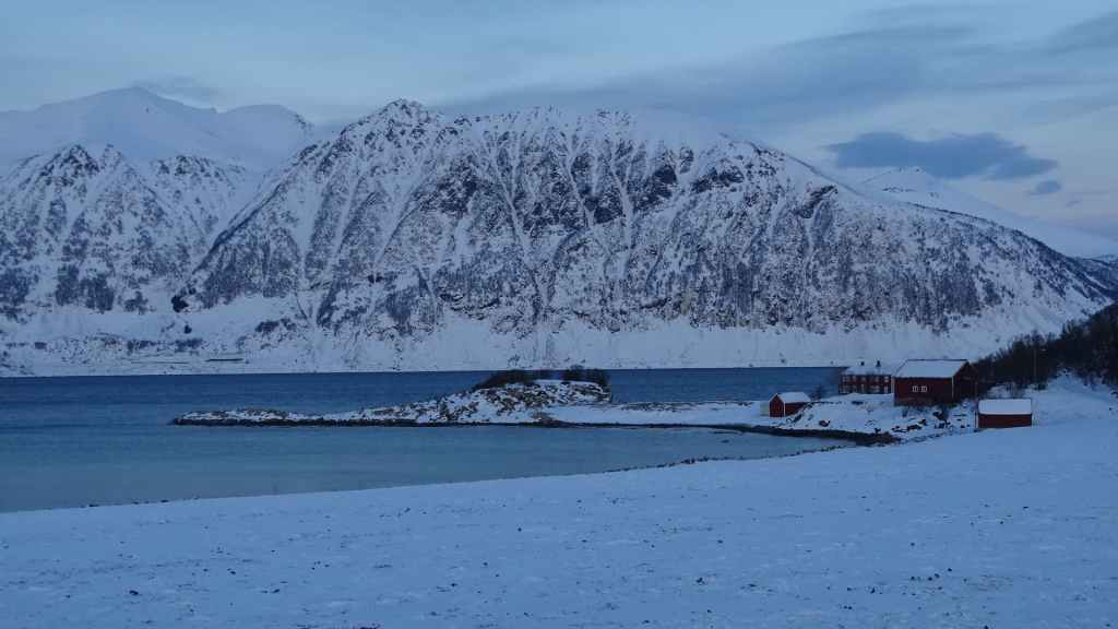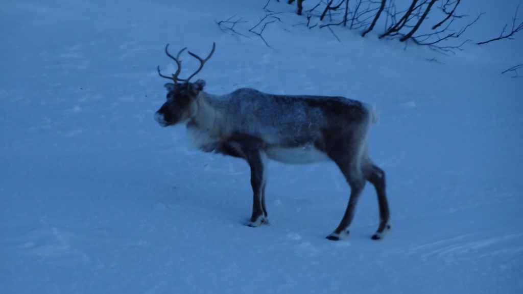 Après le repas, nous reprenons la voiture pour rejoindre le tout petit village de Elgsnes, situé sur une langue de terre à 22 km au NO de la ville. Petite promenade dans la neige pour admirer les paysages de fjord : superbe ! Nous apercevons un couple d’aigles pêcheurs et quelques rennes allongés dans la neige.