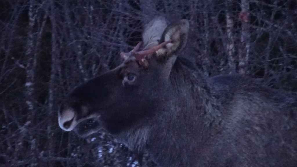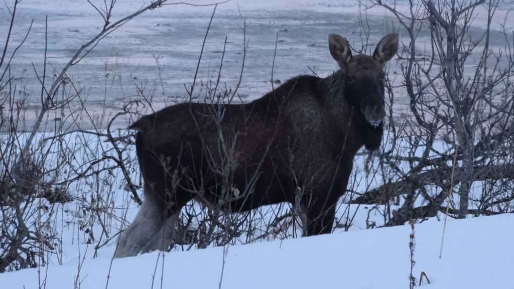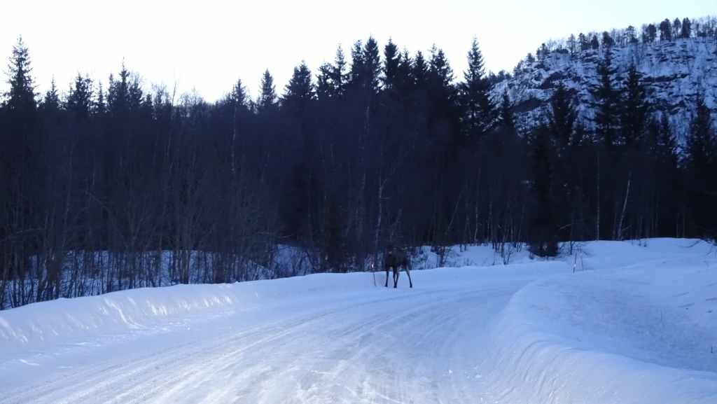 Aujourd’hui la météo nous annonce grand beau temps pour découvrir les îles Lofoten, ses pics majestueux enneigés et ses plages de sable blanc… Comme la route promet d’être longue, on démarre au lever du jour, vers 8h00 et partons plein ouest. Alors que nous longeons un fjord, nous apercevons 2 élans non loin de la route. On s’arrête car ce n’est pas si courant. Ils finissent par se déplacer tranquillement, alors nous leur rendons leur tranquillité… Quelques kilomètres plus loin, c’est un mâle solitaire (sans ses bois tombés à l’automne) qui domine la route… puis encore plus loin, dans un village, c’est une mère et son jeune qui broutent les haies d’une maison. Un troisième élan les rejoint et ils traversent la route devant les voitures pour repartir bien tranquillement dans la forêt ! 6 élans en une cinquantaine de kilomètres, c’est du jamais vu pour nous !
