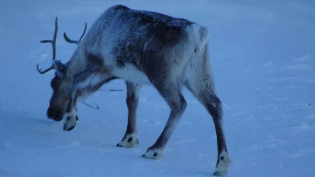 Nous nous rendons donc à Katterjokk, une station de sport d’hiver. Une petite harde de rennes broute comme ils peuvent l’herbe sous la neige.