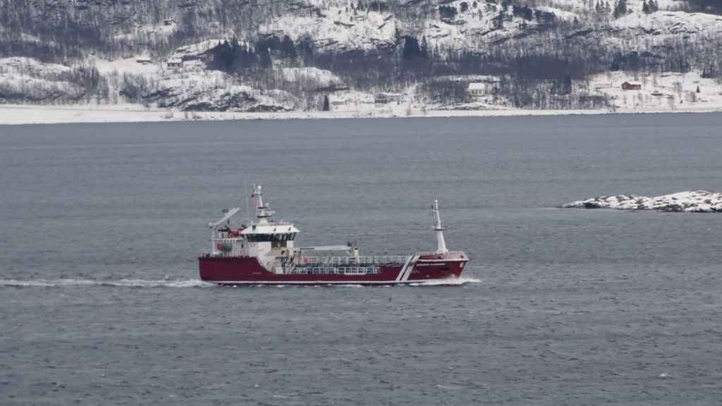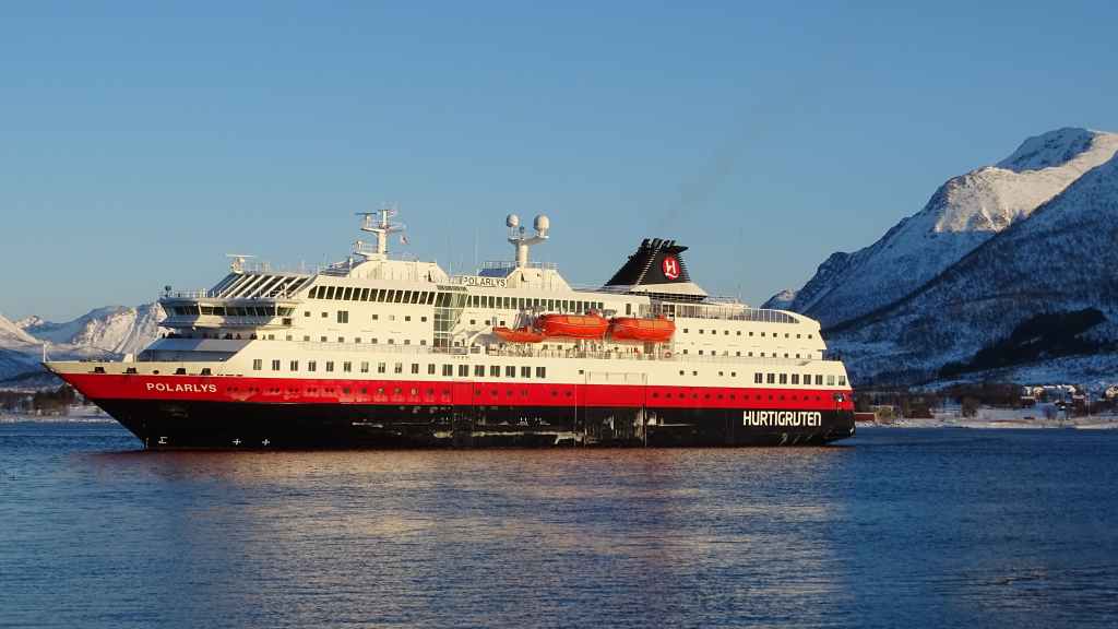 Nous faisons une halte à Sortland pour diverses petites courses, une balade au travers des rues commerçantes et un tour au port où le célèbre ferry Hurtigruten vient accoster : il s’agit d’un paquebot que l’on peut prendre entre Bergen et Kirkenes, non loin de la frontière russe. Il longe toute la côte déchiquetée de Norvège. Un peu plus tard, nous trouvons une petite place au soleil pour pique-niquer… dans la voiture car malgré le soleil, le froid reste vif (-10°C).