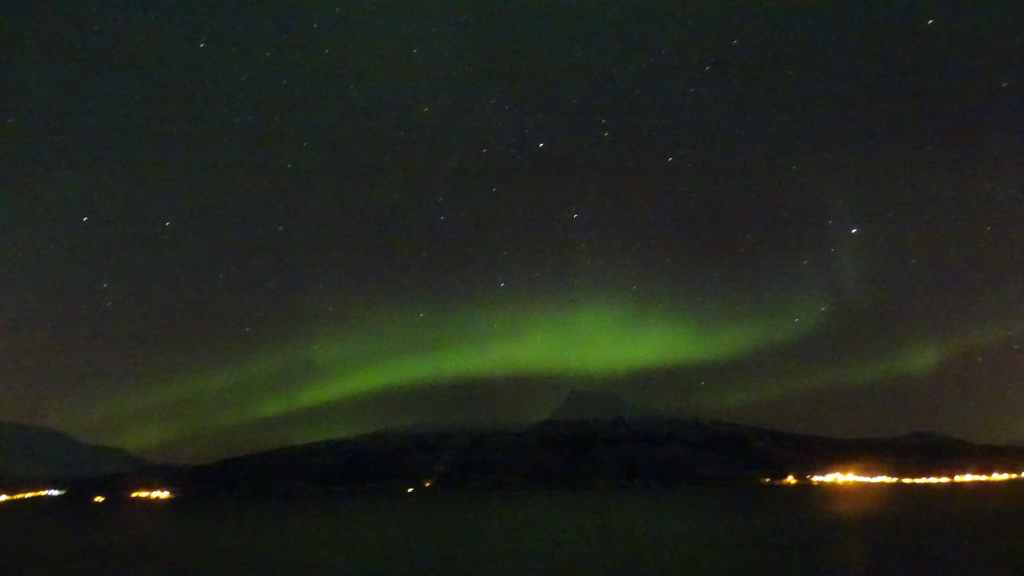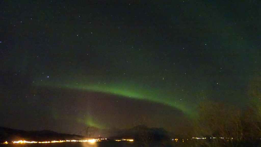 Quand nous rentrons à l’appartement, le ciel est toujours étoilé, alors après le repas, nous repartons à 10 mn de voiture, vers le nord pour espérer voire nos premières aurores boréales… et elles apparaissent… pas vertes comme on les voit toujours en photo où à la TV mais blanches !!! Mon cousin voyageur nous l’avait bien dit mais on pensait qu’il nous charriait… Et bien non, elles ne sont pas vertes et c’est quand même assez décevant, d’autant plus qu’elles ne sont pas très vives. Mais on en aura quand même vu et photographié des vertes !