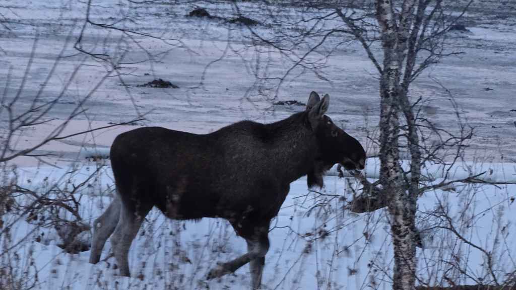 Pour notre deuxième jour de randonnée raquettes, la météo nous annonce une journée sans nuage. Ça tombe bien puisque nous allons nous rendre de l’autre côté de la frontière, en Suède. C’est à 1h30 de route et le froid devrait nous accompagner toute la journée (environ -20°C). Nous avons la chance de voir un élan au bord de la route.