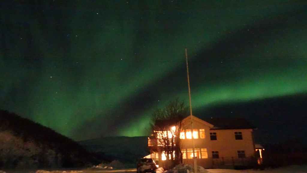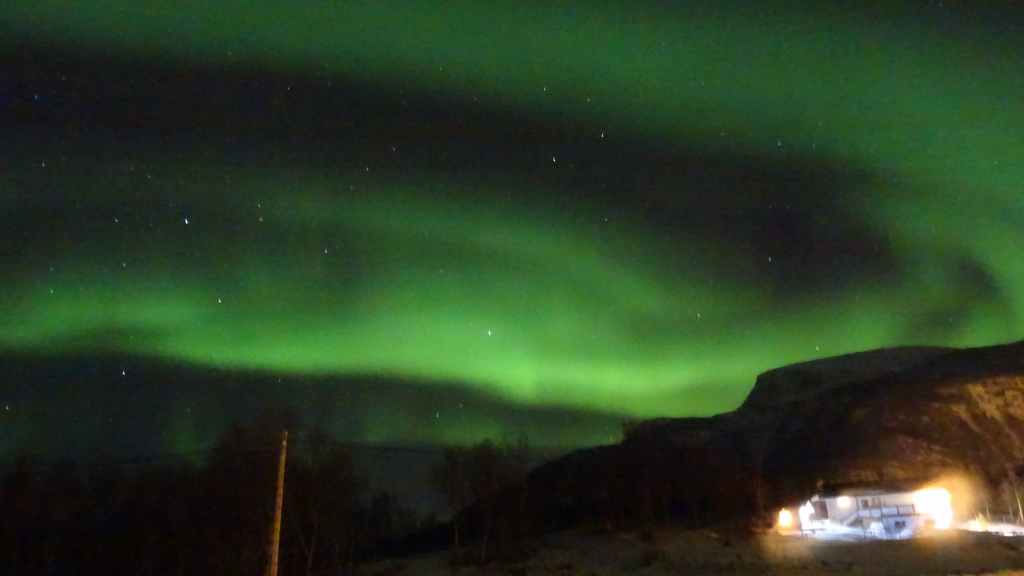 Alors que nous sommes en train de regarder une émission à TV5 Monde, Ralph vient sonner à la porte pour nous avertir que des aurores boréales sont en cours comme d’habitude au nord, derrière la maison. On s’habille, on se chausse rapidement. Je prépare l’appareil photo, déplie le pied et c’est parti. Et là, ça vaut le coup. Elles sont d’une intensité remarquable et une très légère nuance verte donne un peu de couleur à ces aurores qui bougent à vue d’œil… On reste une bonne heure à les observer et à se cailler !
