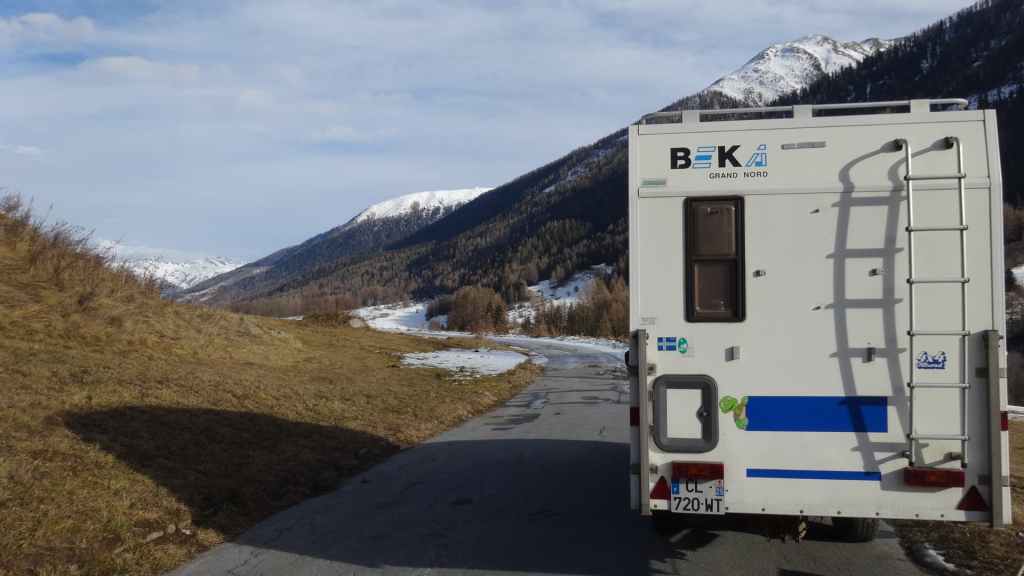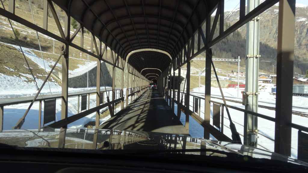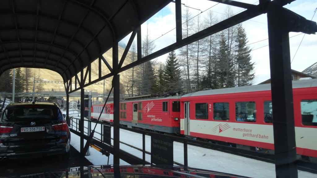 Compte tenu de l’enneigement très mesuré, nous espérions pouvoir franchir le Furkapass à 2431 m d’altitude, mais neige ou pas neige, il était fermé. Nous avons donc pris le train pour traverser la montagne : le wagon n’étant pas très large, il a fallu bien viser le milieu pour ne pas frotter les angles de la cellule sur le toit du Wagon ! Mais l’expérience est sympathique… 33 CHF (30 €) pour 15 mn de train…(http://www.matterhorngotthardbahn.ch/fr/offres/chargement_de_voiture/furka/Pages/default.aspx).