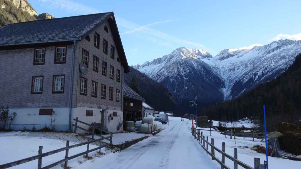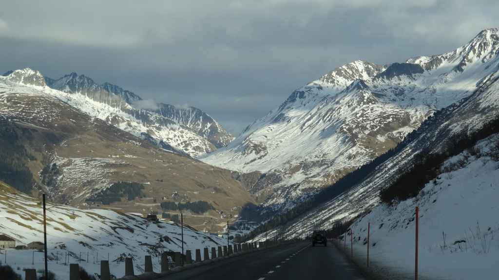 Il a un peu neigé dans la nuit et une fine couche de neige humide recouvre les voitures mais le ciel est redevenu bien bleu malgré quelques nuages d’humidité qui recouvrent encore quelques crêtes enneigées. La vue sur les glaciers du bout de vallée est magnifique : il s’agit des glaciers de l’Urner Alpen avec des sommets qui culminent aux alentours de 3500 m. Après cette excellente nuit, nous repartons assez tardivement vers 9h30, toujours vers le nord.