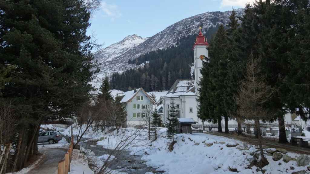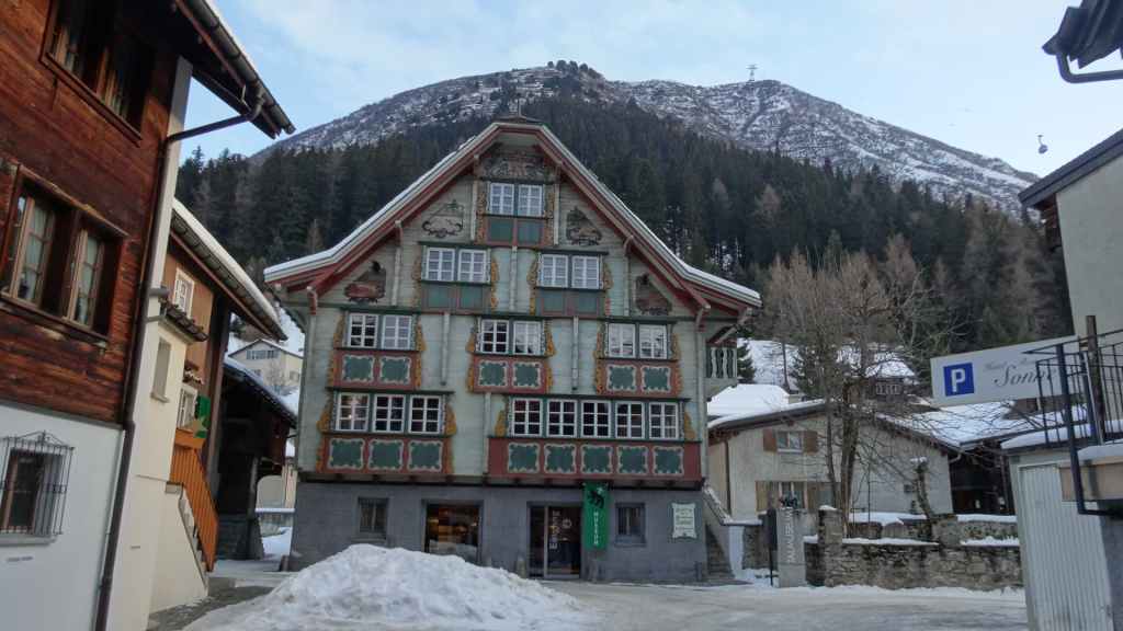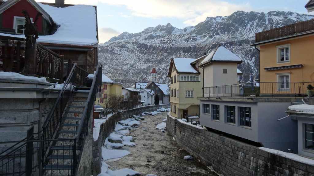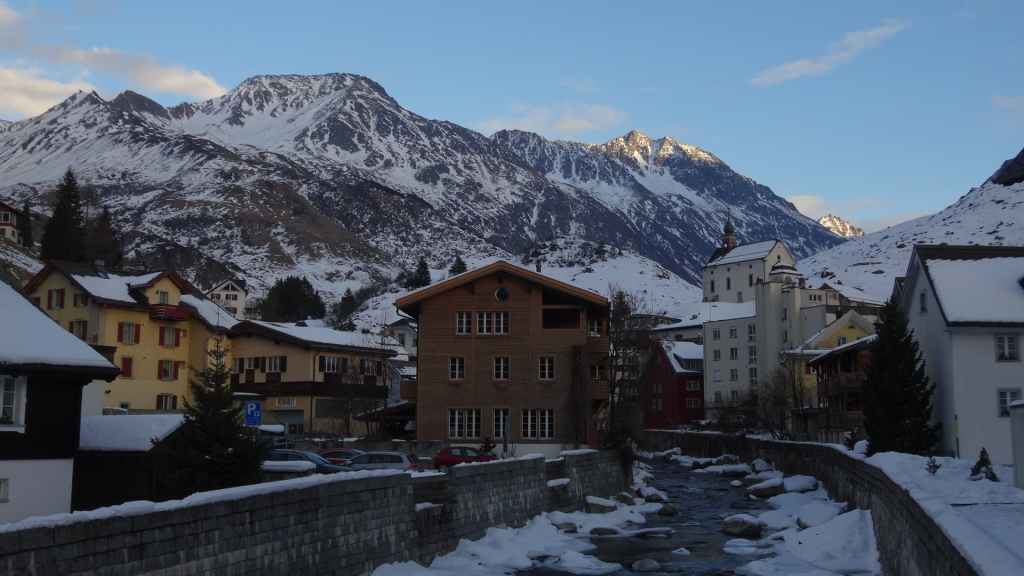 Nous arrivons à Andermatt, station de sports d’hiver assez chic. Nous visitons cette jolie bourgade et en profitons pour nous renseigner sur le prochain col à passer, l’Oberalp qui pointe à 2048 m. Malheureusement, celui-ci est également fermé mais un train permet aussi de s’en affranchir… Mais le trajet dure 45 mn et le tarif va de paire : 65 CHF. Ce col nous permet de gagner le canton des Grisons. Nous avons prévu de randonner mais le prix de la traversée nous en dissuade.