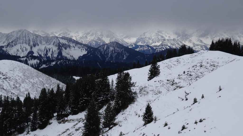 9h15 : nous partons pour une petite randonnée de 3 bonnes heures jusqu’au sommet nommé Hohe Kugel à 1645 m. Nous y trouvons la neige et surtout la glace ce qui ne facilite pas la progression. Mais au sommet, c’est la récompense : malgré le ciel chargé, la vue est splendide !
