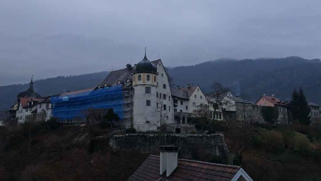 Nous apercevons à peine le château princier sous l’épaisse couche nuageuse et dans la nuit qui tombe, alors nous franchissons la frontière autrichienne. Le gaz-oïl est au même tarif qu’en France… avant l’augmentation des taxes ! Puis dans un brouillard très épais, nous grimpons par une route étroite dans les hauteurs de Fraxern, un petit village au-dessus de Feldkirch. Nous stationnons pour la nuit sur un parking près du stade.