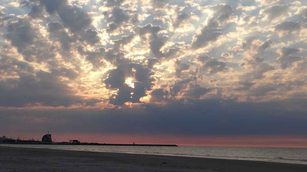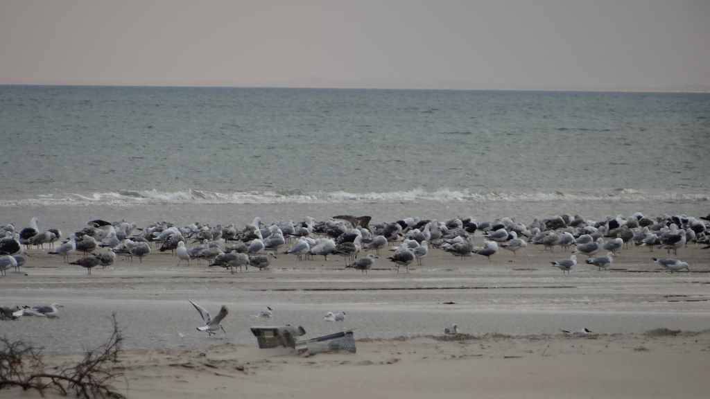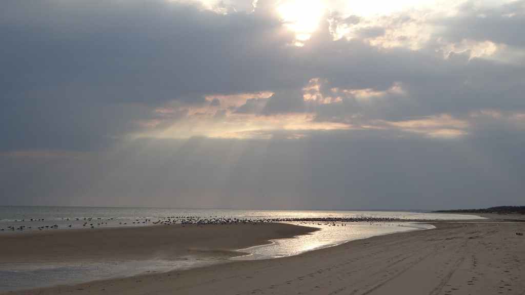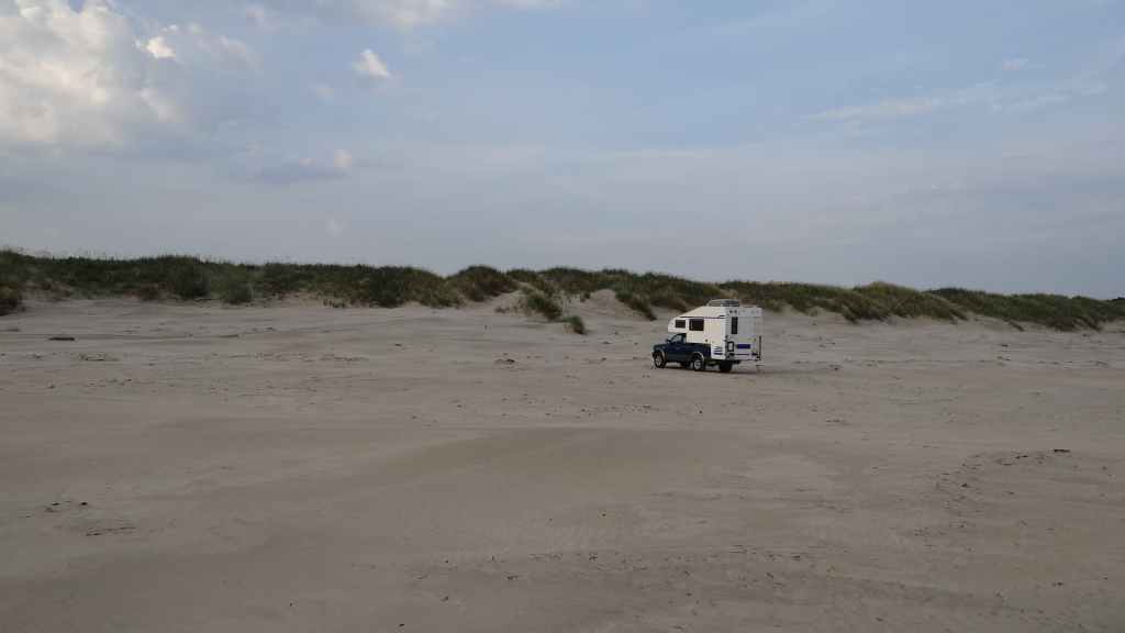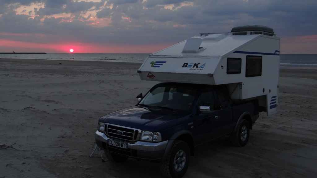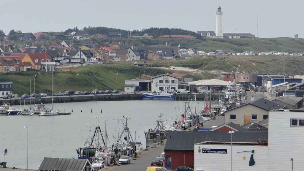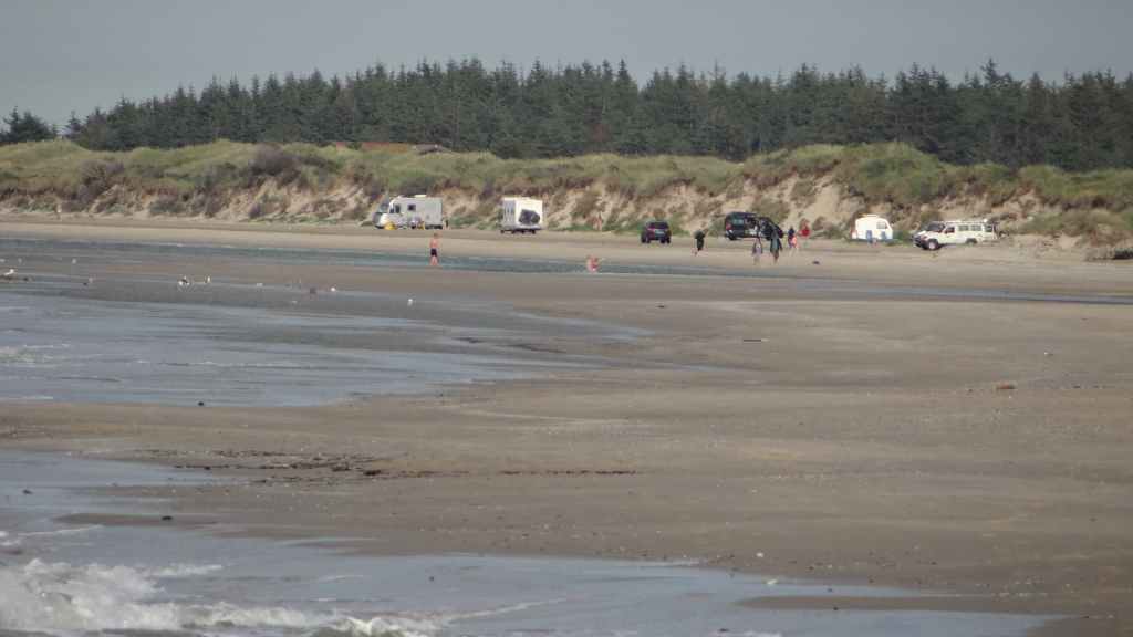 Départ à peu près à la même heure que la veille. On rejoint l’autoroute et nous retrouvons à nouveau les travaux et les ralentissements qu’ils engendrent. On passe Hambourg sans trop de problème mais ensuite les chantiers titanesques de Mme Merkel s’allongent : ça roule 5 km et ensuite travaux sur 10 km, et ça se répète… Vers l’extrême nord de l’Allemagne, les travaux disparaissent. Nous passons la frontière danoise vers 14 heures et continuons toujours vers le nord. La route est encore longue et enfin vers 18h00, nous arrivons à l’entrée de la ville tant convoitée ! Un dernier plein de gas-oil avant de rejoindre la proximité de l’embarcadère de Smyril Line. J’avais prévu de dormir sur la plage, alors nous allons, à pied, repérer les lieux. Le ciel est en train de se couvrir, mais le soleil est encore un peu présent sur la plage. L’endroit est splendide, entre dunes et mer du Nord. Mouettes et goélands pataugent sur le bord de mer. Apéro et repas, vaisselle et coucher de soleil agrémentent la soirée. (GPS : N57°35.221: E 10°00.404)