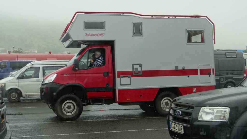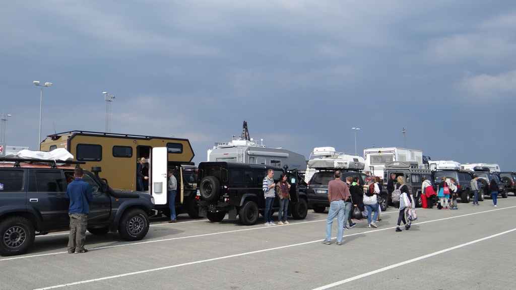 Comme l’embarquement commence à 9h pour un départ prévu à 11h30, nous avons prévu de nous lever à 7h. A 5 h, nous avons été réveillés par la pluie et le vent, mais à 7h, un rayon de soleil éclaire notre emplacement. Après le petit déjeuner, nous préparons nos sacs à dos pour emmener nos affaires pour les 2 jours et 2 nuits de navigation : vêtements, livres, trousse de toilette, appareil-photo, 2 repas et ses boissons, ce qui fait 2 beaux sacs bien lourds. J’enlève l’échelle pour ne pas dépasser les 6 mètres de long et à 8h30, nous rejoignons les parkings à CC. On nous parque avec eux mais surtout avec de nombreux 4×4, équipés ou non de cellules : c’est un vrai salon de véhicules d’aventure ! Nous retrouvons un groupe de doubistes des Fourgs, mais aussi saint-claudiens et hauts savoyards. Ca commence à bouger vers 9h30.