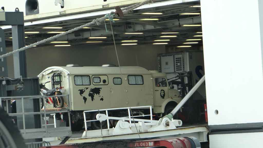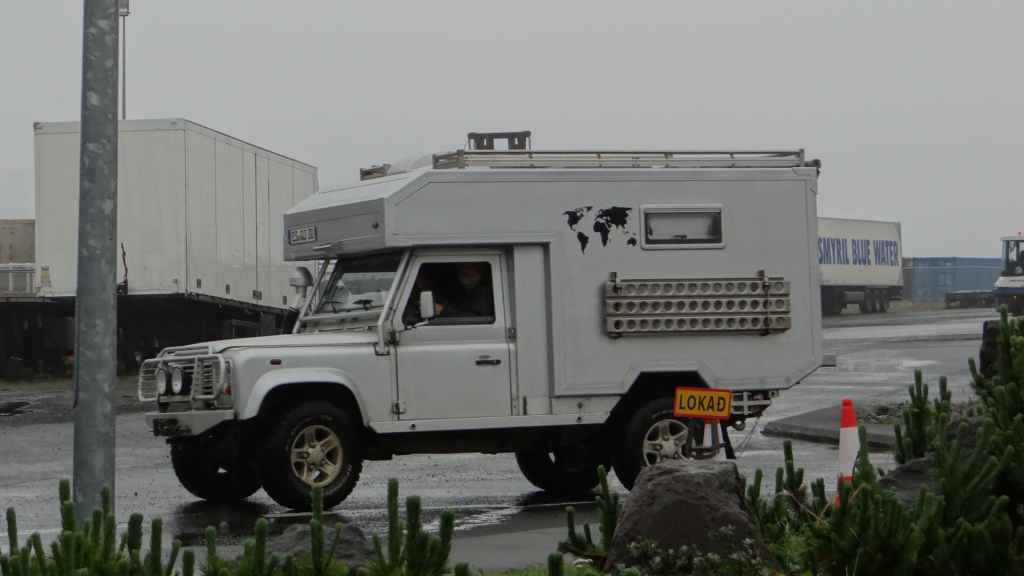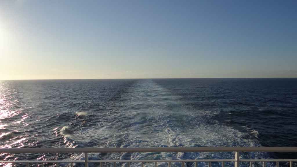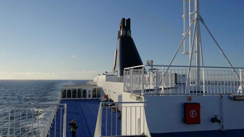 On avance sur le véritable quai d’embarquement et là, c’est un bisontin qui vient à notre rencontre pour taper la discute. Lui est équipé d’un Toyota avec cellule intégrée faite sur mesure : ça doit coûter cher, mais c’est beau ! Vers 10h30, on embarque sur le navire. Maintenant, il s’agit de s’occuper et ça va être long, long, très long.… sieste, lecture et mots fléchés sont nos fidèles compagnons !