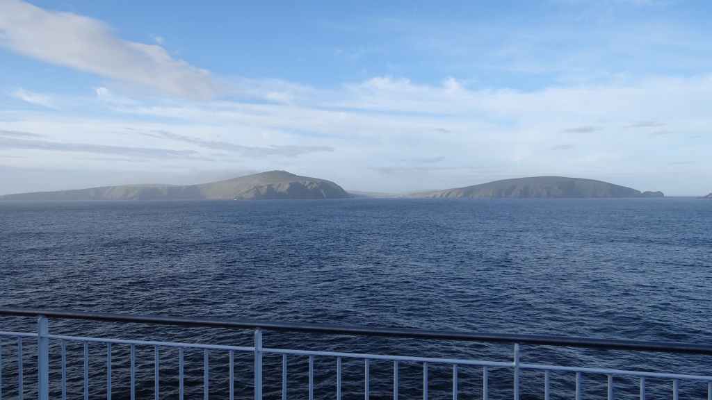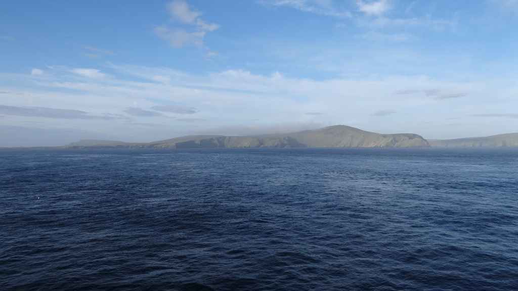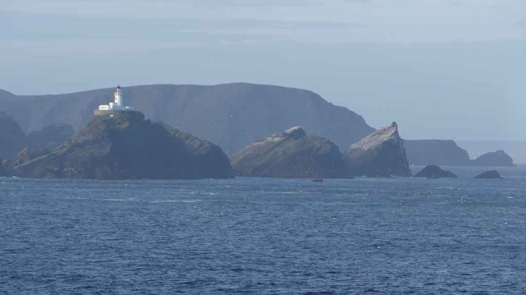 Après une bonne nuit réparatrice pour nous 2, Sylvie me sort de mon sommeil à 6h45 : terre en vue ! Il s’agit des îles Shetland au large de l’écosse. Le soleil éclaire les côtes.